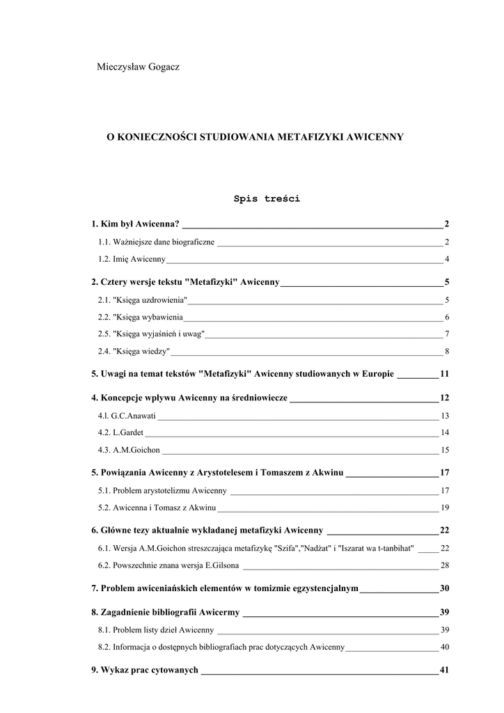 6. Główne tezy aktualnie wykładanej metafizyki Awicenny ________________________ 22
