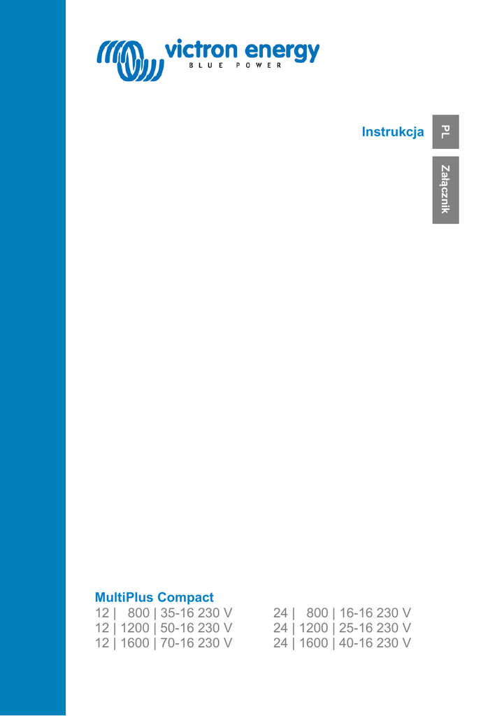 PL Instrukcja Załącznik MultiPlus Compact 12 | 800 | 35-16 230 V 12 | 1200 | 50-16 230 V 12 | 1600 | 70-16 230 V 24 | 800 | 16-16 230 V 24 | 1200 | 25-16 230 V 24 | 1600 | 40-16 230 V Copyrights 2008 Victron Energy B.V. Wszelkie prawa zastrzeżone Niniejsza publikacja ani żadna jej część nie może być reprodukowana w żadnej formie, żadną metodą oraz do żadnych celów. W sprawie warunków korzystania oraz pozwolenia na korzystanie z tej instrukcji w celu opublikowania w języku innym niż angielski prosimy o kontakt z Victron Energy B.V. DLA TYCH PRODUKTÓW VICTRON ENERGY FIRMA VICTRON ENERGY B.V. NIE UDZIELA ŻADNEJ GWARANCJI, WYRAŹNEJ ANI DOROZUMIANEJ, W TYM ŻADNEJ DOROZUMIANEJ GWARANCJI POKUPNOŚCI LUB PRZYDATNOŚCI PRODUKTU DO KONKRETNEGO CELU, ORAZ DOSTARCZA TE PRODUKTY VICTRON ENERGY WYŁĄCZNIE W STANIE, W JAKIM SIĘ ZNAJDUJĄ. BEZ WZGLĘDU NA OKOLICZNOŚCI FIRMA VICTRON ENERGY B.V NIE BĘDZIE ODPOWIADAĆ PRZED NIKIM ZA SZKODY SZCZEGÓLNE, UBOCZNE, PRZYPADKOWE LUB WTÓRNE ZWIĄZANE Z ZAKUPEM LUB UŻYTKOWANIEM TYCH PRODUKTÓW VICTRON ENERGY. WYŁĄCZNA ODPOWIEDZIALNOŚĆ FIRMY VICTRON ENERGY B.V., NIEZALEŻNIE OD FORMY DZIAŁANIA, NIE MOŻE PRZEKROCZYĆ CENY ZAKUPU OPISANYCH TU PRODUKTÓW VICTRON ENERGY. Firma Victron Energy B.V. zastrzega sobie prawo do wprowadzania zmian i ulepszania swoich produktów według własnego uznania. Niniejsza publikacja opisuje stan tego produktu w chwili jej opublikowania i może nie odzwierciedlać stanu produktu w dowolnym czasie w przyszłości. PL 1. INFORMACJE DOTYCZĄCE BEZPIECZEŃSTWA Informacje ogólne Załącznik Przed rozpoczęciem korzystania z tego urządzenia należy zapoznać się z charakterystyką i instrukcją bezpieczeństwa zawartą w dokumentacji dostarczonej z tym produktem. Niniejszy produkt został zaprojektowany i przebadany zgodnie z normami międzynarodowymi. Urządzenie może być wykorzystywane wyłącznie do celów zgodnych z jego przeznaczeniem. OSTRZEŻENIE: RYZYKO PORAŻENIA PRĄDEM Produkt jest wykorzystywany w połączeniu z trwałym źródłem energii (akumulatorem). Zaciski wejścia i/lub wyjścia mogą być pod niebezpiecznym napięciem, nawet kiedy urządzenie jest wyłączone. Zawsze wyłączaj źródło zasilania prądem przemiennym oraz akumulator przed rozpoczęciem konserwacji lub serwisowania produktu. Produkt nie zawiera żadnych podzespołów wewnętrznych serwisowanych przez użytkownika. Nie zdejmuj przedniej płyty ani nie obsługuj produktu po zdjęciu jakichkolwiek osłon. Wszelkie czynności serwisowe muszą być wykonywane przez wykwalifikowany personel. Nigdy nie używaj produktu w miejscach, w których istnieje ryzyko wybuchu gazu lub pyłu. Zapoznaj się z informacjami dostarczonymi przez producenta akumulatora, aby upewnić się, że ten produkt może być używany w połączeniu z danym akumulatorem. Zawsze przestrzegaj instrukcji bezpieczeństwa dostarczonych przez producenta akumulatora. OSTRZEŻENIE: Nie podnoś dużych ładunków bez pomocy. Instalacja Zanim zainstalujesz urządzenie, przeczytaj instrukcję instalacji zamieszczoną w podręczniku instalacji. To jest produkt I klasy bezpieczeństwa (dostarczany z zaciskiem uziemienia ochronnego). Bezprzerwowe uziemienie ochronne musi być zapewnione na zaciskach wejścia i/lub wyjścia prądu przemiennego. Ewentualnie można wykorzystać punkt uziemienia znajdujący się na zewnątrz produktu. Zawsze gdy uziemienie ochronne mogło zostać uszkodzone, koniecznie trzeba wyłączyć urządzenie i zabezpieczyć je przed nieumyślnym użyciem oraz skontaktować się z wykwalifikowanymi serwisantami. Upewnij się, że kable wejścia prądu stałego i prądu przemiennego są wyposażone w bezpieczniki i wyłączniki. Nigdy nie wymieniaj podzespołów zapewniających bezpieczeństwo na podzespoły innego typu. Właściwe podzespoły są wyszczególnione w instrukcji obsługi. Przed podłączeniem prądu upewnij się, że dostępne źródła prądu są zgodne z ustawieniami konfiguracji produktu opisanymi w instrukcji. 1 Upewnij się, że urządzenie jest użytkowane w odpowiednich warunkach otoczenia. Nigdy nie korzystaj z produktu w wilgotnym lub zakurzonym otoczeniu. Zapewnij wokół produktu odpowiednio dużo miejsca na wentylację i sprawdź, czy otwory wentylacyjne nie są zablokowane. Upewnij się, czy wymagane napięcie systemu nie przekracza możliwości produktu. Transport i przechowywanie Przed przechowywaniem lub transportem produktu upewnij się, że przewody zasilania sieciowego i akumulatora zostały odłączone. Firma nie ponosi odpowiedzialności za żadne szkody powstałe podczas transportu, jeśli urządzenie jest przesyłane w nieoryginalnym opakowaniu. Przechowuj produkt w suchym miejscu w temperaturze od -20°C do +60°C. Informacje na temat transportu, przechowywania, ładowania, ponownego ładowania i pozbywania się akumulatora znajdują się w instrukcji dostarczonej przez producenta akumulatora. 2 PL 2. OPIS 2.1 Informacje ogólne Załącznik Multi-funcjonalność MultiPlus Compact Urządzenie MultiPlus Compact zawdzięcza swoją nazwę licznym funkcjom, które może wykonywać. W pojedynczej, kompaktowej obudowie połączono wydajny inwerter sinusoidalny, zaawansowaną technicznie ładowarkę akumulatorów wyposażoną w technologię ładowania adaptacyjnego oraz szybki przełącznik samoczynnego załączania rezerwy prądu przemiennego. Poza tymi podstawowymi funkcjami MultiPlus Compact dysponuje kilkoma zaawansowanymi funkcjami, dzięki którym zyskuje wiele nowych zastosowań opisanych poniżej. Bezprzerwowe zasilanie prądem przemiennym W momencie awarii sieci lub odłączenia agregatu albo nabrzeżnego źródła zasilania samoczynnie włącza się inwerter w urządzeniu MultiPlus Compact, przejmując funkcję zasilania podłączonych odbiorników prądu. Dzieje się to tak szybko (w ciągu mniej niż 20 milisekund), że komputery i inny sprzęt elektroniczny mogą działać dalej bez zakłóceń. Działa