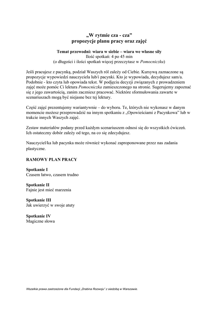 „W rytmie cza - cza” propozycje planu pracy oraz zajęć Temat przewodni: wiara w siebie – wiara we własne siły Ilość spotkań: 4 po 45 min (o długości i ilości spotkań więcej przeczytasz w Pomocniczku) Jeśli pracujesz z pacynką, podział Waszych ról zależy od Ciebie. Kursywą zaznaczone są propozycje wypowiedzi nauczyciela lub/i pacynki. Kto je wypowiada, decydujesz sam/a. Podobnie - kto czyta lub opowiada tekst. W podjęciu decyzji związanych z prowadzeniem zajęć może pomóc Ci lektura Pomocniczka zamieszczonego na stronie. Sugerujemy zapoznać się z jego zawartością, zanim zaczniesz pracować. Niektóre sformułowania zawarte w scenariuszach mogą być niejasne bez tej lektury. Część zajęć prezentujemy wariantywnie – do wyboru. Te, których nie wykonasz w danym momencie możesz przeprowadzić na innym spotkaniu z „Opowieściami z Pacynkowa” lub w trakcie innych Waszych zajęć. Zestaw materiałów podany przed każdym scenariuszem odnosi się do wszystkich ćwiczeń. Ich ostateczny dobór zależy od tego, na co się zdecydujesz. Nauczyciel/ka lub pacynka może również wykonać zaproponowane przez nas zadania plastyczne. RAMOWY PLAN PRACY Spotkanie I Czasem łatwo, czasem trudno Spotkanie II Fajnie jest mieć marzenia Spotkanie III Jak uwierzyć w swoje atuty Spotkanie IV Magiczne słowa Wszelkie prawa zastrzeżone dla Fundacji „Drabina Rozwoju” z siedzibą w Warszawie. SZCZEGÓŁOWY PLAN PRACY Spotkanie I Czasem łatwo, czasem trudno TEKST Ø Monika Staniszewska „W rytmie cza – cza” dostępny w panelu. MATERIAŁY – ich ostateczny dobór uzależniony jest od wyboru ćwiczenia: Ø kredki Ø papier do rysowania w formacie A5 lub jeszcze mniejsze dla każdego dziecka Propozycja planu zajęć: 1. Ćwiczenie wstępne, rytuał rozpoczęcia lub pytanie o samopoczucie. W Pomocniczku piszemy o tzw. rytuałach rozpoczęcia – możesz, ale nie musisz ich wykonywać. 2. Zapytaj dzieci, co uważają, że potrafią robić najlepiej. Daj czas do namysłu. Nie zbieraj odpowiedzi. Teraz każde dziecko, które chce, może pokazać, nie mówiąc tę czynność, w której uważa się za świetne. Grupa zgaduje. 3. Po rundzie odgadywania zapytaj o uczucia towarzyszące sytuacjom, kiedy coś uda nam się zrobić. 4. Pacynka czyta lub opowiada tekst „W rytmie cza – cza”. Tekst możesz czytać wraz z przerywnikami (pytaniami zadawanym w trakcie tekstu). Propozycje naszych pytań znajdziesz w dziale Opowieść z pytaniami. 5. Zadaj pytanie: Czy Wam zdarza się marzyć, by coś zrobić, wykonać, być kimś, ale wydaje Wam się to nieosiągalne lub niemożliwe? 6. Jeśli jest czas zajęcia można zakończyć narysowaniem takiego marzenia. Rysunki przechowaj. Wszelkie prawa zastrzeżone dla Fundacji „Drabina Rozwoju” z siedzibą w Warszawie. Spotkanie II Fajnie jest mieć marzenia TEKST Ø Linde von Keyserlingk „Opowieści przeciwko lękom” – rozdział "Drzewo marzeń" lub Ø MonikaWitt "Marzenie Kłopotka" MATERIAŁY – ich ostateczny dobór uzależniony jest od wyboru ćwiczenia: Ø rysunki, które wykonały dzieci na poprzednich zajęciach lub przygotuj materiały do ich wykonania Ø czyste kartki formatu A5 lub jeszcze mniejsze dla każdego dziecka Ø kredki Poza tym: Ø duże kartki papieru, może być szary papier Ø farby Propozycja planu zajęć: 1. Ćwiczenie wstępne, rytuał rozpoczęcia lub pytanie o samopoczucie. W Pomocniczku piszemy o tzw. rytuałach rozpoczęcia – możesz, ale nie musisz ich wykonywać. 2. Jeśli nie udało ci się wykonać pracy opisanej w poprzednim spotkaniu (Spotkanie I p. 6), zrób to teraz. Poproś, by dzieci narysowały jakąś umiejętność, którą chciałyby posiadać. Jeśli posiadasz te prace – rozdaj je dzieciom. 3. Zapytaj, czy jakieś dziecko chciałoby opowiedzieć o swojej pracy. Nie zmuszaj do wypowiedzi i nadmiernie nie wypytuj. 4. Przeczytaj tekst: Linde von Keyserlingk „Opowieści przeciwko lękom” – rozdział "Drzewo marzeń" lub MonikiWitt "Marzenie Kłopotka". Tekst możesz czytać wraz z przerywnikami (pytaniami zadawanym w trakcie tekstu). Tekst może przynieść pacynka i opowiedzieć o nim kilka słów – dlaczego go wybrała. 5. Zaproponuj namalowanie Waszego Drzewa Marzeń. Na jaką organizację pracy się zdecydujesz, zależy od Ciebie. Każde dziecko może namalować własne drzewo na formacie A3. Jesteśmy jednak za tym, aby podzielić dzieci na grupy – namalować kilka drzew na dużym arkuszu (np. szarego papieru) lub podzielić części drzewa na grupy. Jedna maluje pień, inne pozostałe części korony – potem należy to połączyć w całość. Zachęcaj dzieci, by drzewa były „nie z tej ziemi”. Mogą mieć fantastyczne, nierealne kolory i liście. Malujemy farbami. 6. W zależności od przyjętego trybu pracy, powieście drzewo w miejscu dostępnym dla wszystkich. Każde dziecko może teraz podejść i przykleić kartkę ze swoim marzeniem do tego drzewa. Kartę można złożyć. Wszelkie prawa zastrzeżone dla Fundacji „Drabina Rozwoju” z siedzibą w Warszawie. Pod plikiem ze scenariuszami znajdują się zdjęcia drzew marzeń, które powstały na naszych zajęciach. UWAGA: Te aktywności mogą wymagać dodatkowego spotkania. Warto dołożyć staranności w tworzeniu drzewa marzeń. Wszelkie prawa zastrzeżone dla Fundacji „Drabina Rozwoju” z siedzibą w Warszawie. Spotkanie III Jak uwierzyć w swoje atuty MATERIAŁY – ich ostateczny dobór uzależniony jest od wyboru ćwiczenia: Ø wydrukuj symbole z ćwiczenia „Drzewo siły” dla każdego dziecka komplet znajdziesz je w naszym panelu w części Ćwiczenie graficzne Ø papier A4 dla każdego dziecka Ø kredki Ø kłębek wełny Zapoznaj się z opisem ćwiczenia graficznego „Drzewo siły” przed realizacją zajęć. Propozycja planu zajęć: 1. Ćwiczenie wstępne, rytuał rozpoczęcia lub pytanie o samopoczucie. W Pomocniczku piszemy o tzw. rytuałach rozpoczęcia – możesz, ale nie