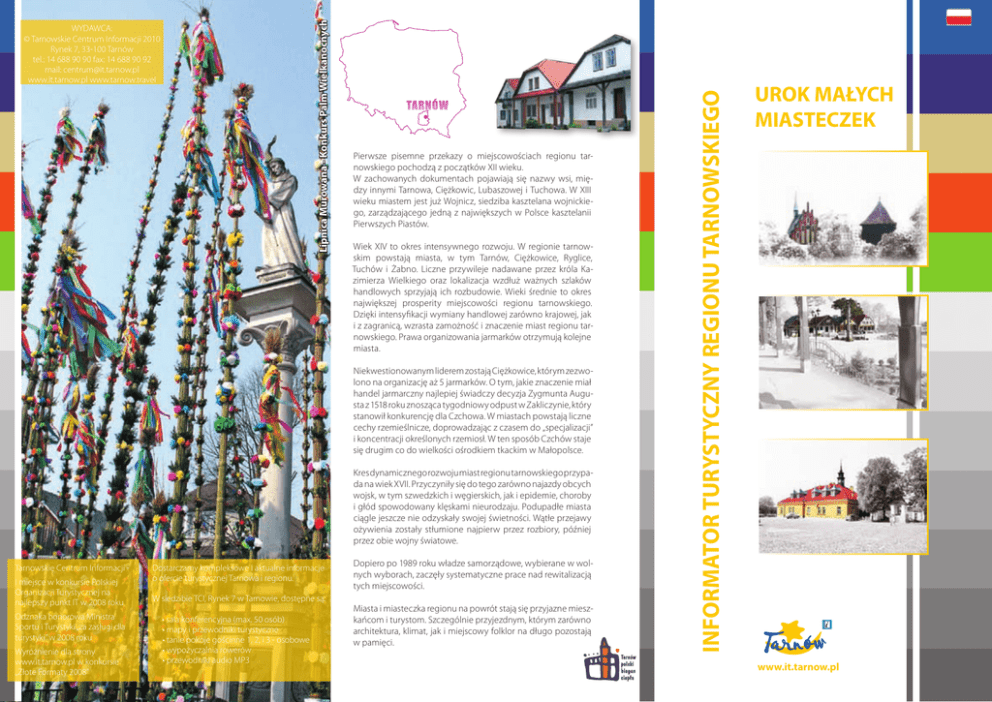 Pierwsze pisemne przekazy o miejscowościach regionu tarnowskiego pochodzą z początków XII wieku. W zachowanych dokumentach pojawiają się nazwy wsi, między innymi Tarnowa, Ciężkowic, Lubaszowej i Tuchowa. W XIII wieku miastem jest już Wojnicz, siedziba kasztelana wojnickiego, zarządzającego jedną z największych w Polsce kasztelanii Pierwszych Piastów. Wiek XIV to okres intensywnego rozwoju. W regionie tarnowskim powstają miasta, w tym Tarnów, Ciężkowice, Ryglice, Tuchów i Żabno. Liczne przywileje nadawane przez króla Kazimierza Wielkiego oraz lokalizacja wzdłuż ważnych szlaków handlowych sprzyjają ich rozbudowie. Wieki średnie to okres największej prosperity miejscowości regionu tarnowskiego. Dzięki intensyfikacji wymiany handlowej zarówno krajowej, jak i z zagranicą, wzrasta zamożność i znaczenie miast regionu tarnowskiego. Prawa organizowania jarmarków otrzymują kolejne miasta. Niekwestionowanym liderem zostają Ciężkowice, którym zezwolono na organizację aż 5 jarmarków. O tym, jakie znaczenie miał handel jarmarczny najlepiej świadczy decyzja Zygmunta Augusta z 1518 roku znosząca tygodniowy odpust w Zakliczynie, który stanowił konkurencję dla Czchowa. W miastach powstają liczne cechy rzemieślnicze, doprowadzając z czasem do „specjalizacji” i koncentracji określonych rzemiosł. W ten sposób Czchów staje się drugim co do wielkości ośrodkiem tkackim w Małopolsce. Kres dynamicznego rozwoju miast regionu tarnowskiego przypada na wiek XVII. Przyczyniły się do tego zarówno najazdy obcych wojsk, w tym szwedzkich i węgierskich, jak i epidemie, choroby i głód spowodowany klęskami nieurodzaju. Podupadłe miasta ciągle jeszcze nie odzyskały swojej świetności. Wątłe przejawy ożywienia zostały stłumione najpierw przez rozbiory, później przez obie wojny światowe. Tarnowskie Centrum Informacji I miejsce w konkursie Polskiej Organizacji Turystycznej na najlepszy punkt IT w 2008 roku Odznaka honorowa Ministra Sportu i Turystyki „za zasługi dla turystyki” w 2008 roku Wyróżnienie dla strony www.it.tarnow.pl w konkursie „Złote Formaty 2008” Dostarczamy kompleksowe i aktualne informacje o ofercie turystycznej Tarnowa i regionu. W siedzibie TCI, Rynek 7 w Tarnowie, dostępne są: • sala konferencyjna (max. 50 osób) • mapy i przewodniki turystyczne • tanie pokoje gościnne 1, 2, i 3 - osobowe • wypożyczalnia rowerów • przewodniki audio MP3 Dopiero po 1989 roku władze samorządowe, wybierane w wolnych wyborach, zaczęły systematyczne prace nad rewitalizacją tych miejscowości. Miasta i miasteczka regionu na powrót stają się przyjazne mieszkańcom i turystom. Szczególnie przyjezdnym, którym zarówno architektura, klimat, jak i miejscowy folklor na długo pozostają w pamięci. INFORMATOR TURYSTYCZNY REGIONU TARNOWSKIEGO Lipnica Murowana - Konkurs Palm Wielkanocnych WYDAWCA: © Tarnowskie Centrum Informacji 2010 Rynek 7, 33-100 Tarnów tel.: 14 688 90 90 fax: 14 688 90 92 mail: [email protected] www.it.tarnow.pl www.tarnow.travel UROK MAŁYCH MIASTECZEK www.it.tarnow.pl Ciężkowice - Rynek Najstarsze informacje na temat Ciężkowic znajdują się w datowanym na lata 1123-1125 dokumencie biskupa Idziego, zatwierdzającym posiadłości klasztoru tynieckiego. Osada otrzymała prawa miejskie w 1348 roku, aktem lokacyjnym króla Kazimierza Wielkiego. Do dzisiejszego dnia zachował się średniowieczny układ miasteczka z obszernym prostokątnym rynkiem i parami wybiegających z naroży ulic. Specyficzny klimat Ciężkowic tworzą otaczające rynek zabytkowe, murowano-drewniane domy z podcieniami z XVIII i XIX w. Są to budynki konstrukcji zrębowej, na podmurówce i fundamentach z miejscowego piaskowca, z siodłowymi, naszczółkowymi dachami, wspartymi na profilowanych drewnianych słupach, tworzącymi charakterystyczne podcienia. Wraz z usytuowanym pośrodku rynku dziewiętnastowiecznym, murowanym ratuszem z niewielkim wewnętrznym dziedzińcem i wieżyczką zegarową nadają miastu wyjątkowy urok. Odwiedzając Ciężkowice nie sposób ominąć jedynego w swoim rodzaju rezerwatu przyrody „Skamieniałego Miasta”. Na obszarze 15 hektarów znajdują się liczne grupy skał z piaskowca ciężkowickiego, którym natura nadała niezwykłe kształty. Rozrzucone na wzgórzu małe i duże formy skalne sprawiają wrażenie ruin dawnego grodu. Pierwsza pisemna wzmianka o Tuchowie pochodzi z 1105 roku, z dokumentu, w którym legat papieski Idzi informuje o darowaniu Tukowa, jak zwano wówczas tę osadę, opactwu benedyktyńskiemu przez żonę Władysława Hermana. W 1340 roku Kazimierz Wielki nadał Tuchowowi prawa miejskie. Znaczący wpływ na tę decyzję miały spore dochody czerpane z funkcjonującej w Tuchowie kopalni soli. W momencie lokacji wytyczony został rynek, pośrodku którego wzniesiony został ratusz. Polokacyjny średniowieczny układ miasta zachowany został do dziś. Współczesny Tuchów to przede wszystkim największe w Diecezji Tarnowskiej centrum kultu maryjnego. W klasztorze Redemptorystów znajduje się słynący łaskami obraz Matki Bożej Tuchowskiej, który został uznany za cudowny już w 1641 roku. Lipcowe święto MB Tuchowskiej rozpoczyna trwający tydzień odpust, który corocznie przyciąga ponad 100 000 wiernych z całego kraju. Ciężkowice - Skamieniałe Miasto Zakliczyn, miasteczko nad Dunajcem, pierwotnie nosiło nazwę Opatkowice i po raz pierwszy wzmiankowane było już w 1215 roku. Dzisiejszą nazwę miasto przyjęło w 1558 roku, kiedy Spytek Jordan, właściciel pobliskiego Melsztyna, przejął miejscowość od Benedyktynów tynieckich. Zakliczyn powstał na planie w kształcie wrzeciona, na osi wschód-zachód, z obszernym, drugim co do wielkości w Małopolsce, po Krakowie, prostokątnym rynkiem i wybiegającymi z jego naroży parami ulic. Zabudowa miasteczka, pierwotnie drewniana, tworzona była w unikatowy sposób - na dziewięciu słupach z zastrzałami. Konst