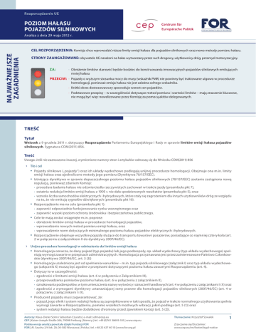 Rozporządzenie UE POZIOM HAŁASU POJAZDÓW SILNIKOWYCH Analiza z dnia 29 maja 2012 r. NAJWAŻNIEJSZE ZAGADNIENIA CEL ROZPORZĄDZENIA: Komisja chce wprowadzić niższe limity emisji hałasu dla pojazdów silnikowych oraz nowe metody pomiaru hałasu. STRONY ZAANGAŻOWANE: obywatele UE narażeni na hałas wytwarzany przez ruch drogowy, użytkownicy dróg, przemysł motoryzacyjny. ZA: ∙ Obniżenie limitów stanowić będzie bodziec do konstruowania innowacyjnych pojazdów silnikowych emitujących mniej hałasu PRZECIW: ∙ Pojazdy o wyższym stosunku mocy do masy (wskaźnik PMR) nie powinny być traktowane ulgowo w procedurze homologacji, ponieważ emisja hałasu nie jest zależna od tego wskaźnika. ∙ Krótki okres dostosowawczy spowoduje wzrost cen pojazdów. ∙ Podstawowe przepisy – w szczególności dotyczące metod pomiaru i wartości limitów – mają znaczenie kluczowe, nie mogą być więc nowelizowane przez Komisję za pomocą aktów delegowanych. TREŚĆ Tytuł Wniosek z 9 grudnia 2011 r. dotyczący Rozporządzenia Parlamentu Europejskiego i Rady w sprawie limitów emisji hałasu pojazdów silnikowych. Sygnatura COM(2011) 856. Treść Uwaga: Jeśli nie zaznaczono inaczej, wymienione numery stron i artykułów odnoszą się do Wniosku COM(2011) 856 ›› Tło i cel • Pojazdy silnikowe („pojazdy”) oraz ich układy wydechowe podlegają unijnej procedurze homologacji. Obejmuje ona m.in. limity emisji hałasu oraz ujednolicone metody jego pomiaru (Dyrektywa 70/157/EEC). • Istniejąca dyrektywa w sprawie dopuszczalnego poziomu hałasu pojazdów silnikowych (70/157/EEC) zostanie zastąpiona nową regulacją, ponieważ zdaniem Komisji: • procedura badania hałasu nie odzwierciedla rzeczywistych zachowań w trakcie jazdy (preambuła pkt 7), • ostatnia redukcja limitów emisji hałasu z 1995 r. nie dała spodziewanych rezultatów (preambuła pkt 5), oraz • wzrosła liczba samochodów elektrycznych i hybrydowych, które stały się zagrożeniem dla innych użytkowników dróg ze względu na to, że nie emitują sygnałów dźwiękowych (preambuła pkt 10). • Rozporządzenie ma na celu (preambuła pkt 1): • zapewnić odpowiednie funkcjonowanie rynku wewnętrznego oraz • zapewnić wysoki poziom ochrony środowiska i bezpieczeństwa publicznego. • Cele te mają zostać osiągnięte m.in. poprzez: • obniżenie limitów emisji hałasu w procedurze homologacji pojazdów, • wprowadzenie nowych metod pomiaru emisji hałasu, oraz • wprowadzenie norm dotyczących minimalnego poziomu hałasu pojazdów elektrycznych i hybrydowych. • Rozporządzenie obejmuje wszystkie pojazdy służące do transportu towarów i pasażerów, posiadające co najmniej cztery koła (art. 2 w połączeniu z załącznikiem II do dyrektywy 2007/46/EC). ›› Unijna procedura homologacji w odniesieniu do limitów emisji hałasu • Homologacja oznacza, że dany pojazd (typ pojazdu) lub jego podzespoły, np. układ wydechowy (typ układu wydechowego) spełniają wymogi zawarte w przepisach administracyjnych. Homologacja przyznawana jest przez zainteresowane Państwo Członkowskie (dyrektywa 2007/46/EC, art. 3 (3)) • Homologacja uzależniona jest od spełnienia warunków – m.in. typ pojazdu silnikowego (załącznik I) oraz typ układu wydechowego (załącznik X) muszą być zgodne z przepisami dotyczącymi poziomu hałasu zawartymi Rozporządzeniu (art. 4). • Dotyczy to w szczególności: • zgodności z limitami emisji hałasu (art. 6 w połączeniu z Załącznikiem III), • przeprowadzenia pomiarów poziomu hałasu (art. 6 w połączeniu z załącznikiem II), • oznakowania podzespołów, w tym umieszczenia nazwy wytwórcy i oznaczeń handlowych (art. 4 w połączeniu z załącznikami I i X) oraz • zgodności z wymogami dyrektywy ustanawiającej ramy prawne dla homologacji pojazdów silnikowych (2007/46/EC) (art. 4 w połączeniu z załącznikami I i X). • Producent pojazdu musi zagwarantować, że: • pojazd, jego silnik i system redukcji hałasu są zaprojektowane w taki sposób, że pojazd w trakcie normalnego użytkowania spełnia wymogi zawarte w Rozporządzeniu, pomimo wszelkich możliwych wibracji, jakim podlega (art. 5 (1)) oraz • system redukcji hałasu będzie dodatkowo chroniony przed zjawiskiem korozji (art. 5 (2)). Autorzy: Klaus-Dieter Sohn i Sebastian Czuratis | e-mail: [email protected] CEP | Kaiser-Joseph-Straße 266, 79098 Freiburg | Niemcy | tel. +49 (0)761 38693-105 | www.cep.eu Polska wersja analizy powstała dzięki Fundacji FOR FOR | Al. Szucha 2/4 lok. 20, 00-582 Warszawa | Polska | tel. +48 22 427 40 10 | www.for.org.pl Tłumaczenie: Krzysztof Szwałek Zrzeczenie się/Disclaimer: www.cep.eu/en/footer/legal-notice 1 Rozporządzenie UE POZIOM HAŁASU POJAZDÓW SILNIKOWYCH Analiza z dnia 29 maja 2012 r. ›› Zaostrzenie unijnych limitów hałasu • Unijne dopuszczalne poziomy hałasu (wyrażone w decybelach) zostaną obniżone w dwóch etapach (Załącznik III) – po dwóch (faza I) i pięciu latach (faza 2) od momentu wejścia w życie omawianego Rozporządzenia. Skala redukcji Samochody i autobusy do 3,5 tony Samochody ciężarowe faza I 2 dB 2dB 1dB faza II 2 dB 2dB 2dB powyżej 3,5 tony • W przypadku pojazdów, których stosunek mocy do masy (PMR) wynosi więcej niż 150 kW na tonę (kW/t), limit będzie wyższy o 1 dB (Załącznik III). ›› Unijna metoda pomiaru hałasu W ramach procedury homologacji, wprowadzona zostanie nowa metoda pomiaru poziomu hałasu. • Będzie ona oparta w głównej mierze na metodzie wypracowanej przez Grupę Roboczą ds. Hałasu UNECE (GRB, regulamin nr 51) z 2007 r. (preambuła pkt. 6). Różnica polegać będzie m.in. na tym, że będzie miała ona niższe wartości tolerancji jeśli chodzi o odległość mikrofonów od ziemi. • Nowa metoda pomiaru hałasu obejmować będzie badanie w trakcie przyspieszania pojazdu oraz badanie przy stałej prędkości (załącznik II). • Testy będą przeprowadzane prze