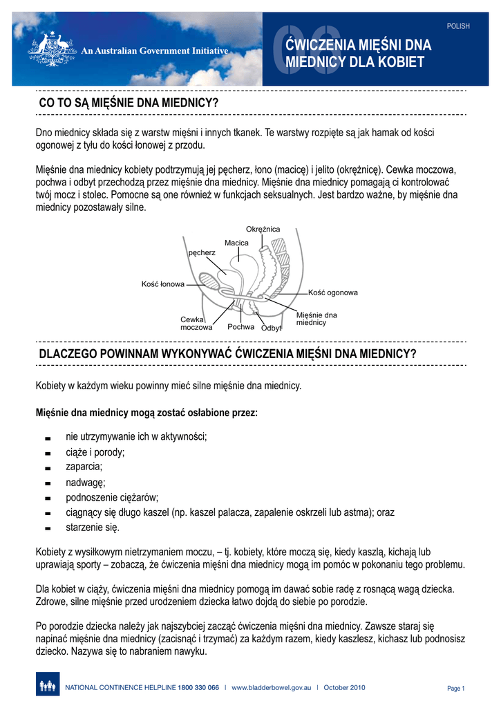 06 POLISH ĆWICZENIA MIĘŚNI DNA MIEDNICY DLA KOBIET CO TO SĄ MIĘŚNIE DNA MIEDNICY? Dno miednicy składa się z warstw mięśni i innych tkanek. Te warstwy rozpięte są jak hamak od kości ogonowej z tyłu do kości łonowej z przodu. Mięśnie dna miednicy kobiety podtrzymują jej pęcherz, łono (macicę) i jelito (okrężnicę). Cewka moczowa, pochwa i odbyt przechodzą przez mięśnie dna miednicy. Mięśnie dna miednicy pomagają ci kontrolować twój mocz i stolec. Pomocne są one również w funkcjach seksualnych. Jest bardzo ważne, by mięśnie dna miednicy pozostawały silne. Okrężnica pęcherz Macica Kość łonowa Cewka moczowa Kość ogonowa Pochwa Odbyt Mięśnie dna miednicy DLACZEGO POWINNAM WYKONYWAĆ ĆWICZENIA MIĘŚNI DNA MIEDNICY? Kobiety w każdym wieku powinny mieć silne mięśnie dna miednicy. Mięśnie dna miednicy mogą zostać osłabione przez: nie utrzymywanie ich w aktywności; ciąże i porody; zaparcia; nadwagę; podnoszenie ciężarów; ciągnący się długo kaszel (np. kaszel palacza, zapalenie oskrzeli lub astma); oraz starzenie się. Kobiety z wysiłkowym nietrzymaniem moczu, – tj. kobiety, które moczą się, kiedy kaszlą, kichają lub uprawiają sporty – zobaczą, że ćwiczenia mięśni dna miednicy mogą im pomóc w pokonaniu tego problemu. Dla kobiet w ciąży, ćwiczenia mięśni dna miednicy pomogą im dawać sobie radę z rosnącą wagą dziecka. Zdrowe, silne mięśnie przed urodzeniem dziecka łatwo dojdą do siebie po porodzie. Po porodzie dziecka należy jak najszybciej zacząć ćwiczenia mięśni dna miednicy. Zawsze staraj się napinać mięśnie dna miednicy (zacisnąć i trzymać) za każdym razem, kiedy kaszlesz, kichasz lub podnosisz dziecko. Nazywa się to nabraniem nawyku. National Continence Helpline 1800 330 066 | www.bladderbowel.gov.au | October 2010 Page 1 06 POLISH ĆWICZENIA MIĘŚNI DNA MIEDNICY DLA KOBIET W miarę starzenia się, mięśnie dna miednicy muszą być nadal mocne, ponieważ zmiany hormonalne po menopauzie mogą wpłynąć niekorzystnie na kontrolę pęcherza. Poza tym mięśnie dna miednicy zmieniają się i mogą stawać się słabsze. Plan ćwiczeń mięśni dna miednicy może pomóc zmniejszyć wpływ menopauzy na osłabienie podparcia miednicowego i kontroli pęcherza. Ćwiczenie mięśni dna miednicy może również pomóc kobietom, które doświadczają pilnej potrzeby częstszego oddawania moczu (zwanej naglącym nietrzymaniem). GDZIE SIĘ ZNAJDUJĄ MOJE MIĘŚNIE DNA MIEDNICY? Pierwsze, co należy zrobić, to dowiedzieć się, które mięśnie należy ćwiczyć. 1. Usiądź lub połóż się z rozluźnionymi mięśniami ud, pośladków i brzucha. 2.Ściśnij pierścień mięśnia wokół odbytu, jak gdybyś próbowała wstrzymać oddawanie gazów. Teraz rozluźnij ten mięsień. Ściśnij i zwolnij kilka razy aż do czasu, kiedy się upewnisz, że znalazłaś właściwe mięśnie. Staraj się nie ściskać pośladków. 3.Kiedy siedzisz na sedesie by oddać mocz, staraj się powstrzymać strumień moczu, a następnie uruchom go ponownie. Rób to, by nauczyć się, które mięśnie są do tego odpowiednie, – ale tylko raz w tygodniu. Twój pęcherz może się nie opróżniać w sposób, w jaki powinien, jeśli będziesz zatrzymywać i uruchamiać strumień częściej niż raz w tygodniu. Jeżeli nie poczujesz wyraźnego „ściśnięcia i uniesienia” swoich mięśni dna miednicy, lub jeśli nie uda ci się zwolnić swojego strumienia moczu, jak opisano w punkcie 3., zwróć się o pomoc do swojego lekarza, fizjoterapeuty lub pielęgniarki wyspecjalizowanej w kwestiach trzymania moczu. Pomogą ci oni w tym, żeby twoje mięśnie dna miednicy pracowały prawidłowo. Kobiety z bardzo słabymi mięśniami dna miednicy mogą skorzystać na ćwiczeniach mięśni dna miednicy. JAK MAM WYKONYWAĆ ĆWICZENIA MIĘŚNI DNA MIEDNICY? Teraz, kiedy już czujesz pracujące mięśnie, możesz: Ściskać i ściągać równocześnie mięśnie wokół odbytu i pochwy. Unieś je W GÓRĘ wewnątrz. Powinnaś mieć wrażenie „unoszenia” za każdym razem, kiedy ściskasz swoje mięśnie dna miednicy. Spróbuj je utrzymać silnie zaciśnięte, licząc do 8. Teraz zwolnij je i rozluźnij. Powinnaś mieć wyraźne wrażenie “puszczenia”. Powtórz „ściśnęcie i uniesienie” i puść. Najlepiej jest odpocząć przez około 8 sekund pomiędzy każdym uniesieniem mięśni. Jeśli nie będziesz mogła utrzymać ich przez 8 sekund, utrzymaj je najdłużej jak możesz. Powtórz to „ściśnij i unieś” tyle razy ile możesz, do 8-12 razy. Próbuj zrobić trzy zestawy po 8-12 razy z odpoczynkami pomiędzy nimi. Wykonaj cały ten plan ćwiczeń (trzy zestawy po 8-12 razy) codziennie – leżąc, siedząc i stojąc. National Continence Helpline 1800 330 066 | www.bladderbowel.gov.au | October 2010 Page 2 06 POLISH ĆWICZENIA MIĘŚNI DNA MIEDNICY DLA KOBIET W czasie wykonywania ćwiczeń mięśni dna miednicy: stale oddychaj; tylko ściskaj i unoś; NIE zaciskaj pośladków i zachowaj rozluźnione uda. WYKONUJ DOBRZE SWOJE ĆWICZENIA MIĘŚNI DNA MIEDNICY Mniej dobrych ściśnięć jest lepsze od wielu wymuszonych! Jeśli nie jesteś pewna, że robisz je dobrze, lub jeśli nie zauważysz zmiany symptomów po 3 miesiącach, zwróć się o pomoc do swojego lekarza, fizjoterapeuty lub pielęgniarki wyspecjalizowanej w kwestiach trzymania moczu. SPRAW, BY ĆWICZENIA STAŁY SIĘ CZĘŚCIĄ TWOJEGO CODZIENNEGO ŻYCIA Kiedy już nauczysz się, jak robić ściskania mięśni dna miednicy, powinnaś je często wykonywać. Najlepiej codziennie. Powinnaś całkowicie skoncentrować się na każdym zestawie. Wykonuj swoje ściskania mięśni dna miednicy o ustalonych porach. Może to być po odwiedzeniu toalety, kiedy pijesz coś lub kiedy leżysz w łóżku. Inne rzeczy, które możesz robić, żeby wzmocnić swoje mięśnie dna miednicy: Stosuj nawyk, tj. zawsze staraj się napiąć swoje mięśnie dna miednicy (zac