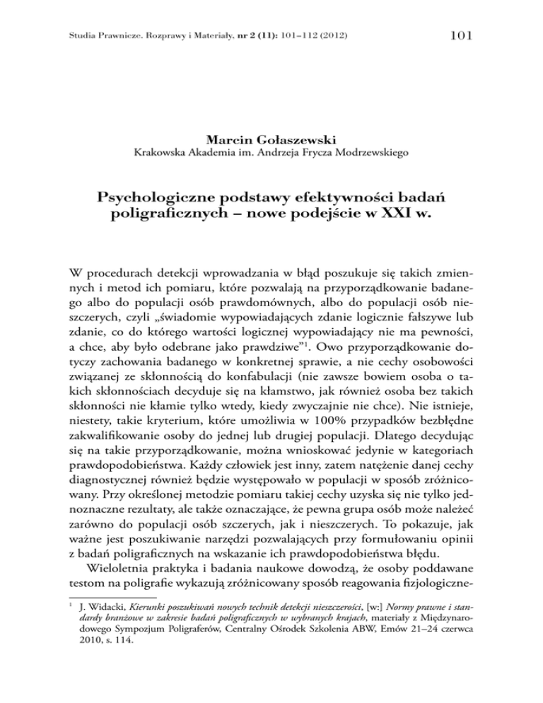 Studia Prawnicze. Rozprawy i Materiały, nr 2 (11): 101–112 (2012) 101 Marcin Gołaszewski Krakowska Akademia im. Andrzeja Frycza Modrzewskiego Psychologiczne podstawy efektywności badań poligraficznych – nowe podejście w XXI w. W procedurach detekcji wprowadzania w błąd poszukuje się takich zmiennych i metod ich pomiaru, które pozwalają na przyporządkowanie badanego albo do populacji osób prawdomównych, albo do populacji osób nieszczerych, czyli „świadomie wypowiadających zdanie logicznie fałszywe lub zdanie, co do którego wartości logicznej wypowiadający nie ma pewności, a chce, aby było odebrane jako prawdziwe”1. Owo przyporządkowanie dotyczy zachowania badanego w konkretnej sprawie, a nie cechy osobowości związanej ze skłonnością do konfabulacji (nie zawsze bowiem osoba o takich skłonnościach decyduje się na kłamstwo, jak również osoba bez takich skłonności nie kłamie tylko wtedy, kiedy zwyczajnie nie chce). Nie istnieje, niestety, takie kryterium, które umożliwia w 100% przypadków bezbłędne zakwalifikowanie osoby do jednej lub drugiej populacji. Dlatego decydując się na takie przyporządkowanie, można wnioskować jedynie w kategoriach prawdopodobieństwa. Każdy człowiek jest inny, zatem natężenie danej cechy diagnostycznej również będzie występowało w populacji w sposób zróżnicowany. Przy określonej metodzie pomiaru takiej cechy uzyska się nie tylko jednoznaczne rezultaty, ale także oznaczające, że pewna grupa osób może należeć zarówno do populacji osób szczerych, jak i nieszczerych. To pokazuje, jak ważne jest poszukiwanie narzędzi pozwalających przy formułowaniu opinii z badań poligraficznych na wskazanie ich prawdopodobieństwa błędu. Wieloletnia praktyka i badania naukowe dowodzą, że osoby poddawane testom na poligrafie wykazują zróżnicowany sposób reagowania fizjologiczne J. Widacki, Kierunki poszukiwań nowych technik detekcji nieszczerości, [w:] Normy prawne i standardy branżowe w zakresie badań poligraficznych w wybranych krajach, materiały z Międzynarodowego Sympozjum Poligraferów, Centralny Ośrodek Szkolenia ABW, Emów 21–24 czerwca 2010, s. 114. 1 102 marcin gołaszewski go na poszczególne pytania testowe. W 1947 r. John Reid wprowadził termin pytanie z porównywaną reakcją, które potem nazywano kontrolnym, a dziś najwłaściwsze wydaje się określenie pytanie porównawcze. Ten rodzaj pytania stanowi kluczowy element techniki pytań porównawczych (CQT – z ang. comparison question technique), opartej na założeniu, że osoba prawdomówna, udzielając odpowiedzi na pytania porównawcze, będzie bardziej reaktywna fizjologicznie niż przy pytaniach relewantnych, zaś osoba wprowadzająca w błąd – odwrotnie. Wyjaśnieniem istoty tego założenia miała być koncepcja nastawienia psychologicznego (z ang. – psychological set) Cleve’a Backstera z 1960 r. Zgodnie z nią, badany skupia się na tym problemie, który postrzega jako największe zagrożenie dla jego dobra2. Nastawienie psychologiczne przypomina rozbudowaną wersję pojęcia selektywnej uwagi, czyli zdolności skupienia uwagi na jednym, wybranym elemencie otoczenia i zignorowania pozostałych. W zależności od oczekiwań osoba obniża próg odbioru bodźca danej kategorii, jednocześnie podwyższając ten próg dla innych bodźców i interpretuje je w określonym kontekście sytuacyjnym. Obawy i lęki badanego będą orientować jego uwagę w taki sposób, że na podstawie analizy przebiegu reakcji fizjologicznych będzie możliwe ustalenie, jakich zagadnień dotyczą. Pośrednio można więc wyciągać wnioski na temat prawdomówności badanego. Szkopuł w tym, że pojęcia nastawienia psychologicznego nie znajdzie się w żadnym dziale psychologii. Owszem, sam termin nastawienie występuje w literaturze wraz z różnymi przedrostkami (np. nastawienie percepcyjne – jako predyspozycja mentalna do postrzegania jednej rzeczy zamiast innej; nastawienie mentalne – podejście do problemu w określony sposób; nastawienie sensoryczne – przygotowanie do reakcji raczej poprzez skoncentrowanie na odbiorze sygnału niż wytworzeniu reakcji)3, ale nie w takim znaczeniu, ja Backster zaproponował jeszcze dwa inne pojęcia. Jednym z nich jest „super tłumienie” (z ang. super dampening) – gdy badany skupia uwagę na nieznanym zewnętrznym problemie (np. związanym z traumatycznym przeżyciem lub nieujawnionym przestępstwem). Odpowiedzią na ten problem mają być tzw. pytania symptomatyczne. Drugim jest „tłumienie antyszczytowe” – polegające na tym, że badany może skupiać się tylko na jednym pytaniu testowym, postrzeganym jako największe zagrożenie. Dlatego właśnie, przedstawiając końcowe wyniki testów, należy się odnosić zawsze do całości testu, a nie każdego pytania z osobna. Przykładowo – jeśli w teście z trzema pytaniami relewantnymi uzyska się odpowiednio wyniki: -7, +3 i +4, nie można zakładać, że badany odpowiadał na pytania z dodatnimi wynikami zgodnie z prawdą, a wprowadzał w błąd tylko odnośnie do pierwszego zagadnienia. Zazwyczaj tak rzeczywiście będzie, ale nigdy nie ma pewności. Wobec tego, jeśli sytuacja miała miejsce w teście wielozagadnieniowym – po zweryfikowaniu problematycznego zagadnienia – ponownie przeprowadza się test z pozostałymi pytaniami, pomijając pierwsze zagadnienie. 3 A. Ginton, Relevant Issue Gravity (RIG) Strength – a New Concept in PDD that Reframes the Notion of Psychophysiological Set and the Role of Attention in CQT Polygraph Examinations, „Polygraph” 2009, Vol. 38, No. 3, s. 209. 2 Psychologiczne podstawy efektywności badań poligraficznych... 103 kie funkcjonowało przez wiele lat w badaniach poligraficznych. Teoria nastawienia psychologicznego, bazująca na poczuciu zagrożenia, nie daje ponadto odpowiedzi na wiele pytań – m.in.: dlaczego badany reaguje podczas testów na poligrafie w przewidywany sposó