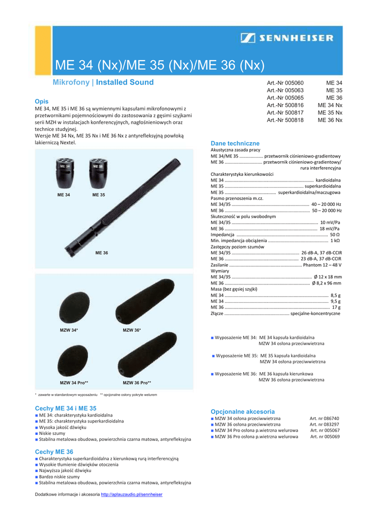 ME 34 (Nx)/ME 35 (Nx)/ME 36 (Nx) Mikrofony | Installed Sound Art.-Nr 005060 Art.-Nr 005063 Art.-Nr 005065 Art.-Nr 500816 Art.-Nr 500817 Art.-Nr 500818 Opis ME 34, ME 35 i ME 36 są wymiennymi kapsułami mikrofonowymi z przetwornikami pojemnościowymi do zastosowania z gęsimi szyjkami serii MZH w instalacjach konferencyjnych, nagłośnieniowych oraz technice studyjnej. Wersje ME 34 Nx, ME 35 Nx i ME 36 Nx z antyrefleksyjną powłoką lakierniczą Nextel. ME 34 Dane techniczne Akustyczna zasada pracy ME 34/ME 35 ................... przetwornik ciśnieniowo-gradientowy ME 36 .............................. przetwornik ciśnieniowo-gradientowy/ rura interferencyjna Charakterystyka kierunkowości ME 34 ....................................................................... kardioidalna ME 35 ............................................................... superkardioidalna ME 35 ......................................... superkardioidalna/maczugowa Pasmo przenoszenia m.cz. ME 34/35 .............................................................. 40 – 20 000 Hz ME 36 .................................................................... 50 – 20 000 Hz Skuteczność w polu swobodnym ME 34/35 ..................................................................... 10 mV/Pa ME 36 .......................................................................... 18 mV/Pa Impedancja ......................................................................... 50 Ω Min. impedancja obciążenia ................................................ 1 kΩ Zastępczy poziom szumów ME 34/35 ...................................................... 26 dB-A, 37 dB-CCIR ME 36 ........................................................... 23 dB-A, 37 dB-CCIR Zasilanie .......................................................... Phantom 12 – 48 V Wymiary ME 34/35 ................................................................ Ø 12 x 18 mm ME 36 .................................................................... Ø 8,2 x 96 mm Masa (bez gęsiej szyjki) ME 34 ................................................................................... 8,5 g ME 34 ................................................................................... 9,5 g ME 36 .................................................................................... 17 g Złącze .................................................... specjalne-koncentryczne ME 35 ME 36 MZW 34* ME 34 ME 35 ME 36 ME 34 Nx ME 35 Nx ME 36 Nx MZW 36* ■ Wyposażenie ME 34: ME 34 kapsuła kardioidalna MZW 34 osłona przeciwwietrzna ■ Wyposażenie ME 35: ME 35 kapsuła kardioidalna MZW 34 osłona przeciwwietrzna MZW 34 Pro** MZW 36 Pro** ■ Wyposażenie ME 36: ME 36 kapsuła kierunkowa MZW 36 osłona przeciwwietrzna * zawarte w standardowym wyposaŜeniu ** opcjonalne osłony pokryte welurem Cechy ME 34 i ME 35 ■ ME 34: charakterystyka kardioidalna ■ ME 35: charakterystyka superkardioidalna ■ Wysoka jakość dźwięku ■ Niskie szumy ■ Stabilna metalowa obudowa, powierzchnia czarna matowa, antyrefleksyjna Cechy ME 36 ■ Charakterystyka superkardioidalna z kierunkową rurą interferencyjną ■ Wysokie tłumienie dźwięków otoczenia ■ Najwyższa jakość dźwięku ■ Bardzo niskie szumy ■ Stabilna metalowa obudowa, powierzchnia czarna matowa, antyrefleksyjna Dodatkowe informacje i akcesoria http://aplauzaudio.pl/sennheiser Opcjonalne akcesoria ■ MZW 34 osłona przeciwwietrzna ■ MZW 36 osłona przeciwwietrzna ■ MZW 34 Pro osłona p.wietrzna welurowa ■ MZW 36 Pro osłona p.wietrzna welurowa Art. nr 086740 Art. nr 083297 Art. nr 005067 Art. nr 005069