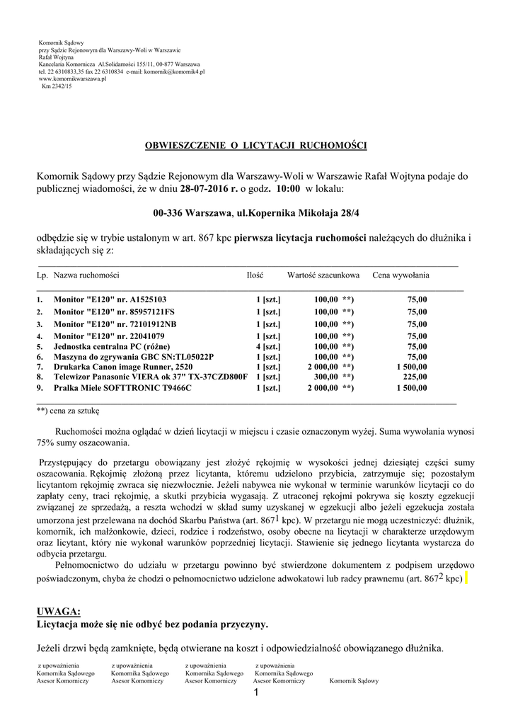 Komornik Sądowy przy Sądzie Rejonowym dla Warszawy-Woli w Warszawie Rafał Wojtyna Kancelaria Komornicza Al.Solidarności 155/11, 00-877 Warszawa tel. 22 6310833,35 fax 22 6310834 e-mail: [email protected] www.komornikwarszawa.pl Km 2342/15 OBWIESZCZENIE O LICYTACJI RUCHOMOŚCI Komornik Sądowy przy Sądzie Rejonowym dla Warszawy-Woli w Warszawie Rafał Wojtyna podaje do publicznej wiadomości, że w dniu 28-07-2016 r. o godz. 10:00 w lokalu: 00-336 Warszawa, ul.Kopernika Mikołaja 28/4 odbędzie się w trybie ustalonym w art. 867 kpc pierwsza licytacja ruchomości należących do dłużnika i składających się z: _______________________________________________________________________________________________________________________ Lp. Nazwa ruchomości Ilość Wartość szacunkowa Cena wywołania _________________________________________________________________________________________________________________________ 1. 2. 3. 4. 5. 6. 7. 8. 9. Monitor "E120" nr. A1525103 Monitor "E120" nr. 85957121FS Monitor "E120" nr. 72101912NB Monitor "E120" nr. 22041079 Jednostka centralna PC (różne) Maszyna do zgrywania GBC SN:TL05022P Drukarka Canon image Runner, 2520 Telewizor Panasonic VIERA ok 37" TX-37CZD800F Pralka Miele SOFTTRONIC T9466C 1 [szt.] 1 [szt.] 1 [szt.] 1 [szt.] 4 [szt.] 1 [szt.] 1 [szt.] 1 [szt.] 1 [szt.] 100,00 100,00 100,00 100,00 100,00 100,00 2 000,00 300,00 2 000,00 **) **) **) **) **) **) **) **) **) 75,00 75,00 75,00 75,00 75,00 75,00 1 500,00 225,00 1 500,00 _______________________________________________________________________________________________________________________ **) cena za sztukę Ruchomości można oglądać w dzień licytacji w miejscu i czasie oznaczonym wyżej. Suma wywołania wynosi 75% sumy oszacowania. Przystępujący do przetargu obowiązany jest złożyć rękojmię w wysokości jednej dziesiątej części sumy oszacowania. Rękojmię złożoną przez licytanta, któremu udzielono przybicia, zatrzymuje się; pozostałym licytantom rękojmię zwraca się niezwłocznie. Jeżeli nabywca nie wykonał w terminie warunków licytacji co do zapłaty ceny, traci rękojmię, a skutki przybicia wygasają. Z utraconej rękojmi pokrywa się koszty egzekucji związanej ze sprzedażą, a reszta wchodzi w skład sumy uzyskanej w egzekucji albo jeżeli egzekucja została umorzona jest przelewana na dochód Skarbu Państwa (art. 8671 kpc). W przetargu nie mogą uczestniczyć: dłużnik, komornik, ich małżonkowie, dzieci, rodzice i rodzeństwo, osoby obecne na licytacji w charakterze urzędowym oraz licytant, który nie wykonał warunków poprzedniej licytacji. Stawienie się jednego licytanta wystarcza do odbycia przetargu. Pełnomocnictwo do udziału w przetargu powinno być stwierdzone dokumentem z podpisem urzędowo poświadczonym, chyba że chodzi o pełnomocnictwo udzielone adwokatowi lub radcy prawnemu (art. 8672 kpc) UWAGA: Licytacja może się nie odbyć bez podania przyczyny. Jeżeli drzwi będą zamknięte, będą otwierane na koszt i odpowiedzialność obowiązanego dłużnika. z upoważnienia Komornika Sądowego Asesor Komorniczy z upoważnienia Komornika Sądowego Asesor Komorniczy z upoważnienia Komornika Sądowego Asesor Komorniczy z upoważnienia Komornika Sądowego Asesor Komorniczy 1 Komornik Sądowy Krzysztof Mazuchowski Maciej Parafiński Jakub Siadul Wojciech Andryszczyk 2 Rafał Wojtyna