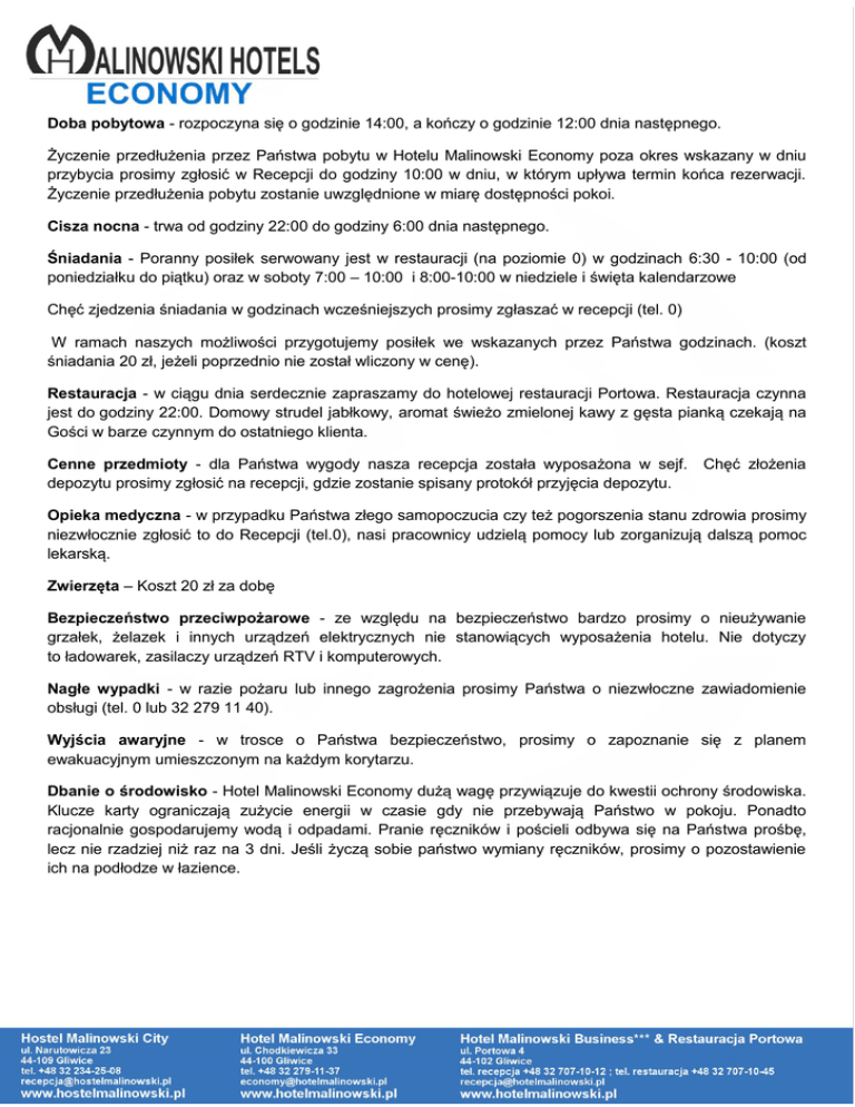 Doba pobytowa - rozpoczyna się o godzinie 14:00, a kończy o godzinie 12:00 dnia następnego. Życzenie przedłużenia przez Państwa pobytu w Hotelu Malinowski Economy poza okres wskazany w dniu przybycia prosimy zgłosić w Recepcji do godziny 10:00 w dniu, w którym upływa termin końca rezerwacji. Życzenie przedłużenia pobytu zostanie uwzględnione w miarę dostępności pokoi. Cisza nocna - trwa od godziny 22:00 do godziny 6:00 dnia następnego. Śniadania - Poranny posiłek serwowany jest w restauracji (na poziomie 0) w godzinach 6:30 - 10:00 (od poniedziałku do piątku) oraz w soboty 7:00 – 10:00 i 8:00-10:00 w niedziele i święta kalendarzowe Chęć zjedzenia śniadania w godzinach wcześniejszych prosimy zgłaszać w recepcji (tel. 0) W ramach naszych możliwości przygotujemy posiłek we wskazanych przez Państwa godzinach. (koszt śniadania 20 zł, jeżeli poprzednio nie został wliczony w cenę). Restauracja - w ciągu dnia serdecznie zapraszamy do hotelowej restauracji Portowa. Restauracja czynna jest do godziny 22:00. Domowy strudel jabłkowy, aromat świeżo zmielonej kawy z gęsta pianką czekają na Gości w barze czynnym do ostatniego klienta. Cenne przedmioty - dla Państwa wygody nasza recepcja została wyposażona w sejf. depozytu prosimy zgłosić na recepcji, gdzie zostanie spisany protokół przyjęcia depozytu. Chęć złożenia Opieka medyczna - w przypadku Państwa złego samopoczucia czy też pogorszenia stanu zdrowia prosimy niezwłocznie zgłosić to do Recepcji (tel.0), nasi pracownicy udzielą pomocy lub zorganizują dalszą pomoc lekarską. Zwierzęta – Koszt 20 zł za dobę Bezpieczeństwo przeciwpożarowe - ze względu na bezpieczeństwo bardzo prosimy o nieużywanie grzałek, żelazek i innych urządzeń elektrycznych nie stanowiących wyposażenia hotelu. Nie dotyczy to ładowarek, zasilaczy urządzeń RTV i komputerowych. Nagłe wypadki - w razie pożaru lub innego zagrożenia prosimy Państwa o niezwłoczne zawiadomienie obsługi (tel. 0 lub 32 279 11 40). Wyjścia awaryjne - w trosce o Państwa bezpieczeństwo, prosimy o zapoznanie się z planem ewakuacyjnym umieszczonym na każdym korytarzu. Dbanie o środowisko - Hotel Malinowski Economy dużą wagę przywiązuje do kwestii ochrony środowiska. Klucze karty ograniczają zużycie energii w czasie gdy nie przebywają Państwo w pokoju. Ponadto racjonalnie gospodarujemy wodą i odpadami. Pranie ręczników i pościeli odbywa się na Państwa prośbę, lecz nie rzadziej niż raz na 3 dni. Jeśli życzą sobie państwo wymiany ręczników, prosimy o pozostawienie ich na podłodze w łazience. Palenie tytoniu - na terenie całego hotelu obowiązuje bezwzględny zakaz palenia tytoniu z wyjątkiem specjalnie wyznaczonych do tego celu miejsc przy wejściu do lobby baru oraz recepcji. Prosimy o przestrzeganie tej kwestii z uwagi na pozostałych Gości. Dzieci - dla wygody karmienia naszych najmłodszych Gości w restauracji są dostępne specjalne krzesełka dla dzieci. Dla ich bezpiecznego snu po wcześniejszej rezerwacji nasza obsługa wstawi do Państwa pokoju łóżeczko dla niemowlaków. Koszt 20 zł. Parking - Hotel Malinowski Economy posiada monitorowany parking, dostępny przez całą dobę dla gości naszego hotelu z bezpośrednim wejściem do recepcji. Internet - na terenie całego Hotelu mają Państwo dostęp do bezpłatnego, bezprzewodowego Internetu (Wi-Fi). Prasowanie odzieży - dla Państwa wygody i komfortu oferujemy możliwość bezpłatnego wypożyczenia żelazka i deski do prasowania. Chęć wypożyczenia prosimy zgłaszać w recepcji. Pranie odzieży - dzięki współpracy hotelu z profesjonalną pralnią chemiczną oferujemy Państwu możliwość skorzystania z usług prania odzieży. Dokładne informacje odnośnie cen i terminów realizacji usługi dostępne w recepcji lub na osobnym cenniku. Budzenie - w celu zamówienia budzenia prosimy o kontakt z recepcja (tel. 0). Życzymy jednak, aby czas spędzony w Hotelu Malinowski Economy był czasem przeznaczonym na odpoczynek oraz relaks i nie wymagał bardzo wczesnych pobudek. Telefon - W celu połączenia z innym pokojem prosimy o wybranie numeru pokoju. W celu połączenia się z recepcją prosimy o wybranie nr 0. Artykuły higieny osobistej - dla tych z Państwa, którzy zapomnieli zabrać z domu podstawowych środków higienicznych zapewniliśmy możliwości ich zakupu w Recepcji Hotelu. Zniszczenia - w trosce o wzorowy stan wyposażenia naszego hotelu, służącego wszystkim gościom, stosujemy zasadę, iż Gość hotelowy ponosi odpowiedzialność materialną za wszelkiego rodzaju uszkodzenia lub zniszczenia przedmiotów wyposażenia i urządzeń technicznych hotelu powstałe umyślnie i nieumyślnie z jego winy lub z winy odwiedzających. Jeżeli Gość Hotelowy wykracza w sposób rażący lub uporczywy przeciwko obowiązującemu porządkowi hotelowemu lub przez swoje niewłaściwe zachowanie czyni korzystanie z innych pomieszczeń w hotelu uciążliwym. Hotel może wypowiedzieć umowę najmu pokoju bez zachowania terminu wypowiedzenia (szczegółowe normy postępowania zamieszczone są w Kodeksie Cywilnym z dnia 13.07.2006) Rzeczy znalezione - jeżeli po Państwa wyjeździe z Hotelu Malinowski Economy okaże się, że zostawili Państwo swoje rzeczy w pokoju, bardzo prosimy o telefoniczne powiadamianie Obsługi naszego hotelu o tym fakcie. Pozostawione przez Państwa rzeczy zostaną odesłane na wskazany adres. REGULAMIN HOTELU Dyrekcja Hotelu wysoko cenić będzie Państwa współpracę w przestrzeganiu niniejszego regulaminu, który ma służyć zapewnieniu bezpiecznego i spokojnego pobytu naszych gości. §1 1. Pokoje wynajmowane są na doby. §2 1. Gość hotelu jest zobowiązany do okazania pracownikowi Recepcji dowodu tożsamości przed zameldowaniem. W przypadku odmowy, Recepcjonista ma obowiązek odmówić przyjęcia gościa. 2. Doba hotelowa trwa od godziny 14.00 do godziny 12.00 dnia następnego. 3. Jeżeli g