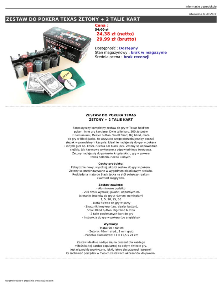 Informacje o produkcie Utworzono 01-03-2017 ZESTAW DO POKERA TEXAS ŻETONY + 2 TALIE KART Cena : 34,00 zł 24,38 zł (netto) 29,99 zł (brutto) Dostępność : Dostępny Stan magazynowy : brak w magazynie Średnia ocena : brak recenzji ZESTAW DO POKERA TEXAS ŻETONY + 2 TALIE KART Fantastyczny kompletny zestaw do gry w Texas hold'em poker i inne gry karciane. Dwie talie kart, 200 żetonów z nominałami, Dealer button, Small Blind, Big blind, mata do gry w Black Jacka, to wszystko czego potrzebujesz by poczuć się jak w prawdziwym kasynie. Idealnie nadaje się do gry w pokera i innych gier np. kości, ruletka lub black jack. Żetony są odpowiednio ciężkie, jak kasynowe wykonane z odpowiedniego tworzywa. Żetony nadają się do pokazów krupierskich, gry w pokera texas holdem, ruletki i innych. Cechy produktu: Fabrycznie nowy, wysokiej jakości zestaw do gry w pokera. Żetony są przechowywane w wygodnym plastikowym stelażu. Rozkładana mata do Black Jacka na stół zwiększy realizm i komfort rozgrywek. Zestaw zawiera: - Aluminiowe pudełko - 200 sztuk wysokiej jakości, odpornych na ścieranie żetonów do gry z różnymi nominałami 1, 5, 10, 25, 50 - Mata filcowa do gry w karty - Znacznik krupiera (tzw. dealer button), Small Blind button, Big Blind button - 2 talie powlekanych kart do gry - Instrukcja do gry w pokera (po angielsku) Wymiary: - Mata: 90 x 60 cm - Żetony: 40mm śred., 3 mm grub. - Pudełko aluminiowe: 11 x 11,5 x 24 cm Zestaw idealnie nadaje się na prezent dla każdego miłośnika tej bardzo popularnej na całym świecie gry. Jest niezwykle praktyczny, lekki, łatwo się przenosi i pozwoli Ci zachować porządek w Twoich zestawach akcesoriów do pokera. Wygenerowano w programie www.oscGold.com