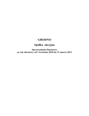 GRODNO Spółka akcyjna Sprawozdanie finansowe za rok obrotowy od 1 kwietnia 2010 do 31 marca 2011 GRODNO S.A. 2 Sprawozdanie finansowe za rok obrotowy od 1 kwietnia 2010 r. do 31 marca 2011 r. GRODNO Spółka akcyjna Michałów Grabina, ul. Kwiatowa 14 05-126 Nieporęt Sprawozdanie finansowe za rok obrotowy od 1 kwietnia 2010 r. do 31 marca 2011 r. Przy wycenie aktywów i pasywów oraz ustalaniu wyniku finansowego przyjęto, że z uwagi na brak przesłanek świadczących o zagrożeniu kontynuacji działalności gospodarczej, Spółka będzie ją kontynuować w dającej się przewidzieć przyszłości oraz nie zamierza ani nie musi zaniechać działalności lub istotnie zmniejszyć jej zakresu. Bilans, rachunek zysków i strat, rachunek przepływów pieniężnych, zestawienie zmian w kapitale własnym oraz dodatkowe informacje i objaśnienia zostały sporządzone zgodnie z ustawą o rachunkowości i przedstawione w niniejszym dokumencie w następującej kolejności: Strona I. WPROWADZENIE DO SPRAWOZDANIA FINANSOWEGO 3 II. BILANS NA 31 MARCA 2011 R. 5 III. RACHUNEK ZYSKÓW I STRAT (WARIANT PORÓWNAWCZY) 7 IV. RACHUNEK PRZEPŁYWÓW PIENIĘŻNYCH 8 V. ZESTAWIENIE ZMIAN W KAPITALE WŁASNYM 9 VI. INFORMACJA DODATKOWA 10 Sprawozdanie z działalności stanowi załącznik do niniejszego sprawozdania finansowego. Andrzej Jurczak – Prezes Zarządu Jarosław Jurczak – Wiceprezes Zarządu Monika Jurczak – Członek Zarządu Marta Olszewska – Główna Księgowa Michałów Grabina, dnia 29 lipca 2011 roku 2 GRODNO S.A. 3 Sprawozdanie finansowe za rok obrotowy od 1 kwietnia 2010 r. do 31 marca 2011 r. I. WPROWADZENIE DO SPRAWOZDANIA FINANSOWEGO Informacje o spółce 1. GRODNO spółka akcyjna z siedzibą w Michałowie – Grabinie przy ul. Kwiatowej 14 powstałą w wyniku przekształcenia GRODNO Spółki z ograniczoną odpowiedzialnością, zgodnie z uchwałą Zgromadzenia Wspólników z dnia 7 października 2009 roku, podjętą w obecności notariusza Danuty Kosim-Kruszewskiej w Warszawie (Rep. A 8059/2009). Przekształcona Spółka w dniu 20 listopada 2009 uzyskała wpis do Rejestru Przedsiębiorców prowadzonego przez Sąd Rejonowy dla M.St. Warszawy w Warszawie, XIV Wydział Gospodarczy, pod numerem KRS: 0000341683 2. GRODNO Sp. z o.o. – poprzednik prawny Spółki – została utworzona w dniu 17 września 1996 roku i wpisana do Krajowego Rejestru Sądowego prowadzonego przez Sąd Rejonowy dla M.St. Warszawy w Warszawie, XIV Wydział Gospodarczy, pod numerem KRS: 0000180654 3. W dniu 21 stycznia 2011 WZA Spółki podjęło uchwałę o podwyższeniu kapitału i wprowadzeniu praw do akcji oraz akcji do alternatywnego systemu obrotu. 4. W dniu 10 marca 2011 Krajowy Depozyt Papierów Wartościowych dokonał rejestracji akcji serii B w depozycie papierów wartościowych. 5. Sąd Rejonowy dla M.St. Warszawy w Warszawie, XIV Wydział Gospodarczy KRS w dniu 27 kwietnia 2011 postanowił o wpisaniu w Krajowym Rejestrze Sądowym podwyższenia kapitału Spółki do kwoty 1.230.000,00 złotych. 6. Podstawowym przedmiotem prowadzonej przez Spółkę działalności jest sprzedaż hurtowa i detaliczna artykułów elektrycznych, elektrotechnicznych i oświetleniowych. 7. Sprawozdanie finansowe zostało sporządzone za okres od 01.04.2010 r. do 31.03.2011 r. przy założeniu kontynuowania działalności gospodarczej przez jednostkę gospodarczą w dającej się przewidzieć przyszłości. 3 GRODNO S.A. 4 Sprawozdanie finansowe za rok obrotowy od 1 kwietnia 2010 r. do 31 marca 2011 r. Omówienie stosowanych metod wyceny aktywów i pasywów w zakresie, w jakim ustawa pozostawia jednostce prawo wyboru - środki trwałe oraz wartości niematerialne i prawne wyceniane są według cen nabycia lub kosztów wytworzenia spółka stosuje metodę liniową amortyzacji, przy zastosowaniu następujących rocznych stawek amortyzacyjnych: budynki i budowle 4,0 % - 11,0 % urządzenia techniczne i maszyny 10,0 % - 33,0 % środki transportu 20,0 % - 40,0 % pozostałe środki trwałe 18,0 % - 22,0 % programy komputerowe 30,0 % - 50,0 % inne wartości niematerialne i prawne - środki trwałe oraz wartości niematerialne i prawne o wartości początkowej niższej niż 3.500 zł umarzane są jednorazowo w 100% w miesiącu przekazania ich do używania - środki trwałe przyjmowane do używania na podstawie umów leasingu kwalifikowane są do aktywów Spółki - akcje przeznaczone do sprzedaży - wyceniane są według ceny (wartości) rynkowej - rzeczowe składniki aktywów obrotowych wykazywane są według ceny nabycia i korygowane o odpisy aktualizujące ich wartość - wartości rozchodu zapasów ustalane są metodą, „pierwsze przyszło – pierwsze wyszło” - należności wyceniane są w wartości nominalnej, skorygowanej o odpisy aktualizujące ich wartość - zobowiązania wyceniane są w kwocie wymagającej zapłaty - zobowiązania finansowe z tytułu leasingu wykazywane są w wysokości niespłaconych rat kapitałowych - kapitały własne oraz pozostałe aktywa i pasywa wyceniane są w wartości nominalnej - premie pieniężne z tytułu zrealizowanych umownych wartości zakupów wykazane są jako korekta wartości sprzedanych towarów i korekta wartości zapasów towarów handlowych - w rachunku przepływów pieniężnych wpływy i wydatki, dotyczące kredytu w części zaciągniętej i spłacanej przez współkredytobiorców wykazywane są w wartościach netto. 4 GRODNO S.A. 5 Sprawozdanie finansowe za rok obrotowy od 1 kwietnia 2010 r. do 31 marca 2011 r. II. BILANS NA 31 MARCA 2011 R. Informacja Dodatkowa AKTYWA A. Aktywa trwałe Wartości niematerialne i prawne VI.2.6) VI.1.1) Inne wartości niematerialne i prawne Zaliczki na wartości niematerialne i prawne Rzeczowe aktywa trwałe VI.1.1), VI.1.2) Środki trwałe - grunty (w tym prawo użytkowania wieczystego gruntu) - budynki, lokale i obiekty inżynierii lądowej i wodnej - urządzenia techniczne i maszyny - środki transportu - inne środki trwałe Środki trwa
