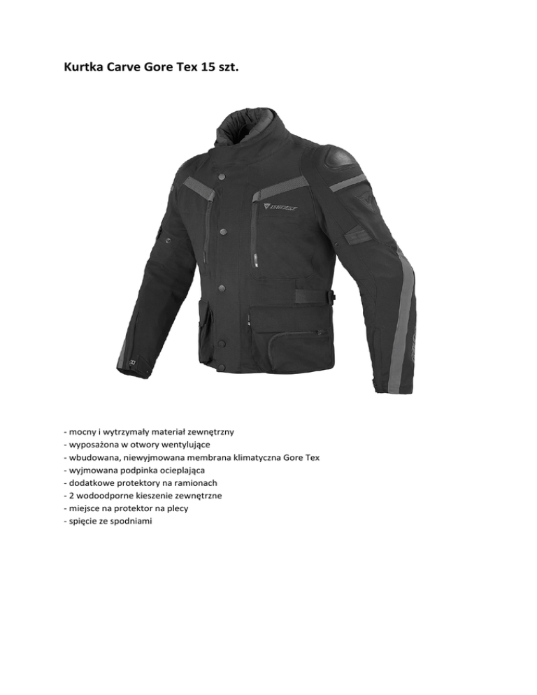 Kurtka Carve Gore Tex 15 szt. - mocny i wytrzymały materiał zewnętrzny - wyposażona w otwory wentylujące - wbudowana, niewyjmowana membrana klimatyczna Gore Tex - wyjmowana podpinka ocieplająca - dodatkowe protektory na ramionach - 2 wodoodporne kieszenie zewnętrzne - miejsce na protektor na plecy - spięcie ze spodniami Spodnie D-Xprorer 15 par - wyjmowana membrana - wyjmowana podpinka docieplająca - otwory wentylujące na udach - protektory na kolanach i piszczelach - mocne i trwałe kieszenie - spięcie do kurtki lub szelek Protektor na plecy i klatkę Wave Chest Pro 15 szt. Kompletna ochrona pleców,klatki piersiowej i żeber. Idealnie komponuje się z kurtką. Nie ogranicza ruchów do przodu i na boki. UWAGA: Protektor ten wymaga specjalistycznego mierzenia, które zapewnimy Państwu po zamówieniu produktów. Wyklucza on np możliwość użytkowania z protektorem na plecy Wave G (podwójna ochrona pleców nie jest możliwa) Kask: AGV AX8 15 szt. - kolor czarny - możliwość wyjęcia wnętrza - możliwość jazdy w goglach - możliwość jazdy bez daszka - duża ilość wentylacji wraz z wentylacją czołową jak w kasku crossowym - zapięcie typu 2D - bez zatrzasku - Homologacja: ECE 2205, ECE DOT, NBR, AS / NZS Rękawice Scout GTX 15 par - wszystkie najważniejsze protektory - wnętrze skórzane - membrana Gore Tex - szeroki mankiet ze ściągaczem - możliwość ubioru na dowolny typ kurtki Buty Dainese Carroarmato 15 par - na Gore Texie - pełna ochrona stopy i piszczela - szeroka cholewka - prosty sposób zapinania UWAGI: - wszystkie produkty wymagają przymiarki, która odbędzie się w siedzibie zamawiającego, organizatorem tego przedsięwzięcia jest oferent, terminy przymiarki zostaną uzgodnione między stronami. - dostawa zamówionego towaru najpóźniej do 20.11.2014r.