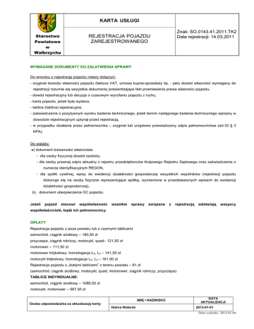 KARTA USŁUGI Znak: SO.0143.41.2011.TK2 Data rejestracji: 14.03.2011 REJESTRACJA POJAZDU ZAREJESTROWANEGO Starostwo Powiatowe w Wałbrzychu WYMAGANE DOKUMENTY DO ZAŁATWIENIA SPRAWY Do wniosku o rejestrację pojazdu należy dołączyć: - oryginał dowodu własności pojazdu (faktura VAT, umowa kupna-sprzedaży itp. - jako dowód własności wymagany do rejestracji rozumie się wszystkie dokumenty potwierdzające fakt przeniesienia prawa własności pojazdu, - dowód rejestracyjny lub decyzja o czasowym wycofaniu pojazdu z ruchu, - karta pojazdu, jeżeli była wydana, - tablice (tablica) rejestracyjne, - zaświadczenie o pozytywnym wyniku badania technicznego, jeżeli termin następnego badania technicznego wpisany w dowodzie rejestracyjnym upłynął przed rejestracją, - w przypadku działania przez pełnomocnika – oryginał lub urzędowo poświadczony odpis pełnomocnictwa (art.33 § 3 KPA). Do wglądu: a) dokument tożsamości właściciela: - dla osoby fizycznej dowód osobisty. - dla osoby prawnej odpis aktualny z rejestru przedsiębiorców Krajowego Rejestru Sądowego oraz zaświadczenie o numerze identyfikacyjnym REGON, - dla spółki cywilnej, wpisy do ewidencji działalności gospodarczej wszystkich wspólników (rejestracji pojazdu dokonuje się na osoby fizyczne reprezentujące spółkę, wymienione w przedstawionych wpisach do ewidencji działalności gospodarczej), b) dokument ubezpieczenia OC pojazdu. Jeżeli pojazd stanowi współwłasność wszelkie sprawy związane z rejestracją załatwiają wszyscy współwłaściciele, bądź ich pełnomocnicy. OPŁATY Rejestracja pojazdu z poza powiatu lub z czarnymi tablicami: samochód, ciągnik siodłowy – 180,50 zł przyczepa, ciągnik rolniczy, motocykl, quad– 121,50 zł motorower – 111,50 zł motorower trójkołowy, homologacja L5, L2 – 141,50 zł motocykl trójkołowy, homologacja L5, L2 – 161,50 zł Rejestracja pojazdu z „białymi tablicami” z terenu powiatu – 81 zł (samochód, ciągnik siodłowy, motocykl, quad, motorower, ciągnik rolniczy, przyczepa) TABLICE INDYWDUALNE: samochód, ciągnik siodłowy – 1086,50 zł motocykl, motorower – 567,50 zł IMIĘ I NAZWISKO Osoba odpowiedzialna za aktualizację karty: Halina Walerak DATA AKTUALIZACJI 2013-01-01 Data wydruku: 2013-01-04 KARTA USŁUGI Starostwo Powiatowe w Wałbrzychu REJESTRACJA POJAZDU ZAREJESTROWANEGO Znak: SO.0143.41.2011.TK2 Data rejestracji: 14.03.2011 Do opłaty należy doliczyć w zależności od rodzaju rejestracji: PC (pozwolenie czasowe) – 12,50 zł (+opłata ewidencyjna 0,50 zł), KP (karta pojazdu) – 75 zł (+opłata ewidencyjna 0,50 zł) KONTO: Opłaty za rejestrację pojazdu zarejestrowanego uiszcza się na konto: Starostwa Powiatowego w Wałbrzychu Genin Noble Bank SA Nr: 96156000132242215957450001. Opłaty za pełnomocnictwo (od każdego stosunku pełnomocnictwa) wynosi 17 zł i uiszcza się ją na konto Urzędu Miejskiego w Wałbrzychu Bank Handlowy w Warszawie, ul. Senatorska 16. Nr: 95 1030 1289 0000 0000 9000 0098 Opłaty nie pobiera się m.in. od pełnomocnictw udzielanych małżonkowi, wstępnemu, zstępnemu lub rodzeństwu. Opłat można dokonać w następującej formie: − w kasie znajdującej się na terenie Starostwa w budynku nr 24 (czynna od 7.30 do 14.30). Od opłat dokonywanych na konto nr Nr: 95 1030 1289 0000 0000 9000 0098 pobierana jest prowizja. − w innym punkcie kasowym, − przelewem internetowym. MIEJSCE ZŁOŻENIA DOKUMENTÓW Wydział Komunikacji – Al. Wyzwolenia 24, parter, pokój nr 16. OSOBY DO KONTAKTU Krystyna Łaniusz, Anna Grochowalska, Aneta Markowska, Stanisław Kasprzak pokój nr 16 tel. (74) 84-60-503 TERMIN I SPOSÓB ZAŁATWIENIA - sprawy nie wymagające postępowania wyjaśniającego załatwia się niezwłocznie, - sprawy wymagające postępowania wyjaśniającego – nie później niż w ciągu miesiąca od dnia złożenia wniosku, - sprawy szczególnie skomplikowane - nie później niż w ciągu dwóch miesięcy od dnia złożenia wniosku. TRYB ODWOŁAWCZY Odwołanie od decyzji składa się w ciągu 14 dni do Samorządowego Kolegium Odwoławczego w Wałbrzychu za naszym pośrednictwem. Odwołanie należy składać w Kancelarii Ogólnej Starostwa Powiatowego pokój nr 13 na parterze. PODSTAWA PRAWNA - ustawa z dnia 20 czerwca 1997r. – Prawo o ruchu drogowym (tj. Dz.U. z 2012r. 1137 ze zmianami), - rozporządzenie Ministra Infrastruktury z dnia 22 lipca 2002r w sprawie rejestracji i oznaczania pojazdów (Dz. U. z 2007r. Nr 186, poz. 1322 ze zmianami), IMIĘ I NAZWISKO Osoba odpowiedzialna za aktualizację karty: Halina Walerak DATA AKTUALIZACJI 2013-01-01 Data wydruku: 2013-01-04 KARTA USŁUGI Starostwo Powiatowe w Wałbrzychu REJESTRACJA POJAZDU ZAREJESTROWANEGO Znak: SO.0143.41.2011.TK2 Data rejestracji: 14.03.2011 - rozporządzenie Ministra Infrastruktury z dnia 27 września 2003r. w sprawie szczegółowych czynności organów w prawach związanych z dopuszczeniem pojazdu do ruchu oraz wzorów dokumentów w tych sprawach (Dz.U. z 2007r. Nr 137, poz.968 ze zmianami). - rozporządzenie Ministra Infrastruktury z dnia 24 września 2003 r. w sprawie dokumentów stanowiących podstawę wpisu danych do karty pojazdu oraz czynności jednostek zajmujących się dystrybucją, przechowywaniem i wydawaniem kart pojazdów (Dz. U. Nr 189, poz. 1857), - rozporządzenie Ministra Infrastruktury z dnia 20 października 2003 r. w sprawie warunków i trybu wydawania kart pojazdów, wzoru karty pojazdu oraz jej opisu (Dz. U. Nr 189, poz. 1858 ze zmianami), - rozporządzenie Ministra Transportu i Budownictwa w sprawie wysokości opłat za karty pojazdu (Dz. U. z 2006r. Nr 59, poz. 421), - rozporządzenie Ministra Spraw Wewnętrznych z dnia 16 kwietnia 2012r. w sprawie opłaty ewidencyjnej (Dz. U. poz. 447), − rozporządzenie Ministra Infrastruktury z dnia 22 grudnia 2003 r. w sprawie wysokości opłat za wydanie dowodu rejestracyjnego, pozwolenia czasowego i tablic(tablicy) rejestracyjnych pojazdów