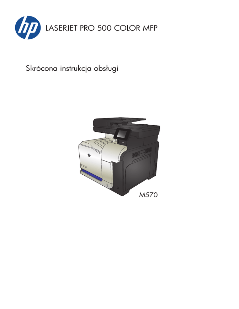 LASERJET PRO 500 COLOR MFP Skrócona instrukcja obsługi M570 Drukowanie z urządzenia USB 2 1. Włóż dysk USB do portu na przedniej części urządzenia. 2. Otworzy się menu Dysk flash USB. Dotykając przycisków ze strzałkami można przewijać opcje. ● Drukuj dokumenty ● Wyśw. i druk. zdjęcia ● Skanuj na dysk USB 3. Aby wydrukować dokument, dotknij ekranu Drukuj dokumenty, a następnie dotknij nazwy folderu na dysku USB, na którym jest zapisany dokument. Po wyświetleniu ekranu podsumowania można go dotknąć, aby dostosować ustawienia. Dotknij przycisku Drukowanie, aby wydrukować dokument. 4. Dotknij ekranu Wyśw. i druk. zdjęcia, a następnie wybierz obraz podglądu dla każdego zdjęcia, które chcesz wydrukować. Dotknij przycisku Gotowe. Po wyświetleniu ekranu podsumowania można go dotknąć, aby dostosować ustawienia. Dotknij przycisku Drukowanie, aby wydrukować zdjęcia. 5. Weź wydruk z podajnika i odłącz dysk USB. Skrócona instrukcja obsługi PLWW Sortowanie zlecenia kopiowania 1. Połóż dokument na szybie skanera lub włóż go do podajnika dokumentów. 2. Na ekranie głównym panelu sterowania urządzenia dotknij przycisku Kopia. 3. Dotknij przycisku Ustawienia, a następnie przewiń ekran i dotknij przycisku Składanie. Dotykając przycisków ze strzałkami, przewiń opcje, a następnie dotknij opcji, aby ją wybrać. 4. Dotknij przycisku Czarny lub Kolor, aby rozpocząć kopiowanie. PLWW Sortowanie zlecenia kopiowania 3 Kopiowanie po obu stronach (dwustronne) Automatyczne kopiowanie obu stron 4 1. Załaduj oryginalne dokumenty do podajnika tak, aby pierwsza strona była skierowana do góry i górną częścią dokumentu do przodu. 2. Dopasuj prowadnice papieru do formatu dokumentu. 3. Na ekranie głównym panelu sterowania urządzenia dotknij przycisku Kopia. 4. Dotknij przycisku Ustawienia. 5. Przewiń listę i dotknij przycisku Two-Sided (Dwustronne). 6. Dotykając przycisków ze strzałkami, przewiń opcje, a następnie dotknij opcji, aby ją wybrać. 7. Dotknij przycisku Czarny lub Kolor, aby rozpocząć kopiowanie. Skrócona instrukcja obsługi PLWW Ręczne kopiowanie po obu stronach 1. Umieść dokument wydrukiem w dół na szybie skanera, lewym górnym narożnikiem dokumentu w prawym górnym rogu szyby skanera. Zamknij skaner. 2. Na ekranie głównym panelu sterowania urządzenia dotknij przycisku Kopia. 3. Dotknij przycisku Ustawienia. 4. Przewiń listę i dotknij przycisku Two-Sided (Dwustronne). 5. Dotykając przycisków ze strzałkami, przewiń opcje, a następnie dotknij opcji, aby ją wybrać. 6. Dotknij przycisku Czarny lub Kolor, aby rozpocząć kopiowanie. 7. Urządzenie wyświetli monit o załadowanie następnego oryginału. Połóż go na szybie i dotknij przycisku OK. 8. Powtarzaj ten proces tak długo, aż zeskanujesz ostatnią stronę. Dotknij przycisku Gotowe, aby zakończyć drukowanie kopii. PLWW Kopiowanie po obu stronach (dwustronne) 5 Zmniejszanie lub powiększanie kopii 6 1. Połóż dokument na szybie skanera lub włóż go do podajnika dokumentów. 2. Na ekranie głównym panelu sterowania urządzenia dotknij przycisku Kopia. 3. Dotknij przycisku Ustawienia, a następnie dotknij przycisku Zmniejsz/Powiększ. Dotykając przycisków ze strzałkami, przewiń opcje, a następnie dotknij opcji, aby ją wybrać. 4. Dotknij przycisku Czarny lub Kolor, aby rozpocząć kopiowanie. Skrócona instrukcja obsługi PLWW Optymalizacja jakości kopiowania Dostępne są następujące ustawienia jakości kopii: ● Wybór automat.: Używaj tego ustawienia, gdy jakość kopii nie jest zbyt ważna. Jest to ustawienie domyślne. ● Mieszana: Wybierz to ustawienie w przypadku kopiowania dokumentów, które zawierają tekst i grafikę. ● ● Tekst: Wybierz to ustawienie w przypadku kopiowania dokumentów zawierających głównie tekst. Obraz: Wybierz to ustawienie w przypadku kopiowania dokumentów zawierających głównie grafikę. 1. Połóż dokument na szybie skanera lub włóż go do podajnika dokumentów. 2. Na ekranie głównym dotknij przycisku Kopia. 3. Dotknij przycisku Ustawienia, a następnie przewiń ekran i dotknij przycisku Optymalizacja. Dotykając przycisków ze strzałkami, przewiń opcje, a następnie dotknij opcji, aby ją wybrać. 4. Naciśnij przycisk Czarny lub Kolor, aby rozpocząć kopiowanie. PLWW Optymalizacja jakości kopiowania 7 Ustawianie rozmiaru i rodzaju papieru specjalnego na potrzeby kopiowania 1. Na ekranie głównym dotknij przycisku Kopia. 2. Dotknij przycisku Ustawienia, a następnie przewiń ekran i dotknij przycisku Papier. 3. Na liście formatów papieru dotknij nazwę formatu papieru, który znajduje się w podajniku 1. UWAGA: W przypadku kopiowania urządzenie obsługuje następujące rozmiary papieru: Letter, Legal i A4. 8 4. Na liście rodzajów papieru dotknij nazwę rodzaju papieru, który znajduje się w podajniku 1. 5. Dotknij przycisku Czarny lub Kolor, aby rozpocząć kopiowanie. Skrócona instrukcja obsługi PLWW Skanowanie na dysk flash USB 1. Połóż dokument na szybie skanera lub włóż go do podajnika dokumentów. 2. Włóż dysk flash USB do portu znajdującego się z przodu urządzenia. 3. Na ekranie głównym panelu sterowania urządzenia dotknij przycisku Skanowanie. 4. Dotknij ekranu Skanuj na dysk USB. 5. Dotknij przycisku Skanowanie, aby zeskanować dokument i zapisać plik. Urządzenie utworzy folder o nazwie HPSCANS na dysku USB i zapisze plik w formacie PDF lub JPG pod automatycznie wygenerowaną nazwą. UWAGA: Po wyświetleniu ekranu podsumowania można go dotknąć, aby dostosować ustawienia. Nazwę folderu można zmienić. PLWW Skanowanie na dysk flash USB 9 Skanowanie, by zapisać folderze sieciowym Korzystając z panelu sterowania urządzenia, można skanować dokument i zapisać go w folderze sieciowym. UWAGA: Aby można było korzystać z tej funkcji, urządzenie musi być podłączone do sieci i funkcja skanowania musi być skonfigurowana za pomocą wbudowane