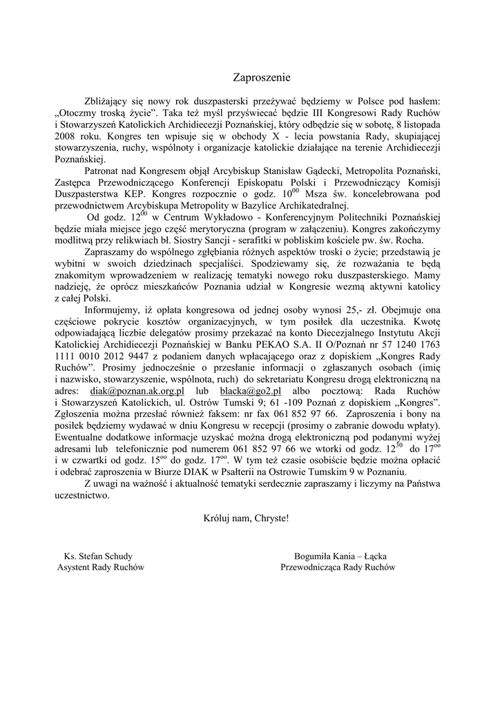 Zaproszenie ZbliŜający się nowy rok duszpasterski przeŜywać będziemy w Polsce pod hasłem: „Otoczmy troską Ŝycie”. Taka teŜ myśl przyświecać będzie III Kongresowi Rady Ruchów i Stowarzyszeń Katolickich Archidiecezji Poznańskiej, który odbędzie się w sobotę, 8 listopada 2008 roku. Kongres ten wpisuje się w obchody X - lecia powstania Rady, skupiającej stowarzyszenia, ruchy, wspólnoty i organizacje katolickie działające na terenie Archidiecezji Poznańskiej. Patronat nad Kongresem objął Arcybiskup Stanisław Gądecki, Metropolita Poznański, Zastępca Przewodniczącego Konferencji Episkopatu Polski i Przewodniczący Komisji Duszpasterstwa KEP. Kongres rozpocznie o godz. 1000 Msza św. koncelebrowana pod przewodnictwem Arcybiskupa Metropolity w Bazylice Archikatedralnej. Od godz. 1200 w Centrum Wykładowo - Konferencyjnym Politechniki Poznańskiej będzie miała miejsce jego część merytoryczna (program w załączeniu). Kongres zakończymy modlitwą przy relikwiach bł. Siostry Sancji - serafitki w pobliskim kościele pw. św. Rocha. Zapraszamy do wspólnego zgłębiania róŜnych aspektów troski o Ŝycie; przedstawią je wybitni w swoich dziedzinach specjaliści. Spodziewamy się, Ŝe rozwaŜania te będą znakomitym wprowadzeniem w realizację tematyki nowego roku duszpasterskiego. Mamy nadzieję, Ŝe oprócz mieszkańców Poznania udział w Kongresie wezmą aktywni katolicy z całej Polski. Informujemy, iŜ opłata kongresowa od jednej osoby wynosi 25,- zł. Obejmuje ona częściowe pokrycie kosztów organizacyjnych, w tym posiłek dla uczestnika. Kwotę odpowiadającą liczbie delegatów prosimy przekazać na konto Diecezjalnego Instytutu Akcji Katolickiej Archidiecezji Poznańskiej w Banku PEKAO S.A. II O/Poznań nr 57 1240 1763 1111 0010 2012 9447 z podaniem danych wpłacającego oraz z dopiskiem „Kongres Rady Ruchów”. Prosimy jednocześnie o przesłanie informacji o zgłaszanych osobach (imię i nazwisko, stowarzyszenie, wspólnota, ruch) do sekretariatu Kongresu drogą elektroniczną na adres: [email protected] lub [email protected] albo pocztową: Rada Ruchów i Stowarzyszeń Katolickich, ul. Ostrów Tumski 9; 61 -109 Poznań z dopiskiem „Kongres”. Zgłoszenia moŜna przesłać równieŜ faksem: nr fax 061 852 97 66. Zaproszenia i bony na posiłek będziemy wydawać w dniu Kongresu w recepcji (prosimy o zabranie dowodu wpłaty). Ewentualne dodatkowe informacje uzyskać moŜna drogą elektroniczną pod podanymi wyŜej adresami lub telefonicznie pod numerem 061 852 97 66 we wtorki od godz. 1230 do 17oo i w czwartki od godz. 15oo do godz. 17oo. W tym teŜ czasie osobiście będzie moŜna opłacić i odebrać zaproszenia w Biurze DIAK w Psałterii na Ostrowie Tumskim 9 w Poznaniu. Z uwagi na waŜność i aktualność tematyki serdecznie zapraszamy i liczymy na Państwa uczestnictwo. Króluj nam, Chryste! Ks. Stefan Schudy Asystent Rady Ruchów Bogumiła Kania – Łącka Przewodnicząca Rady Ruchów