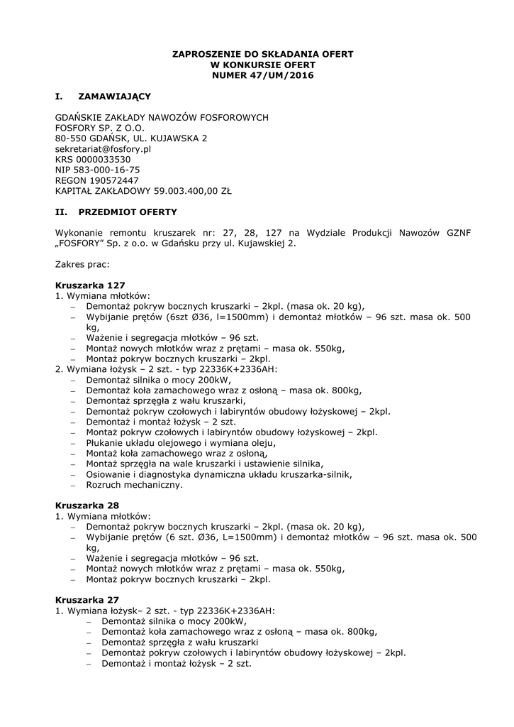 ZAPROSZENIE DO SKŁADANIA OFERT W KONKURSIE OFERT NUMER 47/UM/2016 I. ZAMAWIAJĄCY GDAŃSKIE ZAKŁADY NAWOZÓW FOSFOROWYCH FOSFORY SP. Z O.O. 80-550 GDAŃSK, UL. KUJAWSKA 2 [email protected] KRS 0000033530 NIP 583-000-16-75 REGON 190572447 KAPITAŁ ZAKŁADOWY 59.003.400,00 ZŁ II. PRZEDMIOT OFERTY Wykonanie remontu kruszarek nr: 27, 28, 127 na Wydziale Produkcji Nawozów GZNF „FOSFORY” Sp. z o.o. w Gdańsku przy ul. Kujawskiej 2. Zakres prac: Kruszarka 127 1. Wymiana młotków: Demontaż pokryw bocznych kruszarki – 2kpl. (masa ok. 20 kg), Wybijanie prętów (6szt Ø36, l=1500mm) i demontaż młotków – 96 szt. masa ok. 500 kg, Ważenie i segregacja młotków – 96 szt. Montaż nowych młotków wraz z prętami – masa ok. 550kg, Montaż pokryw bocznych kruszarki – 2kpl. 2. Wymiana łożysk – 2 szt. - typ 22336K+2336AH: Demontaż silnika o mocy 200kW, Demontaż koła zamachowego wraz z osłoną – masa ok. 800kg, Demontaż sprzęgła z wału kruszarki, Demontaż pokryw czołowych i labiryntów obudowy łożyskowej – 2kpl. Demontaż i montaż łożysk – 2 szt. Montaż pokryw czołowych i labiryntów obudowy łożyskowej – 2kpl. Płukanie układu olejowego i wymiana oleju, Montaż koła zamachowego wraz z osłoną, Montaż sprzęgła na wale kruszarki i ustawienie silnika, Osiowanie i diagnostyka dynamiczna układu kruszarka-silnik, Rozruch mechaniczny. Kruszarka 28 1. Wymiana młotków: Demontaż pokryw bocznych kruszarki – 2kpl. (masa ok. 20 kg), Wybijanie prętów (6 szt. Ø36, L=1500mm) i demontaż młotków – 96 szt. masa ok. 500 kg, Ważenie i segregacja młotków – 96 szt. Montaż nowych młotków wraz z prętami – masa ok. 550kg, Montaż pokryw bocznych kruszarki – 2kpl. Kruszarka 27 1. Wymiana łożysk– 2 szt. - typ 22336K+2336AH: Demontaż silnika o mocy 200kW, Demontaż koła zamachowego wraz z osłoną – masa ok. 800kg, Demontaż sprzęgła z wału kruszarki Demontaż pokryw czołowych i labiryntów obudowy łożyskowej – 2kpl. Demontaż i montaż łożysk – 2 szt. Montaż pokryw czołowych i labiryntów obudowy łożyskowej – 2kpl. Płukanie układu olejowego i wymiana oleju, Montaż koła zamachowego wraz z osłoną, Montaż sprzęgła na wale kruszarki i ustawienie silnika, Osiowanie i diagnostyka dynamiczna układu kruszarka-silnik, Rozruch mechaniczny. Wszystkie materiały niezbędne do wykonania ww. zadania zapewnia Zlecający. Sprzęt niezbędny do wykonania w/w zakresu prac zapewnia Wykonawca. Oferenci muszą posiadać niezbędną wiedzę i doświadczenie oraz dysponować potencjałem technicznym i osobami uprawnionymi do wykonania zlecenia. Termin wykonania - maj 2016r. Do złożenia prawidłowej oferty konieczna jest wizyta w obiekcie na terenie GZNF „FOSFORY” Sp. z o.o. III. INFORMACJE DOTYCZĄCE TERMINU I MIEJSCA SKŁADANIA OFERT Oferty należy składać w zamkniętej kopercie w Kancelarii GZNF „FOSFORY” Sp. z o. o., 80-550 Gdańsk ul. Kujawska 2, budynek biurowca II piętro z dopiskiem na kopercie „Wykonanie remontu kruszarek nr: 27, 28, 127. Konkurs ofert nr 47/UM/2016”. Osobą uprawnioną do kontaktów z oferentami jest Pan Jarosław Malinowski tel. /58/ 34 38 315 lub 669 600 415. Termin składania ofert upływa w dniu 21.04.2016 r. Za datę terminowego doręczenia oferty uważa się datę zarejestrowania oferty w Kancelarii GZNF FOSFORY Sp. z o. o. Oferty, które wpłyną po tym terminie nie będą rozpatrywane. IV. KRYTERIA OCENY SPEŁNIENIA DOSTAWCÓW/WYKONAWCÓW L.p. 1. 2. 3. 4. V. WARUNKÓW Kryteria Cena Czas realizacji Referencje Wiarygodność w ocenie członków Komisji WYMAGANYCH OD Znaczenie 70% 10% 10% 10% OFERTA POWINNA ZAWIERAĆ Termin wykonania prac Cenę ofertową za wykonanie kompletnego zakresu prac Warunki płatności Warunki gwarancyjne Szczegółowy zakres prac Informację o kwalifikacjach posiadanej kadry technicznej Referencje lub informacje o wykonanych pracach podobnego typu VI. WYMAGANE ZAŁĄCZNIKI Kserokopia dokumentu rejestrowego oferenta Kserokopia numeru NIP, REGON Dokumenty pozwalające ocenić wiarygodność techniczną i ekonomiczna oferenta (np. kadra techniczna, sprzęt itp.) Oświadczenie o sytuacji finansowej zapewniającej wykonanie zamówienia Oświadczenie o braku wszczęcia w stosunku do oferenta postępowania upadłościowego lub układowego Oświadczenie o nie zaleganiu z uiszczaniem podatków, opłat lub składek na ubezpieczenia społeczne VII. UWAGI KOŃCOWE Wszystkie dokumenty ofertowe muszą być podpisane przez osoby uprawnione do reprezentowania firmy. W przypadku zawarcia umowy deklarowane parametry rozliczeń nie będą podlegały zmianie przez cały jej okres działania. W przypadku wątpliwości lub koniecznych uzupełnień po otwarciu ofert zastrzega się prawo do przeprowadzenia rozmów uzupełniających i ewentualnych negocjacji lub do zamknięcia konkursu ofert bez dokonania wyboru którejkolwiek z ofert bez podania przyczyn.