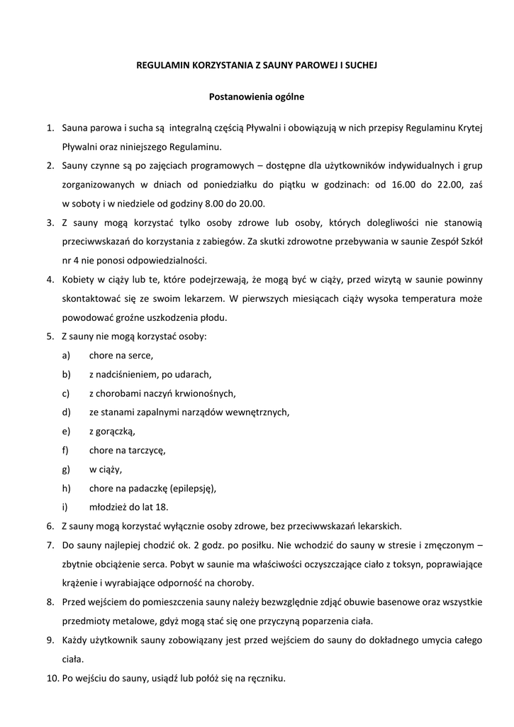REGULAMIN KORZYSTANIA Z SAUNY PAROWEJ I SUCHEJ Postanowienia ogólne 1. Sauna parowa i sucha są integralną częścią Pływalni i obowiązują w nich przepisy Regulaminu Krytej Pływalni oraz niniejszego Regulaminu. 2. Sauny czynne są po zajęciach programowych – dostępne dla użytkowników indywidualnych i grup zorganizowanych w dniach od poniedziałku do piątku w godzinach: od 16.00 do 22.00, zaś w soboty i w niedziele od godziny 8.00 do 20.00. 3. Z sauny mogą korzystać tylko osoby zdrowe lub osoby, których dolegliwości nie stanowią przeciwwskazań do korzystania z zabiegów. Za skutki zdrowotne przebywania w saunie Zespół Szkół nr 4 nie ponosi odpowiedzialności. 4. Kobiety w ciąży lub te, które podejrzewają, że mogą być w ciąży, przed wizytą w saunie powinny skontaktować się ze swoim lekarzem. W pierwszych miesiącach ciąży wysoka temperatura może powodować groźne uszkodzenia płodu. 5. Z sauny nie mogą korzystać osoby: a) chore na serce, b) z nadciśnieniem, po udarach, c) z chorobami naczyń krwionośnych, d) ze stanami zapalnymi narządów wewnętrznych, e) z gorączką, f) chore na tarczycę, g) w ciąży, h) chore na padaczkę (epilepsję), i) młodzież do lat 18. 6. Z sauny mogą korzystać wyłącznie osoby zdrowe, bez przeciwwskazań lekarskich. 7. Do sauny najlepiej chodzić ok. 2 godz. po posiłku. Nie wchodzić do sauny w stresie i zmęczonym – zbytnie obciążenie serca. Pobyt w saunie ma właściwości oczyszczające ciało z toksyn, poprawiające krążenie i wyrabiające odporność na choroby. 8. Przed wejściem do pomieszczenia sauny należy bezwzględnie zdjąć obuwie basenowe oraz wszystkie przedmioty metalowe, gdyż mogą stać się one przyczyną poparzenia ciała. 9. Każdy użytkownik sauny zobowiązany jest przed wejściem do sauny do dokładnego umycia całego ciała. 10. Po wejściu do sauny, usiądź lub połóż się na ręczniku. 11. Nie wolno korzystać z sauny pod wpływem alkoholu lub innych środków odurzających. 12. Na terenie sauny zabrania się: a) wchodzenia na elementy konstrukcyjne sauny nieprzeznaczone do tego celu, b) dotykania i manipulowania przy urządzeniach elektryczno - grzewczych, c) wnoszenia alkoholu, d) palenia tytoniu, palenia e-papierosów i używania innych środków odurzających, e) wnoszenia jedzenia, f) niszczenia i uszkadzania wyposażenia, g) nieobyczajnego zachowania bądź zachowania uznanego społecznie za nieprzyzwoite lub obraźliwe, h) robienia zdjęć. 13. Po wyjściu z sauny należy schłodzić ciało. 14. Po schłodzeniu należy odpocząć i uzupełnić poziom płynów w organizmie wodą mineralną lub sokiem. 15. W saunie nie należy przebywać w okularach i szkłach kontaktowych. 16. W czasie i po pobycie w saunie przeciwwskazane jest podejmowanie wysiłku fizycznego. 17. W pomieszczeniu wypoczynku po saunie zabrania się przebywania nago . 18. Wszelkie zmiany samopoczucia, wskazujące na nietolerancję zabiegu w saunie, należy niezwłocznie zgłosić obsłudze Obiektu. KORZYSTANIE Z SAUNY PAROWEJ 1. Jedno wejście do sauny powinno trwać ok. 5-15 minut, a całkowity czas nie powinien przekraczać 30 minut dziennie np. 2 x 15 min. lub 3 x 10 min. Liczba wejść do sauny: 2-3 dla dorosłych. 2. Do korzystania z sauny należy zaopatrzyć się w obuwie typu klapki, mydło oraz dwa ręczniki; jeden służy do wycierania się drugi jako podkładka na ławę. 3. Sauna parowa (tzw. łaźnia rzymska) to sauna o wilgotności dochodzącej do 100% lecz niższej temperaturze: 40-50°C. 4. W czasie przebywania w saunie parowej nie wolno smarować ciała lub twarzy żadnymi kremami, gdyż powoduje to zmniejszenie powierzchni ciała, która wydala pot. 5. Przed wejściem do kabiny parowej należy się zapoznać z Regulaminem oraz przeciwwskazaniami do korzystania z usługi kąpieli w saunie parowej. 6. W kabinie sauny parowej może przebywać jednocześnie 8 osób. 7. W kabinie sauny zaleca się używanie ręcznika. Ręcznik powinien być rozłożony tak, aby żadna część ciała nie stykała się z powierzchnią ławy. KORZYSTANIE Z SAUNY SUCHEJ 1. W kabinie sauny zaleca się używanie ręcznika. Ręcznik powinien być rozłożony tak, aby żadna część ciała nie stykała się z powierzchnią drewnianą. 2. W kabinie sauny może przebywać jednocześnie 5 osób. 3. Jeden cykl kąpieli trwa około 25 minut : 8 – 12 minut przebywania w gorącym pomieszczeniu, a następnie 8 – 12 minut stopniowe ochładzanie ciała wodą ( w cyklu drugim i trzecim przebywanie w gorącym pomieszczeniu nie powinno być dłuższe niż 10 minut ). 4. W czasie przebywania w saunie suchej nie wolno smarować ciała lub twarzy żadnymi kremami, gdyż powoduje to zmniejszenie powierzchni ciała, która wydala pot. W celu przystosowania układu krążenia do prawidłowego funkcjonowania w pozycji stojącej, wskazane jest w ostatnich 2 – 3 minutach przebywania w saunie przyjęcie pozycji siedzącej z opuszczonymi nogami. 5. Po saunie należy wypocząć około 20 – 30 minut. Celowe jest picie w umiarkowanych ilościach (około 0,5 – 1 l ) wód mineralnych lub soków. PRZECIWWSKAZANIA DO KORZYSTANIA Z SAUNY PAROWEJ I SUCHEJ a) reumatoidalne: w ostrym stanie reumatycznym, b) pulmonologiczne: infekcje: przeziębienie, gruźlica, ostry stan astmatyczny, c) kardiologia: niewydolność serca, krążenia i wieńcowa ze stenokardią spoczynkową, i inne choroby serca (najlepiej korzystać po konsultacji z lekarzem), d) inne: ostre stany zapalne, wrzody, guzy, ogniska zakażenia (np. przy bólu zęba), choroby weneryczne, epilepsja, jaskra, daltonizm i inne (wskazana jest konsultacja z lekarzem). UWAGA: W PRZYPADKU JAKICHKOLWIEK POGORSZENIA WĄTPLIWOŚCI SAMOPOCZUCIA ZDROWOTNYCH PODCZAS NALEŻY POBYTU SKONSULTOWAĆ W SAUNIE SIĘ Z LUB LEKARZEM. REGULAMIN SAUNY PAROWEJ I SUCHEJ jest integralną częścią REGULAMINU KORZYSTANIA Z KRYTEJ PŁYWALNI przy Zespole Szkół nr 4.