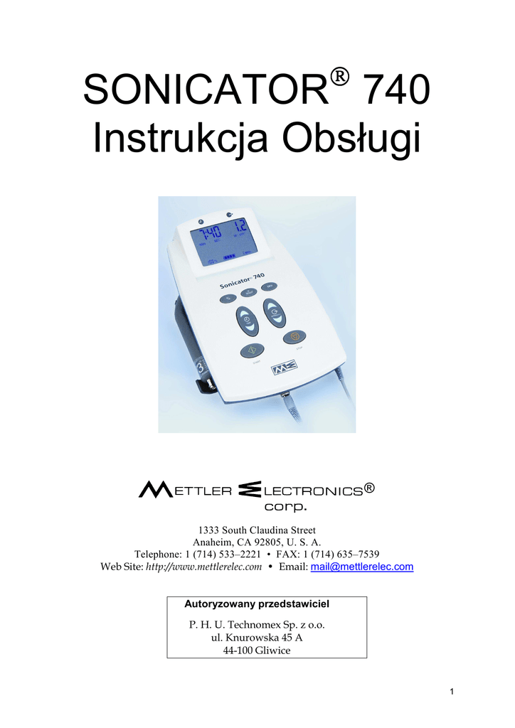 SONICATOR 740 Instrukcja Obsługi ® 1333 South Claudina Street Anaheim, CA 92805, U. S. A. Telephone: 1 (714) 533–2221 • FAX: 1 (714) 635–7539 Web Site: http://www.mettlerelec.com • Email: [email protected] Autoryzowany przedstawiciel P. H. U. Technomex Sp. z o.o. ul. Knurowska 45 A 44-100 Gliwice 1 Mettler Electronics Corp. Sonicator 740 Instrukcja Obsługi Spis Treści Rozdział Tytuł Strona 1 1.1 1.2 1.3 1.4 1.5 1.6 Wstęp Wstęp .................................................................................................................................... Wstęp do Instrukcji obsługi............................................................................................... Wskazówki bezpieczeństwa................................................................................................ Uwaga ...................................... ............................................................................................ Uszkodzenia w czasie transportu ....................................................................................... Zawartość opakowania ....................................................................................................... 4 5 5 5 5 6 6 2 2.1 2.2 Objaśnienia symboli i skrótów Objaśnienia symboli .......................................................................................................... Lista skrótów .................................................................................................................. 7 7 8 3 Instalacja 9 4 4.1 4.2 Instrukcja obsługi Ogólna instrukcja obsługi ................................................................................................... Terapia kombinowana z zastosowaniem urządzenia Sonicator 740 ................................ 11 13 14 5 5.1 5.2 5.3 Wskazania, przeciwwskazania i środki ostroŜności Wskazania ........................................................................................................................... Przeciwwskazania............................................................................................................... Środki ostroŜności .............................................................................................................. 16 16 16 16 6 6.1 6.2 6.3 Konserwacja i naprawa Czyszczenie urządzenia Sonicator 740................................................................................ Rutynowa konserwacja....................................................................................................... Naprawa urządzenia Sonicator 740 ..................................................................................... 18 18 18 18 7 7.1 7.2 7.3 Zasada działania Wprowadzenie do ultradźwięków ..................................................................................... Poziomy energii.................................................................................................................. Fale ciągłe i pulsowe .......................................................................................................... 20 20 22 23 8 Piśmiennictwo 24 9 9.1 9.2 9.3 Właściwości techniczne 25 Właściwości ogólne................................................................................................................... 25 Właściwości generatora ultradźwięków.............................................................................. 25 Właściwości aplikatorów..................................................................................................... 28 10 10.1 10.2 Akcesoria Informacje o zamówieniach............................................................................................... Akcesoria do urządzenia Sonicator 740 .............................................................................. 30 30 30 Dodatek Deklaracja zgodności ........................................................................................................... 31 2 Mettler Electronics Corp. Sonicator 740 Instrukcja Obsługi Spis Rycin No. Tytuł Strona 1.1 Sonicator 740 oraz dostępne aplikatory 4 3.1 Ściana tylna urządzenia —wyłącznik zasilania, gniazdo dla kabla zasilającego, złącze dla terapii kombinowanej i uchwyt dla aplikatora lcm2 10 3.2 Widok z przodu – podłączenie kabla aplikatora 10 33 Widok z boku —Uchwyt dla aplikatora z ruchomym magnesem i haczykiem 10 3.4 Widok z dołu—Pokrywa baterii 11 3.5 Instalacja baterii Podłączanie aplikatora do uniwersalnego kabla aplikatora, ustawić bolce naprzeciwko otworów, 11 cały czas wywierając nacisk obrócić pierścień o ¼ obrotu w kierunku ruchu wskazówek zegara. 13 4.1 Panel kontrolny i wyświetlacz 12 4.2 Połączenia do terapii kombinowanej – złącze o kształcie banana oznaczono symbolem 15 4.3 Przykład terapii kombinowanej 15 7.1 Absorpcja ultradźwięków, skóra. 20 7.2 Absorpcja ultradźwięków, tkanka tłuszczowa 20 7.3 Absorpcja ultradźwięków, mięśnie w wiązce ultradźwięków prostopadłej do przebiegu włókien 3.6 mięśniowych 20 7.4 Absorpcja ultradźwięków, kość 21 7.5 Fale dźwiękowe wysokiej częstotliwości 21 7.6 Techniki aplikacji ultradźwięków 22 7.7 Technika zabiegu podwodnego 22 7.8 RóŜnice pomiędzy przetwornikami 22 9.1 Kształt impulsu 10% 26 9.2 Kształt impulsu 20% 26 9.3 Kształt impulsu 50% 27 9.4 Impuls ciągły 9.5 9.6 9.7 9.8 27 2 Trójwymiarowy wzorzec wiązki dla aplikatora 10 cm (1 MHz) 28 2 28 2 28 2 28 Trójwymiarowy wzorzec wiązki dla aplikatora 5 cm (1 MHz) Trójwymiarowy wzorzec wiązki dla aplikatora 5 cm (3,2 MHz) Trójwymiarowy wzorzec wiązki dla aplikatora 1 cm (3,3 MHz) 3 Mettler Electronics Corp. Sonicator 740 Instrukcja Obsługi Rozdział 1: 1.1 Wstęp Wprowadzenie Dziękujemy za zakup urządzenia ultradźwiękowego Sonicator 740 wyprodukowanego przez Mettler Electronics Corp. Sterowany mikroprocesorem Sonicator 740 jest urządzeniem ultradźwiękowym łatwym w uŜytkowaniu, skutecznym i 