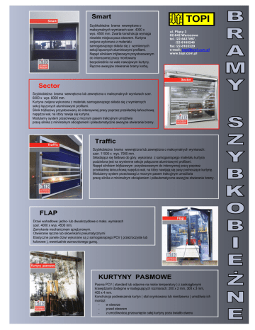 Smart Szybkobieżna brama wewnętrzna o maksymalnych wymiarach szer. 4000 x wys. 4500 mm. Zwarta konstrukcja wymaga niewiele miejsca poza otworem. Kurtyna zwijana wykonana z materiału samogasnącego składa się z wymiennych sekcji łączonych aluminiowymi profilami. Napęd silnikiem trójfazowym przystosowanym do intensywnej pracy montowany bezpośrednio na wale nawojowym kurtyny. Ręczne awaryjne otwieranie bramy korbą. TOPI ul. Pląsy 3 02-842 Warszawa tel. /22-6437897, /22-8165246 fax /22-8165229 e-mail: [email protected] www.topi.com.pl Sector Szybkobieżna brama wewnętrzna lub zewnętrzna o maksymalnych wymiarach szer. 6000 x wys. 6000 mm. Kurtyna zwijana wykonana z materiału samogasnącego składa się z wymiennych sekcji łączonych aluminiowymi profilami. Silnik trójfazowy przystosowany do intensywnej pracy poprzez przekładnię łańcuchową napędza wał, na który nawija się kurtyna. Modularny system przeciwwagi z mocnym pasem trakcyjnym umożliwia pracę silnika z minimalnym obciążeniem i półautomatyczne awaryjne otwieranie bramy. Traffic Szybkobieżna brama wewnętrzna lub zewnętrzna o maksymalnych wymiarach: szer. 11000 x wys. 7000 mm. Składająca się fałdowo do góry, wykonana z samogasnącego materiału kurtyna podzielona jest na wymienne sekcje połączone aluminiowymi profilami. Napęd silnikiem trójfazowym przystosowanym do intensywnej pracy poprzez przekładnię łańcuchową napędza wał, na który nawijają się pasy podnoszące kurtynę. Modularny system przeciwwagi z mocnym pasem trakcyjnym umożliwia pracę silnika z minimalnym obciążeniem i półautomatyczne awaryjne otwieranie bramy. FLAP Drzwi wahadłowe: jedno- lub dwuskrzydłowe o maks. wymiarach szer. 4000 x wys. 4500 mm. Zamykanie mechanizmem sprężynowym. Otwieranie ręczne lub siłownikami pneumatycznymi Elastyczne panele drzwi wykonane są z samogasnącego PCV ( przeźroczyste lub kolorowe ), ewentualnie wzmocnionego gumą. KURTYNY PASMOWE Pasma PCV ( standard lub odporne na niskie temperatury ) z zaokrąglonymi krawędziami dostępne w następujących rozmiarach: 200 x 2 mm, 300 x 3 mm, 400 x 4 mm. Konstrukcja podwieszenia kurtyn ( stal ocynkowana lub nierdzewna ) umożliwia ich montaż: w otworze przed otworem z umożliwością przesunięcie całej kurtyny poza światło otworu SPECYFIKACJA TECHNICZNA SECTOR Wersja P1, P2, P3, PVC Opis brama szybkobieżna, zwijana z wymiennymi segmentami Zasilanie Natężenie prądu zasilania Moc 3 x 400 V, 50/60 Hz 3A 900 W Rodzaj napędu silnik z przekładnią łańcuchową, przeciwwaga modułowa Prędkość otwierania 0,9 m/s Prędkość zamykania Światło przejazdu ( szer. x wys. ) 0,9 m/s minimalne = 1000 x 1700, maksymalne = 6000 x 6000 mm Typ kurtyny Grubość tkaniny Listwa bezpieczeństwa Otwieranie ręczne Temperatura pracy napędu Wytrzymałość wiatrowa Stopień ochrony moduły z tkaniny poliestrowej lub przeźroczystego PCV łączone wytłaczanymi profilami aluminiowymi tkanina poliestrowa grub. 0,6 mm, przeźroczyste PCV grub. 2,0 mm typ CPA – elektropneumatyczna z czujnikiem ciśnieniowym typ CFA – elektroniczna z samotestującymi fotokomórkami półautomatyczne, po obu stronach kurtyny o o -5 C ÷ + 50 C do 90 km/h IP 55 SECTOR SPECYFIKACJA WYMIAROWA SECTOR KOLORY KURTYN TYPY KURTYN RAL 7038 RAL 1021 RAL 3002 RAL 5002 RAL 5012 RAL 6026 RAL 1015 RAL 9016 RAL 2009 SYSTEMY STEROWANIA I BEZPIECZEŃSTWA SYGNALIZACJA OSTRZEGAWCZA FOTOKOMÓRKI PĘTLA INDUKCYJNA RADAR Zastrzegamy sobie możliwość zmian technicznych oraz programu handlowego PILOT RADIOWY DODATKOWE WYŁĄCZNIKI ZEWNĘTRZNE WYŁĄCZNIK CIĘGNOWY SYGNALIZACJA ŚWIETLNA