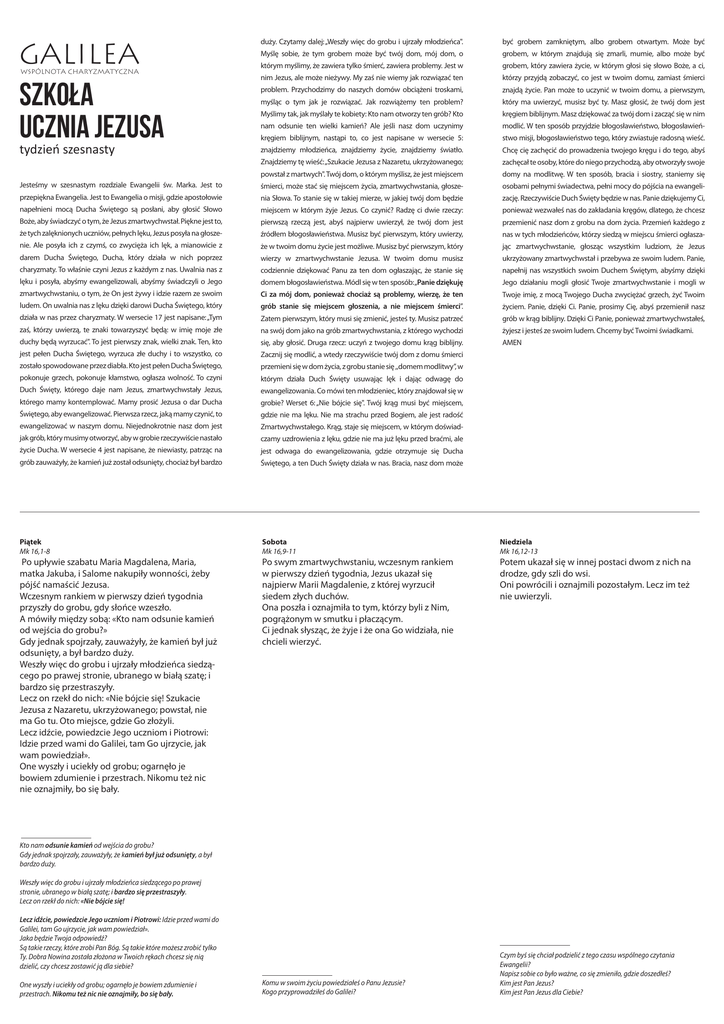 GALILEA wspólnota charyzmatyczna SZkoła Ucznia Jezusa tydzień szesnasty duży. Czytamy dalej: „Weszły więc do grobu i ujrzały młodzieńca". być grobem zamkniętym, albo grobem otwartym. Może być Myślę sobie, że tym grobem może być twój dom, mój dom, o grobem, w którym znajdują się zmarli, mumie, albo może być którym myślimy, że zawiera tylko śmierć, zawiera problemy. Jest w grobem, który zawiera życie, w którym głosi się słowo Boże, a ci, nim Jezus, ale może nieżywy. My zaś nie wiemy jak rozwiązać ten którzy przyjdą zobaczyć, co jest w twoim domu, zamiast śmierci problem. Przychodzimy do naszych domów obciążeni troskami, znajdą życie. Pan może to uczynić w twoim domu, a pierwszym, myśląc o tym jak je rozwiązać. Jak rozwiążemy ten problem? który ma uwierzyć, musisz być ty. Masz głosić, że twój dom jest Myślimy tak, jak myślały te kobiety: Kto nam otworzy ten grób? Kto kręgiem biblijnym. Masz dziękować za twój dom i zacząć się w nim nam odsunie ten wielki kamień? Ale jeśli nasz dom uczynimy modlić. W ten sposób przyjdzie błogosławieństwo, błogosławień- kręgiem biblijnym, nastąpi to, co jest napisane w wersecie 5: stwo misji, błogosławieństwo tego, który zwiastuje radosną wieść. znajdziemy młodzieńca, znajdziemy życie, znajdziemy światło. Chcę cię zachęcić do prowadzenia twojego kręgu i do tego, abyś Znajdziemy tę wieść: „Szukacie Jezusa z Nazaretu, ukrzyżowanego; zachęcał te osoby, które do niego przychodzą, aby otworzyły swoje powstał z martwych". Twój dom, o którym myślisz, że jest miejscem domy na modlitwę. W ten sposób, bracia i siostry, staniemy się Jesteśmy w szesnastym rozdziale Ewangelii św. Marka. Jest to śmierci, może stać się miejscem życia, zmartwychwstania, głosze- osobami pełnymi świadectwa, pełni mocy do pójścia na ewangeli- przepiękna Ewangelia. Jest to Ewangelia o misji, gdzie apostołowie nia Słowa. To stanie się w takiej mierze, w jakiej twój dom będzie zację. Rzeczywiście Duch Święty będzie w nas. Panie dziękujemy Ci, napełnieni mocą Ducha Świętego są posłani, aby głosić Słowo miejscem w którym żyje Jezus. Co czynić? Radzę ci dwie rzeczy: ponieważ wezwałeś nas do zakładania kręgów, dlatego, że chcesz Boże, aby świadczyć o tym, że Jezus zmartwychwstał. Piękne jest to, pierwszą rzeczą jest, abyś najpierw uwierzył, że twój dom jest przemienić nasz dom z grobu na dom życia. Przemień każdego z że tych zalęknionych uczniów, pełnych lęku, Jezus posyła na głosze- źródłem błogosławieństwa. Musisz być pierwszym, który uwierzy, nas w tych młodzieńców, którzy siedzą w miejscu śmierci ogłasza- nie. Ale posyła ich z czymś, co zwycięża ich lęk, a mianowicie z że w twoim domu życie jest możliwe. Musisz być pierwszym, który jąc zmartwychwstanie, głosząc wszystkim ludziom, że Jezus darem Ducha Świętego, Ducha, który działa w nich poprzez wierzy w zmartwychwstanie Jezusa. W twoim domu musisz ukrzyżowany zmartwychwstał i przebywa ze swoim ludem. Panie, charyzmaty. To właśnie czyni Jezus z każdym z nas. Uwalnia nas z codziennie dziękować Panu za ten dom ogłaszając, że stanie się napełnij nas wszystkich swoim Duchem Świętym, abyśmy dzięki lęku i posyła, abyśmy ewangelizowali, abyśmy świadczyli o Jego domem błogosławieństwa. Módl się w ten sposób: „Panie dziękuję Jego działaniu mogli głosić Twoje zmartwychwstanie i mogli w zmartwychwstaniu, o tym, że On jest żywy i idzie razem ze swoim Ci za mój dom, ponieważ chociaż są problemy, wierzę, że ten Twoje imię, z mocą Twojego Ducha zwyciężać grzech, żyć Twoim ludem. On uwalnia nas z lęku dzięki darowi Ducha Świętego, który grób stanie się miejscem głoszenia, a nie miejscem śmierci”. życiem. Panie, dzięki Ci. Panie, prosimy Cię, abyś przemienił nasz działa w nas przez charyzmaty. W wersecie 17 jest napisane: „Tym Zatem pierwszym, który musi się zmienić, jesteś ty. Musisz patrzeć grób w krąg biblijny. Dzięki Ci Panie, ponieważ zmartwychwstałeś, zaś, którzy uwierzą, te znaki towarzyszyć będą: w imię moje złe na swój dom jako na grób zmartwychwstania, z którego wychodzi żyjesz i jesteś ze swoim ludem. Chcemy być Twoimi świadkami. duchy będą wyrzucać". To jest pierwszy znak, wielki znak. Ten, kto się, aby głosić. Druga rzecz: uczyń z twojego domu krąg biblijny. AMEN jest pełen Ducha Świętego, wyrzuca złe duchy i to wszystko, co Zacznij się modlić, a wtedy rzeczywiście twój dom z domu śmierci zostało spowodowane przez diabła. Kto jest pełen Ducha Świętego, przemieni się w dom życia, z grobu stanie się ,,domem modlitwy”, w pokonuje grzech, pokonuje kłamstwo, ogłasza wolność. To czyni którym działa Duch Święty usuwając lęk i dając odwagę do Duch Święty, którego daje nam Jezus, zmartwychwstały Jezus, ewangelizowania. Co mówi ten młodzieniec, który znajdował się w którego mamy kontemplować. Mamy prosić Jezusa o dar Ducha grobie? Werset 6: „Nie bójcie się". Twój krąg musi być miejscem, Świętego, aby ewangelizować. Pierwsza rzecz, jaką mamy czynić, to gdzie nie ma lęku. Nie ma strachu przed Bogiem, ale jest radość ewangelizować w naszym domu. Niejednokrotnie nasz dom jest Zmartwychwstałego. Krąg, staje się miejscem, w którym doświad- jak grób, który musimy otworzyć, aby w grobie rzeczywiście nastało czamy uzdrowienia z lęku, gdzie nie ma już lęku przed braćmi, ale życie Ducha. W wersecie 4 jest napisane, że niewiasty, patrząc na jest odwaga do ewangelizowania, gdzie otrzymuje się Ducha grób zauważyły, że kamień już został odsunięty, chociaż był bardzo Świętego, a ten Duch Święty działa w nas. Bracia, nasz dom może Piątek Mk 16,1-8 Sobota Mk 16,9-11 Niedziela Mk 16,12-13 Po upływie szabatu Maria Magdalena, Maria, matka Jakuba, i Salome nakupiły 