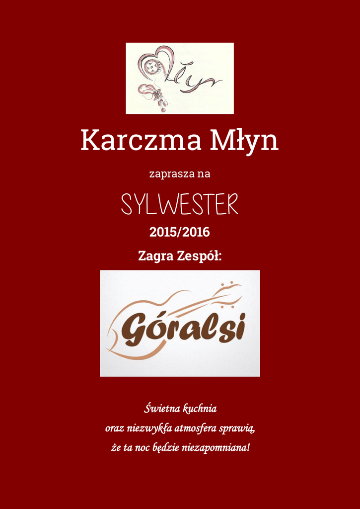 Karczma Młyn zaprasza na SYLWESTER 2015/2016 Zagra Zespół: Świetna kuchnia oraz niezwykła atmosfera sprawią, że ta noc będzie niezapomniana! Menu Sylwestrowe Kolacja * Krem borowikowy skropiony oliwą truflową * * Pierś z kaczki oraz polędwiczki wieprzowe w aromatycznych sosach wraz z ziemniakami purée i wyśmienitymi surówkami * * Tradycyjny Sernik * Pierwsze Danie Gorące * Schab ze śliwką z pieczonymi ziemniakami oraz buraczkami z chrzanem * Drugie Danie Gorące * Bogracz po Kamienicku * Zimna płyta * Wędliny z naszej wędzarni, sery, galaretki, sałatki, owoce oraz ryby * Stół Młyński * Szynka z kością, kiełbasy, mięsa na zimno, dodatki * Na stołach * Napoje zimne, napoje gazowane, soki, słodycze * Alkohol BEZ OGRANICZEŃ Sprzedaż biletów w Karczmie lub na konto bankowe BS Limanowa O Kamienica 60 8804 0000 0030 0307 0820 0001 Cena za osobę 250zł Karczma Młyn * Kamienica 368 * tel. 18 3323 020 * www.karczmamlyn.pl