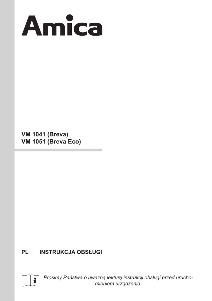VM 1041 (Breva) VM 1051 (Breva Eco) PL INSTRUKCJA OBSŁUGI Prosimy Państwa o uważną lekturę instrukcji obsługi przed uruchomieniem urządzenia. SZANOWNY KLIENCIE Odkurzacz Amica to połączenie wyjątkowej łatwości obsługi i doskonałej efektywności. Po przeczytaniu niniejszej instrukcji, obsługa odkurzacza nie będzie problemem. Prosimy Państwa o uważną lekturę instrukcji obsługi przed uruchomieniem urządzenia. Przestrzeganie zawartych w niej wskazówek uchroni Państwa przed niewłaściwym użytkowaniem. Instrukcję należy zachować i przechowywać tak, aby mieć ją zawsze pod ręką. Należy dokładnie przestrzegać instrukcji obsługi w celu uniknięcia nieszczęśliwych wypadków. Spis treści Wskazówki dotyczące bezpieczeństwa użytkowania Opis wyrobu Obsługa Czyszczenie i konserwacja Gwarancja, obsługa posprzedażna Karta produktu Urządzenie przeznaczone jest wyłącznie do użytku domowego. Producent zastrzega sobie możliwość dokonywania zmian niewpływających na działanie urządzenia. 2 3 7 8 9 10 11 WSKAZÓWKI DOTYCZĄCE BEZPIECZEŃSTWA UŻYTKOWANIA Uwaga! Aby zminimalizować ryzyko powstania pożaru, porażenia prądem lub uszkodzenia ciała: l Uważnie przeczytaj tą instrukcję przed użytkowaniem urządzenia. l Dzieci nie zdają sobie sprawy z niebezpieczeństw, które mogą powstać podczas używania urządzeń elektrycznych; dlatego trzymaj urządzenie poza zasięgiem dzieci. l Nie zanurzaj korpusu urządzenia w wodzie lub innych cieczach. Zanurzenie w wodzie może spowodować porażenie prądem elektrycznym. l W przypadku zalania wodą zewnętrznych elementów urządzenia, przed ponownym włączeniem urządzenia do sieci dokładnie je wysusz. Nie dotykaj mokrych powierzchni mających kontakt z podłączonym do zasilania urządzeniem, należy natychmiast odłączyć je od zasilania. l Nie używaj urządzenia, jeżeli wykazuje ono jakiekolwiek oznaki uszkodzenia przewodu przyłączeniowego lub jeżeli urządzenie zostało upuszczone na podłogę. l Po użyciu zawsze wyciągaj wtyczkę z gniazdka a także w przypadku jakiegokolwiek niewłaściwego działania, przed czyszczeniem lub przed wymianą akcesoriów. l Przy wyciąganiu wtyczki z gniazdka ściennego nigdy nie ciągnij za przewód tylko za wtyczkę jednocześnie trzymając drugą ręką gniazdko sieciowe l Urządzenie jest wykonane w II klasie ochrony przeciwporażeniowej. l Nie próbuj usuwać żadnych części obudowy. l Aby uniknąć uszkodzenia przewodu zasilającego nie umieszczaj go ponad ostrymi krawędziami, ani w pobliżu gorących powierzchni. l Nie wystawiaj urządzenia na deszcz lub wilgoć i nie używaj urządzenia na zewnątrz. Nie obsługuj urządzenia mokrymi rękoma. 3 WSKAZÓWKI DOTYCZĄCE BEZPIECZEŃSTWA UŻYTKOWANIA Jeżeli przewód sieciowy lub wtyczka ulegną uszkodzeniu, to powinny one być wymienione przez specjalistyczny zakład naprawczy w celu uniknięcia zagrożenia. l Używanie akcesoriów, które nie zostały dostarczone wraz z produktem może doprowadzić do uszkodzenia urządzenia. l Nigdy nie stawiaj urządzenia na gorących powierzchniach. l Nigdy nie zostawiaj urządzenia podłączonego do sieci bez nadzoru. l Niniejszy sprzęt nie jest przeznaczony do użytkowania przez osoby (w tym dzieci) o ograniczonej zdolności fizycznej, czuciowej lub psychicznej, lub osoby o braku doświadczenia lub znajomości sprzętu, chyba że odbywa się to pod nadzorem lub zgodnie z instrukcją użytkowania sprzętu, przekazaną przez osoby odpowiadające za ich bezpieczeństwo. Należy zwracać uwagę na dzieci, by nie bawiły się urządzeniem l Wyciągaj wtyczkę z gniazda sieciowe przed zmianą akcesoriów. l To urządzenie może być używane przez dzieci w wieku 8 lat i starsze, przez osoby o ograniczonej zdolności fizycznej, czuciowej lub psychicznej oraz osoby o braku doświadczenia lub znajomości sprzętu, gdy są one nadzorowane lub zostały poinstruowane na temat korzystania z urządzenia w sposób bezpieczny i znają zagrożenia związana z użytkowaniem urządzenia. Dzieci nie powinny bawić się urządzeniem. Czyszczenie i konserwacja urządzenia nie powinna być wykonywania przez dzieci chyba że ukończyły 8 lat i są nadzorowane przez odpowiednią osobę. l Nie ciągnij odkurzacza ani nie przenoś go trzymając za przewód, nie używaj przewodu jako uchwytu, nie zamykaj drzwi przytrzaskując przewód i nie przeciągaj przewodu nad ostrymi krawędziami. Uważaj, aby odkurzacz nie przejeżdzał po przewodzie. l 4 WSKAZÓWKI DOTYCZĄCE BEZPIECZEŃSTWA UŻYTKOWANIA Nie wkładaj żadnych przedmiotów w otwory w odkurzaczu. Nie używaj odkurzacza, kiedy jakikolwiek otwór jest zablokowany, pozbywaj się kurzu, kłaczków, włosów i wszystkiego, co może zredukować przepływ powietrza. l Trzymaj włosy, luźne części ubrania, palce i inne części ciała z daleka od otworów i części ruchomych. l Nie używaj odkurzacza do zbierania łatwopalnych substancji, takich jak benzyna i nie używaj go w takich miejscach, gdzie podobne substancje mogą być obecne. l Trzymaj za wtyczkę przy zwijaniu się kabla. Nie pozwól, aby wtyczka była puszczona luzem podczas zwijania. l Nie zbieraj żadnych przedmiotów, które palą się lub dymią, takich jak papierosy, zapałki, lub gorące popioły. l Nie używaj odkurzacza bez założonego worka do kurzu i/lub filtrów. l Jeżeli otwór, który zasysa powietrze,wąż ssący lub rura teleskopowa są zatkane, powinieneś natychmiast wyłączyć odkurzacz. Przed ponownym włączeniem odkurzacza usuń najpierw blokujący przedmiot. l Nie używaj odkurzacza zbyt blisko grzejników, kaloryferów, niedopałków papierosów itp. l Zanim włączysz wtyczkę do gniazdka sieciowego, upewnij się, czy masz suche ręce. l Zanim zaczniesz używać odkurzacz, usuń ostre przedmioty z podłogi, aby uniknąć uszkodzenia worka na kurz. l Nie odkurzaj drobnych pyłów jak: mąka, gips, tonery drukarek itp., gdyż może to doprowadzić d