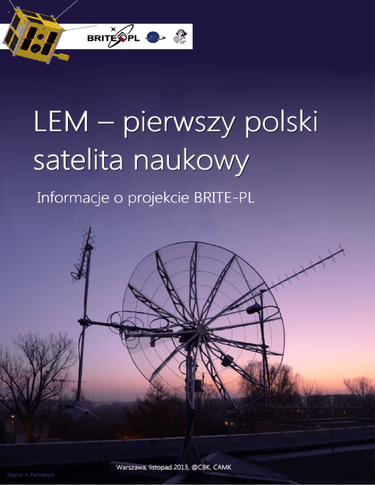 LEM – pierwszy polski satelita naukowy Informacje o projekcie BRITEBRITE-PL Warszawa, listopad 2013, @CBK, CAMK Zdjęcie: A. Pamiatnych Spis treści 1. Krótka notatka .................................................................................................................................................... 2 2. Dane kontaktowe dla mediów........................................................................................................................ 3 3. Informacje ogólne o projekcie BRITE-PL ...................................................................................................... 3 4. BRITE-PL LEM ...................................................................................................................................................... 5 5. Budowa satelity LEM w CBK ............................................................................................................................ 6 6. Cel naukowy........................................................................................................................................................ 9 7. Data i godzina startu ...................................................................................................................................... 10 8. Miejsce startu .................................................................................................................................................. 11 9. Rakieta - Dniepr............................................................................................................................................... 12 10. Profil lotu rakiety Dniepr............................................................................................................................... 14 11. Parametry orbity ............................................................................................................................................. 14 12. Stacja Naziemna w CAMKu........................................................................................................................... 15 13. Pozostałe satelity wystrzeliwane wraz z LEMem .................................................................................... 16 14. CBK ..................................................................................................................................................................... 17 15. CAMK ................................................................................................................................................................. 19 16. Linki .................................................................................................................................................................... 20 1. Krótka notatka Już nad naszymi głowami po biegunowej orbicie krąży pierwszy polski satelita naukowy BRITE-PL LEM, którego imię nadano na cześć polskiego pisarza. Rakieta nośna Dniepr umieściła polski ładunek na niskiej orbicie okołoziemskiej w czwartek 21 listopada 2013 r. godz. 8:10:11 naszego czasu (środkowoeuropejskiego CET). LEM obiega Ziemię około 14,5 razy na dobę, a ze swojej podróży sześć razy dziennie będzie zdawał raporty do stacji sterowania w CAMKu w Warszawie. Do tej pory miało miejsce kilka kontaktów z LEMem, w czasie których ściągnięto istotną telemetrię i potwierdzono, że satelita jest w dobrej kondycji. Przesłał on parametry informujące dokładnie o swoim stanie. Jego temperatura i napięcie są w normie, komputer działa. Przy każdym przelocie są włączane kolejne elementy i potwierdzana jest ich kondycja. W dniu dzisiejszym rozpoczęto planowany odbiór funkcjonalny satelity na orbicie. Należy podkreślić, iż możliwości nadawania i odbioru sygnału do/z satelity ze stacji naziemnej w Warszawie występują wtedy, gdy znajduje się on w jej zasięgu. Z uwagi na konfigurację orbity dogodne warunki pojawiają się dwa razy dziennie: podczas przelotów porannych i wieczornych. Zapraszamy do śledzenia strony http://www.brite-pl.pl z aktualnymi informacjami o stanie satelity LEM. LEM to pierwszy z dwóch polskich satelitów wchodzących w skład sześciu obiektów międzynarodowej konstelacji BRITE. Satelita powstał w ramach projektu BRITE-PL realizowanego przez "Polskie Konsorcjum Projektu BRITE", w skład którego wchodzi Centrum Badań Kosmicznych PAN oraz Centrum Astronomicznego im. M. Kopernika PAN. LEM był montowany w laboratoriach Centrum Badań Kosmicznych PAN od 2010 roku. Jego budowa trwała kilkanaście miesięcy i została ukończona w grudniu 2011 roku. Przez prawie dwa następne lata satelita przechowywany był w czystym pomieszczeniu w ściśle kontrolowanych warunkach (w tzw. "clean roomie") i oczekiwał na start. Przez cały ten czas regularnie pracował i był poddawany testom funkcjonalnym. Bezpośrednie przygotowania satelity BRITE-PL LEM do startu rozpoczęły się 22 września 2013 wraz z oficjalnym przekazaniem satelity do projektanta (SFL – University of Toronto), gdzie dokonano końcowych testów sprawności. Łączność z polskim satelitą jest realizowana poprzez stację naziemną znajdującą się w CAMK. Stąd są wysyłane komendy do satelity i tutaj też są odbierane dane operacyjne i naukowe misji. Już za kilka miesięcy oko teleskopu wypatrywać będzie najjaśniejszych gwiazd mierząc ich zmiany jasności. Misja naukowa satelity ma na celu mierzenie z dużą dokładnością niewielkich zmian jasności gwiazd. Zmiany jasności dostarczą informacji o rozmiarze, wieku a także składzie chemicznym gwiazdy. Na tej podstawie astrofizycy będą mogli zweryfikować obecne modele budowy wewnętrznej najjaśniejszych gwiazd. Z Ziemi przeprowadzenie równie dokładnych obserwacji jest niemożliwe z uwagi na zakłócający wpływ ziemskiej atmosfery oraz brak możliwości ciągłej obserwacji. Cały projekt aparaturowy BRITE-PL jest finansowany poprzez FNiTP na podstawie decyzji Ministra N