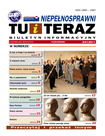 ISSN 1895 – 4987 NIEPEŁNOSPRAWNI TU i TERAZ B I U L E T Y N I N F O R M A C Y J N Y PAŹDZIERNIK EGZEMPLARZ BEZPŁATNY 2/41/2011 W NUMERZE: O nas w kraju i na świecie strona Z naszych stron 2 strona 3 Nasze prawo, nasze prawa strona 5 My w popkulturze strona 6 (Nie)zwykłe życie strona 8 Nowinki medyczne strona 10 W świecie paragrafów strona 18 Nasz Partner strona 19 strona 23 strona 24 Nasze sprawy Kultura Przeczytaj Fot. E. Gronostaj 10 lat minęło jak... 2 dni strona 12 Przez sztukę poznaje świat strona 20 i przekaż innym O nas w kraju i na świecie JAK NIETOPERZ Mieszkający w Kalifornii Daniel Kish nie widzi, a mimo to sprawnie jeździ na rowerze. Nauczył się sztuki, którą opanowały delfiny i nietoperze, zwanej echolokacją. Wydaje dźwięki przypominające klikanie. Na podstawie ich echa potrafi rozpoznać co go otacza. Umie rozróżnić budynki, drzewa, kolumny, nawet dostrzec balkony. Zdobytych umiejętności nie trzyma w tajemnicy, lecz uczy innych. Jego zamiarem jest rzucanie wyzwań każdemu ograniczeniu, jakie ludzie sami na siebie nakładają. PIES DLA NIEDOSŁYSZĄCYCH Labrador Pefo jest pierwszym w Polsce psem pomagającym osobie z niepełnosprawnością narządu słuchu. Sygnalizuje określone dźwięki, takie jak pukanie, dzwonek do drzwi, budzik czy sygnały alarmowe. Poinformuje też właściciela, gdy ktoś go zawoła. Potrafi wezwać pomoc w sytuacji kryzysowej, kiedy jego opiekun źle się poczuje, a także przyniesie telefon, gdy usłyszy dźwięk przychodzącego SMS. Psa wyszkoliła Fundacji DOGIQ. DŹWIĘKOWA TABLICA MENDELEJEWA Układ okresowy pierwiastków, czyli tablica Mendelejewa to coś, z czym osoby widzące spotykają się niemal na co dzień. Dla niewidzących jest jednak niedostępna. Stąd w Polskim Radiu Rzeszów zrodził się pomysł „pokazania” układu okresowego dźwiękami. Na tablicy znajdzie się 112 pierwiastków. Informacje o każdym z nich przeczyta lektor, a w ich rolach wystąpią dziennikarze. Będą podawać polską i łacińską nazwę, symbol, a także liczbę i masę atomową oraz gęstość. Pierwiastki będące metalami wyczytywać ma mężczyzna, a niemetale – kobieta. Szum powietrza, plusk wody lub stukot poinformują czy dany pierwiastek jest gazem, cieczą, czy ciałem stałym. Układ będzie dostępny na stronie audycji Radiolatorium Radia Rzeszów. NIEWIDOMI ZA KÓŁKIEM Trzydziestu niewidomych i niedowidzących wzięło udział w jazdach próbnych, zorganizowanych na torze testowym przy centrum projektowania samochodów Forda w Merkenich w Niemczech, udowadniając, że nie ma rzeczy niemożliwych. Z pomocą profesjonalnych instruktorów członkowie grupy mogli doświadczyć szybkiej jazdy zarówno na prostym odcinku drogi, osiągając nawet 120 km/h, jak również na zakrętach. Oprócz dostarczenia niezapomnianych przeżyć, spotkanie miało także pomóc niewidomym zrozumieć mechanizm działania samochodów w ruchu ulicznym, aby ułatwić im funkcjonowanie na co dzień. Osoby z zaburzeniami widzenia orientują się bowiem w otoczeniu na podstawie usłyszanych dźwięków, jednak często trudno im ocenić rozmiary auta i jego prędkość. Po zakończeniu kursu instruktorzy przyznali, że niewidomi radzą sobie lepiej w niektórych sytuacjach za kółkiem, niż kursanci bez wady wzroku. Opracował GEL NIEPEŁNOSPRAWNI TU i TERAZ B I U L E T Y N I N F O R M A C Y J N Y DOFINANSOWANY ZE ŚRODKÓW PFRON Wydawca: Karkonoski Sejmik Osób Niepełnosprawnych Partner: Stowarzyszenie „Działajmy Razem” – TRIANON PL Redaktor naczelna: Justyna Bytnar, stale współpracują Andrzej Grzelak, Agnieszka Turakiewicz, Ewa Domańska. Adres wydawcy i redakcji: 58-500 Jelenia Góra, ul. Osiedle Robotnicze 47A, tel.: 75 75 242 54, tel./fax 75 75 231 83, e-mail: [email protected] • www.kson.pl Skład i druk: AD REM, 58-500 Jelenia Góra, ul. Okrzei 12, tel. 75 75 222 15 Nakład 2500 egz. Redakcja nie zwraca materiałów nie zamówionych oraz zastrzega sobie prawo do skracania i redakcyjnego opracowania materiałów przyjętych do druku. 2 TU i TERAZ Z naszych stron CO W KSON-ie PISZCZY…? W czerwcu br. Sejmik przystąpił do realizacji kolejnego zadania publicznego z zakresu rehabilitacji zawodowej i społecznej osób niepełnosprawnych. Jest ono swoistym wstępem i narzędziem diagnostycznym, które zamierzamy wykorzystać w przyszłości przy realizacji programu – trener pracy. Do udziału w zadaniu zaproszono osoby zainteresowane znalezieniem zatrudnienia zamieszkałe na terenie miasta Jelenia Góra, a także w innych miejscowościach województwa dolnośląskiego. Środki finansowe w wysokości 30000,00 zł. pozyskano z budżetu PFRON, a wkład własny finansowy Sejmiku wynosi 4900,00 zł. W ramach działań promocyjno-rekrutacyjnych rozdystrybuowano 200 szt. broszur informacyjnych, 30 plakatów oraz wyemitowano 3 ogłoszenia prasowe w „Nowinach Jeleniogórskich”. Do udziału w zadaniu ostatecznie zaproszono 41 osób niepełnosprawnych o różnym rodzaju i stopniu niepełnosprawności. W ramach zadania zrealizowano już warsztaty psychologiczne i warsztaty grupowego poradnictwa zawodowego (lipiec – wrzesień). Celem warsztatów jest wypracowanie pozytywnego i adekwatnego do możliwości psychofizycznych poczucia własnej wartości oraz wzrost świadomości własnych kompetencji, a w konsekwencji przygotowanie uczestników do udanego powrotu (wejścia) na rynek pracy. Uczestnicy warsztatów biorą udział w spotkaniach grupy wsparcia, która jest podstawowym czynnikiem wspomagającym aktywność społeczną i zawodową, gdyż powodem niskiej aktywności zawodowej jest nie tylko niewystarczający system aktywizacji zawodowej i pomocy społecznej, lecz także zakorzeniony w tych osobach brak wiary we własne siły i częste nieradzenie sobie w zwykłych kontaktach społecznych. Oprócz spotkań warsztatowych uczestnicy we własnym zakresie organizują wycieczki, ogniska i inne imprezy okolicznościowe. Nowo