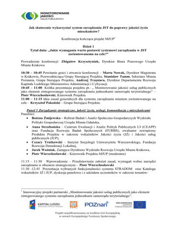 Jak skutecznie wykorzystać system zarządzania JST do poprawy jakości życia mieszkańców? Konferencja kończąca projekt MJUP1 Dzień 1 Tytuł dnia: „Jakie wymagania warto postawić systemowi zarządzania w JST zorientowanemu na cele?” Prowadzenie konferencji: Zbigniew Krzysztyniak, Dyrektor Biura Prasowego Urzędu Miasta Krakowa 10:30 – 10:45 Powitanie gości i otwarcie konferencji – Marta Nowak, Dyrektor Magistratu w Krakowie, Przewodnicząca Grupy Sterującej Projektu, Stanisław Tamm, Sekretarz Miasta Poznania, Grupa Sterująca Projektu, Andrzej Trzęsiara, Dyrektor Departamentu Rozwoju Kapitału Ludzkiego Ministerstwa Administracji i Cyfryzacji 10:45 – 11:00 Krótka prezentacja projektu pt.: „ Monitorowanie jakości usług publicznych jako element zintegrowanego systemu zarządzania jednostkami samorządu terytorialnego” – Piotr Wierzchosławski, Kierownik Projektu. 11:00 – 11:15 Idea zasad generalnych dla systemu zarządzania miastem zorientowanego na cele – Krzysztof Pakoński – Grupa Sterująca Projektu. Panel 1 Zarządzanie strategiczne, jakość życia, usługi, komunikacja z mieszkańcami Paneliści: Bożena Żmijewska – Referat Badań i Analiz Społeczno-Gospodarczych Wydziału Polityki Gospodarczej Urzędu Miasta Gdańska, Anna Strzebońska – Centrum Ewaluacji i Analiz Polityk Publicznych UJ (CEAPP) oraz Fundacja Rozwoju Badań Społecznych (FURBS), ewaluator zewnętrzny Produktu Projektu w zakresie wskaźników Jakości życia (JŻ) i Jakości usług publicznych (JUP), Cezary Trutkowski – Instytut Socjologii Uniwersytetu Warszawskiego, Fundacja Rozwoju Demokracji Lokalnej, Jacek Woźniak, Zastępca Dyrektora Wydziału Rozwoju Urzędu Miasta Krakowa, Piotr Wierzchosławski – Kierownik Projektu MJUP (moderator) 11:15 – 11:30 Wprowadzenie – Przedstawienie założeń zasad, wymagań wobec narzędzi zarządzania w obszarze strategicznym - Piotr Wierzchosławski 11:30 -12:45 Prezentacja wybranych funkcjonalności systemu STRADOM oraz Katalogu wskaźników JŻ i JUP, dyskusja panelowa i z udziałem uczestników w zakresie tematów: 1 Innowacyjny projekt partnerski „Monitorowanie jakości usług publicznych jako element zintegrowanego systemu zarządzania jednostkami samorządu terytorialnego”. TEMAT, TEZA PANELU: Samorząd powinien gromadzić dane dotyczące potrzeb i zarządzania strategicznego, wspólnie z adresatami – klientami kształtować kierunki i cele rozwoju oraz jakość usług publicznych, a następnie skutecznie przekładać je na działania operacyjne 1) Źródła informacji i wiedzy o JST - dlaczego warto monitorować jakość życia (JŻ) i jakość usług publicznych (JUP) w JST i jak to robić? 2) Czym powinna być strategia rozwoju JST i kto powinien ją opracowywać eksperci, mieszkańcy, profesjonaliści z JST? 3) Jak formułować i opracowywać programy strategiczne, aby zapewnić realizację celów Strategii wpływających na poziom jakość życia? 4) Jak definiować, planować i monitorować usługi publiczne, aby zapewnić realizację rezultatów wpływających na jakość życia mieszkańców? Przerwa kawowa Panel 2 Zarządzanie operacyjne, zadania budżetowe, cele szczegółowe, miary, oceny Paneliści: Roman Ciepiela – Prezydent Tarnowa Krzysztof Pakoński – Audytor Generalny – Urząd Miasta Krakowa (moderator) Katarzyna Śpiewok - Dyrektor Urzędu Miasta Gliwice Zdzisława Wasążnik - Dyrektor Departamentu Finansów Samorządu Terytorialnego w Ministerstwie Finansów Marek Wójcik – Dyrektor Instytutu Samorządności w Łodzi powołanego przez Ministerstwo Administracji i Cyfryzacji 13:00 – 13:15 Wprowadzenie – Przedstawienie założeń, zasad, wymagań wobec narzędzi zarządzania operacyjnego (zadania budżetowe) – Krzysztof Pakoński 13:15 – 14:15 dyskusja panelowa oraz prezentacja wybranych funkcjonalności systemu STRADOM TEMAT, TEZA PANELU: System zarządzania operacyjnego w JST powinien służyć osiąganiu zadanych celów przy racjonalnym wykorzystaniu środków. Pytania, które skierujemy do panelistów: 1. Jak zbudowany powinien być system zarządzania JST, w jakie elementy wyposażony, jakie wymagania powinien spełniać? 2. Które elementy systemu zarządzania w JST są najważniejsze, jeśli chcemy podnieść skuteczność w osiąganiu zamierzonych celów efektywnie wykorzystując środki? 3. Które z istniejących regulacji prawnych dotyczących zarządzania w JST oraz planowania i sprawozdawczości finansowej pomagają, a które pogarszają skuteczność i efektywność działań JST. 4. Uwagi własne panelistów. Przerwa obiadowa Panel 3 Zarządzanie ryzykiem w JST, planowanie audytu, nadzór rekomendacji nad wdrażaniem Paneliści: Piotr Mizia Ossoliński – Audytor Wewnętrzny – Urząd Miasta Krakowa (moderator) Michał Łakomski - Kierownik Oddziału Systemu Zarządzania w Wydziale Organizacyjnym Urzędu Miasta Poznania Katarzyna Joanna Sobkowiak – specjalista ds. analiz procesów zarządczych w Wydziale Urzędu Miasta Poznania 15:30 – 16:00 Wprowadzenie – Przedstawienie założeń i oczekiwanych korzyści wdrożenia systemu – Piotr Mizia Ossoliński 16:00 – 17:00 dyskusja panelowa oraz prezentacja wybranych funkcjonalności systemu STRADOM w zakresie tematów: 1) Jakie są warunki „sine qua non” dla skutecznego wdrożenia zarządzania ryzykiem w jednostce? 2) Czy kierownictwo zaakceptowało (już) system zarządzania ryzykiem jako użyteczne narzędzie wspomagające zarządzanie jednostką? 3) W jaki sposób wdrażać zarządzanie ryzykiem, aby proces wdrożenia był jak najbardziej efektywny? 17.00 – 17.15 - Podsumowanie pierwszego dnia konferencji. od 17:30 – Wyjazd do hotelu. Koniec dnia 1 od 18:00 do 21. 00 Kolacja w hotelu Atos ** (szwedzki stół) Dzień 2 Czy i w jakim zakresie Produkt Projektu MJUP wspomaga zarządzanie zorientowane na cele. Opinie samorządów uczestniczących w fazie upowszechniania. Przedstawienie Planów wdrażania Produk