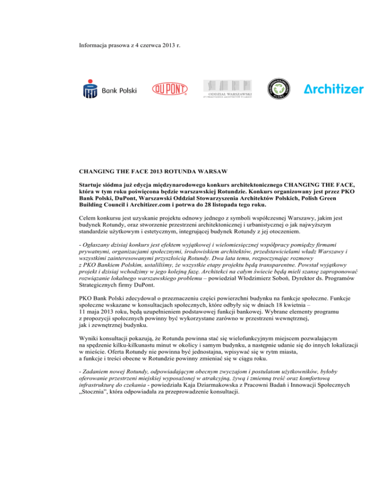Informacja prasowa z 4 czerwca 2013 r. CHANGING THE FACE 2013 ROTUNDA WARSAW Startuje siódma już edycja międzynarodowego konkurs architektonicznego CHANGING THE FACE, która w tym roku poświęcona będzie warszawskiej Rotundzie. Konkurs organizowany jest przez PKO Bank Polski, DuPont, Warszawski Oddział Stowarzyszenia Architektów Polskich, Polish Green Building Council i Architizer.com i potrwa do 28 listopada tego roku. Celem konkursu jest uzyskanie projektu odnowy jednego z symboli współczesnej Warszawy, jakim jest budynek Rotundy, oraz stworzenie przestrzeni architektonicznej i urbanistycznej o jak najwyższym standardzie użytkowym i estetycznym, integrującej budynek Rotundy z jej otoczeniem. - Ogłaszany dzisiaj konkurs jest efektem wyjątkowej i wielomiesięcznej współpracy pomiędzy firmami prywatnymi, organizacjami społecznymi, środowiskiem architektów, przedstawicielami władz Warszawy i wszystkimi zainteresowanymi przyszłością Rotundy. Dwa lata temu, rozpoczynając rozmowy z PKO Bankiem Polskim, ustaliliśmy, że wszystkie etapy projektu będą transparentne. Powstał wyjątkowy projekt i dzisiaj wchodzimy w jego kolejną fazę. Architekci na całym świecie będą mieli szansę zaproponować rozwiązanie lokalnego warszawskiego problemu – powiedział Włodzimierz Soboń, Dyrektor ds. Programów Strategicznych firmy DuPont. PKO Bank Polski zdecydował o przeznaczeniu części powierzchni budynku na funkcje społeczne. Funkcje społeczne wskazane w konsultacjach społecznych, które odbyły się w dniach 18 kwietnia – 11 maja 2013 roku, będą uzupełnieniem podstawowej funkcji bankowej. Wybrane elementy programu z propozycji społecznych powinny być wykorzystane zarówno w przestrzeni wewnętrznej, jak i zewnętrznej budynku. Wyniki konsultacji pokazują, że Rotunda powinna stać się wielofunkcyjnym miejscem pozwalającym na spędzenie kilku-kilkunastu minut w okolicy i samym budynku, a następnie udanie się do innych lokalizacji w mieście. Oferta Rotundy nie powinna być jednostajna, wpisywać się w rytm miasta, a funkcje i treści obecne w Rotundzie powinny zmieniać się w ciągu roku. - Zadaniem nowej Rotundy, odpowiadającym obecnym zwyczajom i postulatom użytkowników, byłoby oferowanie przestrzeni miejskiej wyposażonej w atrakcyjną, żywą i zmienną treść oraz komfortową infrastrukturę do czekania - powiedziała Kaja Dziarmakowska z Pracowni Badań i Innowacji Społecznych „Stocznia”, która odpowiadała za przeprowadzenie konsultacji. Wyniki konsultacji. Pomysły ekspertów odbierane przychylnie 5 4 3,41 3,63 3,63 3,11 3 3,24 3,26 3,11 2,68 ogólnodostępne centrum edukacyjne miejsce odpoczynku, spotkań w otoczeniu zieleni darmowa galeria sztuki sklep z książkami, pamiątkami, gadżetami związanymi z Warszawą multimedialny punkt widokowy multimdialny punkt informacji o bieżących wydarzeniach kulturalnych w Warszawie multimedialna informacja turystyczna 1 ogólnodostępna czytelnia prasy i książek 2 Pełny raport z przeprowadzonych konsultacji społecznych znajduje się na stronie www.rotunda2013.pl Wszyscy uczestnicy tegorocznego „Changing The Face” zmagać się będą z zadaniem konkursowym, jaki postawili przed nimi organizatorzy. W obu etapach konkursu rozwiązania konkursowe prac powinny uwzględniać zastosowanie kluczowych tzw. zielonych rozwiązań, które mogą się przyczynić do wielokryterialnej certyfikacji typu LEED, BREEM, czy też DGNB. Rozwiązania projektowe powinny również uwzględnić zastosowanie co najmniej trzech z sześciu proponowanych rozwiązań materiałowych firmy DuPont. HARMONOGRAM KONKURSU Etap I Start konkursu Otwarcie rejestracji Zamknięcie rejestracji Zakończenie przyjmowania prac Ogłoszenie wyników I etapu konursu 4 czerwca 2013 4 czerwca 2013 15 lipca 2013 23:59 CET 19 sierpnia 2013 23:59 CET 29 sierpnia 2013 Etap II Zakończenie przyjmowania prac Ogłoszenie wyników Ceremonia wręczenia nagród 7 listopada 2013 23:59 CET 28 listopada 2013 28 listopada 2013 JURY Andrzej Bulanda - architekt, Oddział Warszawski, Stowarzyszenie Architektów Polskich (OW SARP) Konrad Kucza-Kuczyński – architekt, OW SARP – Przewodniczący Sądu Konkursowego Michał Łojewski – grafik, twórca nowej identyfikacji wizualnej PKO Banku Polskiego (Warszawa) Tomasz Marszałł – Dyrektor Marketingu PKO Banku Polskiego (Warszawa) Maciej Miłobędzki – architekt, OW SARP Marcin Mostafa – architekt, OW SARP Grzegorz Piątek - architekt/krytyk architektury (Warszawa) Rafał Schurma – architekt, Polish Green Building Council (Gliwice) Włodzimierz Soboń – Dyrektor Programów Strategicznych DuPont (Warszawa) Aleksandra Wasilkowska - architekt, OW SARP NAGRODY Pula nagród: 200,000 PLN (ok. 62 000 USD, w zależności od kursu walut) Pierwsza nagroda: 50,000 PLN (ok. 15 500 USD, w zależności od kursu walut) oraz realizacja projektu Konkurs jest anonimowy. Jury pozna nazwiska zwycięzców dopiero po wyłonieniu najlepszych projektów. Rejestracja, regulamin, materiały konkursowe znajdują się na stronie konkursu: www.ChangingTheFace.com Kontakt dla mediów: Piotr Partyka e-mail: [email protected] telefon: +48 507 183 361 *** PKO Bank Polski jest liderem polskiego sektora bankowego. Skonsolidowany zysk netto PKO Banku Polskiego za 1. kwartał 2013 roku wyniósł 781,4 mln zł. Jest spółką krajową z największą wartością akcji w wolnym obrocie na GPW. Bank jest regularnie nagradzany w prestiżowych rankingach. Instytut Rachunkowości i Podatków uhonorował Raport Roczny PKO Banku Polskiego za 2011 rok Nagrodą Główną w konkursie The Best Annual Report w kategorii Banki i instytucje finansowe. Bank zwyciężył w tej kategorii już drugi rok z rzędu. PKO Bank Polski otrzymał także Nagrodę Główną w rankingu 50 największych banków w Polsce 2012 branżowego miesięcznika „Bank”. Doceniona została m.in. dynamika wzrostu sumy bilansowej Banku, a także całokształt jego ry