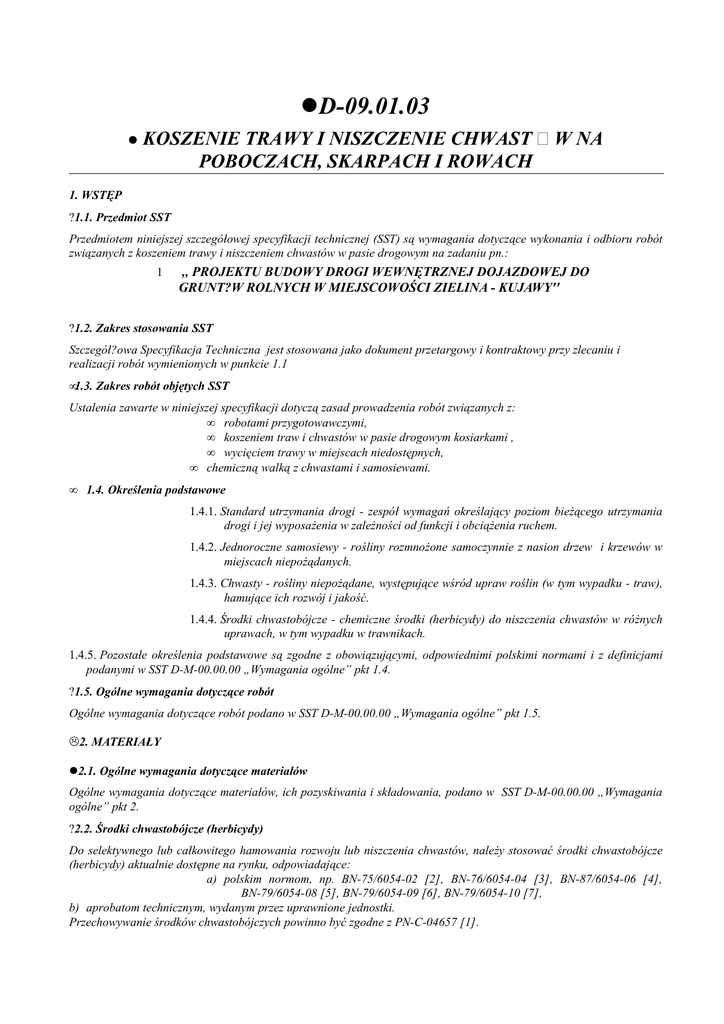 lD-09.01.03 l KOSZENIE TRAWY I NISZCZENIE CHWAST モ W NA POBOCZACH, SKARPACH I ROWACH 1. WSTĘP ?1.1. Przedmiot SST Przedmiotem niniejszej szczegółowej specyfikacji technicznej (SST) są wymagania dotyczące wykonania i odbioru robót związanych z koszeniem trawy i niszczeniem chwastów w pasie drogowym na zadaniu pn.: 1 ,, PROJEKTU BUDOWY DROGI WEWNĘTRZNEJ DOJAZDOWEJ DO GRUNT?W ROLNYCH W MIEJSCOWOŚCI ZIELINA - KUJAWY'' ?1.2. Zakres stosowania SST Szczegół?owa Specyfikacja Techniczna jest stosowana jako dokument przetargowy i kontraktowy przy zlecaniu i realizacji robót wymienionych w punkcie 1.1 •1.3. Zakres robót objętych SST Ustalenia zawarte w niniejszej specyfikacji dotyczą zasad prowadzenia robót związanych z: • robotami przygotowawczymi, • koszeniem traw i chwastów w pasie drogowym kosiarkami , • wycięciem trawy w miejscach niedostępnych, • chemiczną walką z chwastami i samosiewami. • 1.4. Określenia podstawowe 1.4.1. Standard utrzymania drogi - zespół wymagań określający poziom bieżącego utrzymania drogi i jej wyposażenia w zależności od funkcji i obciążenia ruchem. 1.4.2. Jednoroczne samosiewy - rośliny rozmnożone samoczynnie z nasion drzew i krzewów w miejscach niepożądanych. 1.4.3. Chwasty - rośliny niepożądane, występujące wśród upraw roślin (w tym wypadku - traw), hamujące ich rozwój i jakość. 1.4.4. Środki chwastobójcze - chemiczne środki (herbicydy) do niszczenia chwastów w różnych uprawach, w tym wypadku w trawnikach. 1.4.5. Pozostałe określenia podstawowe są zgodne z obowiązującymi, odpowiednimi polskimi normami i z definicjami podanymi w SST D-M-00.00.00 „Wymagania ogólne” pkt 1.4. ?1.5. Ogólne wymagania dotyczące robót Ogólne wymagania dotyczące robót podano w SST D-M-00.00.00 „Wymagania ogólne” pkt 1.5. L2. MATERIAŁY l2.1. Ogólne wymagania dotyczące materiałów Ogólne wymagania dotyczące materiałów, ich pozyskiwania i składowania, podano w SST D-M-00.00.00 „Wymagania ogólne” pkt 2. ?2.2. Środki chwastobójcze (herbicydy) Do selektywnego lub całkowitego hamowania rozwoju lub niszczenia chwastów, należy stosować środki chwastobójcze (herbicydy) aktualnie dostępne na rynku, odpowiadające: a) polskim normom, np. BN-75/6054-02 [2], BN-76/6054-04 [3], BN-87/6054-06 [4], BN-79/6054-08 [5], BN-79/6054-09 [6], BN-79/6054-10 [7], b) aprobatom technicznym, wydanym przez uprawnione jednostki. Przechowywanie środków chwastobójczych powinno być zgodne z PN-C-04657 [1]. L3. SPRZĘT l3.1. Ogólne wymagania dotyczące sprzętu Ogólne wymagania dotyczące sprzętu podano w SST D-M-00.00.00 „Wymagania ogólne” pkt 3. ?3.2. Sprzęt do koszenia trawy i niszczenia chwastów Wykonawca przystępujący do koszenia trawy i niszczenia chwastów powinien wykazać się możliwością korzystania z następującego sprzętu: a) kosiarek • kosiarki trawnikowej spalinowej, do koszenia na mniejszych powierzchniach eksponowanych, takich jak: wysepki, parkingi, szczególnie przy drogach o standardzie utrzymania I oraz zieleń osiedlową, • kosiarki doczepnej do ciągników, do koszenia dużych powierzchni, jak: pasy dzielące, pobocza lub pasy drogowe poza koroną drogi, • kosiarki wysięgnikowej, doczepnej do ciągnika, do koszenia na skarpach i przeciwskarpach, • kosiarki żyłkowej, spalinowej lub elektrycznej, do koszenia w miejscach niedostępnych, takich jak: pod barierami, przy ogrodzeniach, znakach, pachołkach oraz innych urządzeniach drogowych, a) opryskiwaczy • opryskiwacza plecakowego, do oprysków mniejszych powierzchni i terenów niedostępnych, • opryskiwacza ciągnikowego, do oprysków dużych powierzchni. • 4. TRANSPORT • 4.1. Ogólne wymagania dotyczące transportu • Ogólne wymagania dotyczące transportu podano w SST D-M-00.00.00 „Wymagania ogólne” pkt 4. • 4.2. Środki transportu • Do przewozu środków chwastobójczych, skoszonej trawy, chwastów i zanieczyszczeń można użyć dowolnego sprzętu transportowego. • Przy transporcie herbicydów należy stosować się do wymagań PN-C-04657 [1]. • 5. WYKONANIE ROBÓT • 5.1. Ogólne zasady wykonania robót • Ogólne zasady wykonania robót podano w SST D-M-00.00.00 „Wymagania ogólne” pkt 5. • 5.2. Roboty przygotowawcze • Roboty przygotowawcze Wykonawca wykonuje przed rozpoczęciem koszenia, najlepiej wczesną wiosną. • Do robót tych zalicza się: • wybranie z trawy kamieni, gruzu, puszek metalowych lub innych zanieczyszczeń, • wygrabienie liści, które spadły z drzew, • rozgarnięcie kretowisk, • wywóz zebranych zanieczyszczeń na wysypisko publiczne lub składowiska własne, po uzgodnieniu miejsca wywozu z Inżynierem. • 5.3. Koszenie traw i chwastów • Koszenie traw i chwastów na pasach drogowych powinno być wykonywane dwukrotnie, pierwsze w okresie wiosennym, drugie - letnim. Rozpoczęcie i zakończenie pierwszego koszenia traw i chwastów powinno być wykonane w takim okresie, aby nie dopuścić do wysypu nasion chwastów w wyniku ich przekwitnięcia. Najbardziej miarodajnym okresem pierwszego koszenia traw jest okres drugiej połowy maja, przy czym termin rozpoczęcia koszenia powinien być uzgodniony z Inżynierem. Drugie koszenie traw i chwastów powinno być wykonane w terminie do końca sierpnia, w zależności od takich czynników, jak: • charakteru drogi, • • • • • • • • standardu utrzymania danej drogi, • natężenia ruchu, • występowania obszarów zabudowanych, • występowania parkingów, • istnienia pomników przyrody, itp. Inżynier może zwiększyć częstotliwość koszenia traw na pasach drogowych lub określonych fragmentach drogi. W pierwszej kolejności powinny być koszone trawy i chwasty na koronie drogi, a w szczególności występujące na: • pasach dzielących, • wysepkach i trawnikach, • poboczach, • pod barierami, oraz w miejscach mających zasadniczy wpływ na wizualny wygląd drogi. W dru