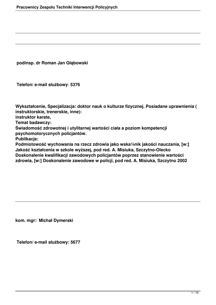 Pracownicy Zespołu Techniki Interwencji Policyjnych podinsp. dr Roman Jan Głąbowski Telefon/ e-mail służbowy: 5376 Wykształcenie, Specjalizacja: doktor nauk o kulturze fizycznej. Posiadane uprawnienia ( instruktorskie, trenerskie, inne): instruktor karate, Temat badawczy: Świadomość zdrowotnej i utylitarnej wartości ciała a poziom kompetencji psychomotorycznych policjantów. Publikacje: Podmiotowość wychowania na rzecz zdrowia jako wska¼nik jakości nauczania, [w:] Jakość kształcenia w szkole wyższej, pod red. A. Misiuka, Szczytno-Olecko Doskonalenie kwalifikacji zawodowych policjantów poprzez stanowienie wartości zdrowia, [w:] Doskonalenie zawodowe w policji, pod red. A. Misiuka, Szczytno 2002 kom. mgr Michał Dymerski Telefon/ e-mail służbowy: 5677 1 / 10 Pracownicy Zespołu Techniki Interwencji Policyjnych kom. mgr Michał Dymerski (ur. 1978) jest absolwentem Akademii Wychowania Fizycznego w Gdańsku (2001). Jest doktorantem zakresie kultury fizycznej na Akademii Wychowania Fizycznego i Sportu w Gdańsku. W policji pracuje od 2004 roku, od początku związany z pionem prewencji. Pełnił funkcję policjanta Oddziału Prewencji Policji w Warszawie. Od 2006 roku jest instruktorem Zakładu Podstaw Bezpieczeństwa Instytutu Bezpieczeństwa i Porządku Publicznego Wydziału Bezpieczeństwa Wewnętrznego i Wyższej Szkoły Policji w Szczytnie. Posiadane uprawnienia- trener judo II klasy, sędzia okręgowy judo, instruktor taktyki, technik interwencji oraz posługiwania się pałką wielofunkcyjną typu „Tonfa”, instruktor pływania, młodszy ratownik WOPR. Współautor publikacji z zakresu treningu maksymalnej siły mięśniowej w przygotowaniu zawodników judo. Osiągnięcia i wyniki sportowe: brązowy medalista Mistrzostw Świata Masters w Judo (Budapeszt, 2010), brązowy medalista Mistrzostw Europy Master w Judo (Praga, 2008), dwukrotny złoty medalista Międzynarodowych Mistrzostw Polski Masters w Judo (2009, 2010), srebrny medalista Międzynarodowych Mistrzostw Polski Masters w Judo (2008), srebrny medalista Międzynarodowego Turnieju Policji w Judo (Czeskie Budziejowice, 2005), złoty medalista Mistrzostw Polski Policji w Judo (2010), medalista Mistrzostw Polski Policji w Judo (2005- 2009). kom. mgr Mariusz Kramarczyk Telefon/ e-mail służbowy: 5956 kom. mgr Mariusz Kramarczyk jest absolwentem Akademii Wychowania Fizycznego w Krakowie, którą ukończył z tytułem magistra z wychowania fizycznego i specjalizację z gimnastyki korekcyjnej oraz turystyki. W policji pracuje od 2004 roku, zaczynając służbę w oddziałach prewencji, potem zajął stanowisko policjanta w ogniwie patrolowo interwencyjnym, następnie odbywał praktyki w pionie ruchu drogowego. W 2010 roku ukończył Szkolenie dla absolwentów Szkół Wyższych w Szczytnie i zdobył stopień oficera Policji. Obecnie pracuje na stanowisku wykładowcy w Zakładzie Podstaw Bezpieczeństwa Instytutu Bezpieczeństwa i Porzadku Publicznego WBW w Szczytnie. Posiada uprawnienia: trener klasy drugiej JU-JITSU, - instruktor samoobrony, - instruktor taktyki i technik interwencji oraz posługiwania się pałką wielofunkcyjną typu „Tonfa", - instruktor strzelań policyjnych, instruktor z zakresu obezwładniania osób za pomocą energii elektrycznej (paralizator), - 2 kyu w ju jitsu, - instruktor gier zespołowych, - specjalizacja z zakresu fizjoterapii i kinezyterapii, - 2 / 10 Pracownicy Zespołu Techniki Interwencji Policyjnych instruktor pływania, - instruktor narciarstwa zjazdowego, - I o , II o , III o IV o kwalifikacji w zakresie masażu leczniczego obejmujący odnowę biologiczną, rehabilitację i terapie manualną, leczenie skolioz oraz gimnastykę korekcyjną, - stopień żeglarza jachtowego nadany przez Polski Związek Żeglarski, - ukończony kurs sędziego piłki siatkowej, - ratownik wodny nadany przez Wodne Ochotnicze Pogotowie Ratunkowe, - wychowawca kolonijny. Osiągnięcia i wyniki sportowe m.in.: 2012r. - I miejsce o Puchar Prezydenta IPA w Mistrzostwach Małopolski Służb Mundurowych w narciarstwie alpejskim, II miejsce w Mistrzostwach Małopolski Służb Mundurowych w narciarstwie alpejskim - Lubomierz 2012r., I miejsce o Puchar Wójta Gminy Mrągowo w 2012r., I miejsce w Mistrzostwach Województwa Podkarpackiego 2009 Służb Mundurowych w Narciarstwie Alpejskim - III miejsce w Mistrzostwach Województwa Podkarpackiego 2007 Służb Mundurowych w Narciarstwie Alpejskim - I miejsce w Mistrzostwach Województwa Podkarpackiego 2005 w Narciarstwie Alpejskim - I miejsce w Mistrzostwach Województwa Podkarpackiego 2004 w Narciarstwie Alpejskim - II miejsce w Podkarpackiej Lidze Miast 2003 w Narciarstwie Alpejskim - III miejsce w Mistrzostwach Polski 2002 w Narciarstwie Alpejskim - I miejsce w pięcioboju gimnastycznym 2001 w Akademickich Mistrzostwach Szkół Wyższych - I miejsce w szermierce 2001 w Akademickich Mistrzostwach Państwowych Wyższych Szkół Zawodowych - I miejsce Pucharu KU – AZS – KN - PWSZ 2000 w slalomie gigancie Słowacja - VI miejsce w Akademickich Mistrzostwach Polski 1999 w pływaniu. Hobby, zainteresowania pozazawodowe: Narciarstwo zjazdowe, kulturystyka, sztuki walki, żeglarstwo, wędkarstwo. nadkom. mgr Ryszard Kukliński Telefon/ e-mail służbowy: 5934 3 / 10 Pracownicy Zespołu Techniki Interwencji Policyjnych nadkom. mgr Jacek Szewczak Telefon/ e-mail służbowy: 5934 4 / 10 Pracownicy Zespołu Techniki Interwencji Policyjnych Wykształcenie magister Akademii Wychowania Fizycznego i Sportu specjalizacja trener judo, Specjalizacja: Posiadane uprawnienia ( instruktorskie, trenerskie, inne): - Trener judo II dan - Instruktor Ju-jitsu II dan,- instruktor techniki i taktyki interwencji,- instruktor Tonfy, instruktor strzelań policyjnych,- instruktor gimnastyki korekcyjnej,- patent młodszego ratownika WOPR,- sędzia okręgowy judo Zainteresowania zawodowe: taktyka i technika realizacji interwencji policyjnych, strzelanie, Przynależność do sekcji, klubów,