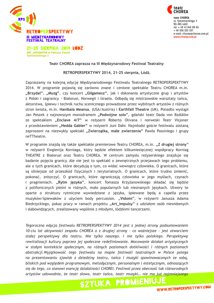 Teatr CHOREA zaprasza na III Międzynarodowy Festiwal Teatralny RETROPERSPEKTYWY 2014, 21-25 sierpnia, Łódź. Zapraszamy na kolejną edycję Międzynarodowego Festiwalu Teatralnego RETROPERSPEKTYWY 2014. W programie pojawią się zarówno znane i cenione spektakle Teatru CHOREA m.in. „Brzydal”, „Muzg”, czy koncert „Gilgamesz”, jak i dokonania artystyczne grup i artystów z Polski i zagranicy - Białorusi, Norwegii i Izraela. Odbędą się mistrzowskie warsztaty tańca, aktorstwa, śpiewu i technik ruchu scenicznego prowadzone przez wybitnych artystów z różnych stron świata, m.in. Hanibala Meansa, (USA/Austria) i Earthfall Theatre (UK). Ponadto wystąpi Jan Peszek z najnowszym monodramem „Podwójne solo”, gdański teatr Dada von Bzdülöw ze spektaklem „Enclave 4/7” w reżyserii Roberto Olivana i norweski Teatr Visjoner z przedstawieniem „Hedda Gabler” w reżyserii Juni Dahr. Najmłodsi goście festiwalu zostaną zaproszeni na niezwykły spektakl „Zwierzątka, małe zwierzenia” Pawła Passiniego i grupy neTTheatre. W programie znajdą się także spektakle premierowe Teatru CHOREA, m.in. „Z drugiej strony” w reżyserii Ewgienija Korniaga, który będzie efektem kilkumiesięcznej współpracy Korniag THEATRE z Białorusi oraz Teatru CHOREA. W centrum zamysłu reżyserskiego znajduje się badanie pojęcia granicy. Ale nie jest to spektakl o zewnętrznych przejawach tego problemu, ale o tych granicach, które decydują o tym, co widać wewnątrz człowieka. O granicach, które są silniejsze od przeszkód fizycznych i terytorialnych. O granicach, które trudno zmienić, pokonać, zniszczyć. O granicach, które ograniczają człowieka w jego myślach, czynach i pragnieniach. „Rytm języka”, koncert Tomasza Krzyżanowskiego składać się będzie z polifonicznych pieśni w różnych, mało popularnych lub nieznanych językach. Utwory te oparte o struktury rytmiczne wywiedzione z języka, śpiewane będą a capella przez muzyków/śpiewaków z użyciem body percussion. „Vidomi”, w reżyserii Janusza Adama Biedrzyckiego, pokaz pracy w ramach projektu „Art_Impulsy” z udziałem osób niewidomych i słabowidzących, zrealizowany wspólnie z młodymi, łódzkimi tancerzami. Tegoroczna edycja festiwalu RETROPERSPEKTYWY 2014 jest z jednej strony podsumowaniem 10-ciu lat aktywności zespołu CHOREA a z drugiej strony - co ważniejsze - jest otwarciem stałej perspektywy dla teatru. Nie tylko naszego. I nie tylko polskiego. Perspektywy rewitalizacji kultury poprzez jej społeczne redefiniowanie. Mocowanie działań artystycznych w stałym kontekście społecznym, na różnych poziomach dotkliwości i różnych poziomach abstrakcji.Wyjątkowość tego festiwalu na mapie festiwali teatralnych w Polsce polega na prezentowaniu zjawisk z dziedziny teatru, tańca i muzyki spowinowaconych ze sobą, bliskich pod względem programowym, metodycznym, personalnym i estetycznym, odnoszących się do tego, co stanowi esencję działalności CHOREI. Festiwal przez obecność tak różnorodnych artystów udowodnia, że teatr słowa, teatr tańca, teatr muzyki… nie ma już najmniejszego sensu. Ten podział jest już anachronizmem w sztuce. Wszystko jest teatrem żywym albo martwym. I każdy teatr w równej mierze powinien posługiwać się słowem, muzyką i ruchem. Może różnie akcentować te trzy środki komunikacji z widzem, ale pełnię życia uzyskuje, gdy wszystkie trzy mówią na raz z tą samą siłą. Tomasz Rodowicz