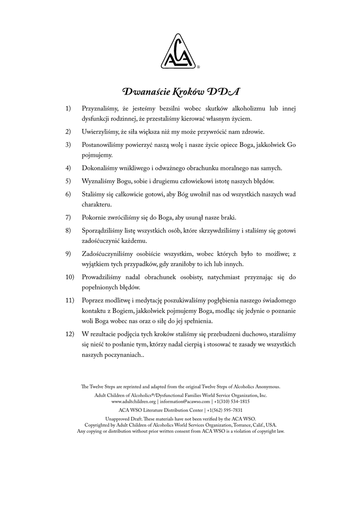 Dwanaście Kroków DDA 1) Przyznaliśmy, że jesteśmy bezsilni wobec skutków alkoholizmu lub innej dysfunkcji rodzinnej, że przestaliśmy kierować własnym życiem. 2) Uwierzyliśmy, że siła większa niż my może przywrócić nam zdrowie. 3) Postanowiliśmy powierzyć naszą wolę i nasze życie opiece Boga, jakkolwiek Go 4) Dokonaliśmy wnikliwego i odważnego obrachunku moralnego nas samych. 5) Wyznaliśmy Bogu, sobie i drugiemu człowiekowi istotę naszych błędów. 6) Staliśmy się całkowicie gotowi, aby Bóg uwolnił nas od wszystkich naszych wad 7) Pokornie zwróciliśmy się do Boga, aby usunął nasze braki. 8) Sporządziliśmy listę wszystkich osób, które skrzywdziliśmy i staliśmy się gotowi 9) Zadośćuczyniliśmy osobiście wszystkim, wobec których było to możliwe; z pojmujemy. charakteru. zadośćuczynić każdemu. wyjątkiem tych przypadków, gdy zraniłoby to ich lub innych. 10) Prowadziliśmy nadal obrachunek osobisty, natychmiast przyznając się do popełnionych błędów. 11) Poprzez modlitwę i medytację poszukiwaliśmy pogłębienia naszego świadomego kontaktu z Bogiem, jakkolwiek pojmujemy Boga, modląc się jedynie o poznanie woli Boga wobec nas oraz o siłę do jej spełnienia. 12) W rezultacie podjęcia tych kroków staliśmy się przebudzeni duchowo, staraliśmy się nieść to posłanie tym, którzy nadal cierpią i stosować te zasady we wszystkich naszych poczynaniach.. The Twelve Steps are reprinted and adapted from the original Twelve Steps of Alcoholics Anonymous. Adult Children of Alcoholics®/Dysfunctional Families World Service Organization, Inc. www.adultchildren.org | [email protected] | +1(310) 534-1815 ACA WSO Literature Distribution Center | +1(562) 595-7831 Unapproved Draft. These materials have not been verified by the ACA WSO. Copyrighted by Adult Children of Alcoholics World Services Organization, Torrance, Calif., USA. Any copying or distribution without prior written consent from ACA WSO is a violation of copyright law.
