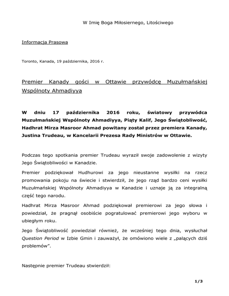 W Imię Boga Miłosiernego, Litościwego Informacja Prasowa Toronto, Kanada, 19 października, 2016 r. Premier Kanady gości w Ottawie przywódcę Muzułmańskiej Wspólnoty Ahmadiyya W dniu 17 października 2016 roku, światowy przywódca Muzułmańskiej Wspólnoty Ahmadiyya, Piąty Kalif, Jego Świątobliwość, Hadhrat Mirza Masroor Ahmad powitany został przez premiera Kanady, Justina Trudeau, w Kancelarii Prezesa Rady Ministrów w Ottawie. Podczas tego spotkania premier Trudeau wyraził swoje zadowolenie z wizyty Jego Świątobliwości w Kanadzie. Premier podziękował Hudhurowi za jego nieustanne wysiłki na rzecz promowania pokoju na świecie i stwierdził, Ŝe jego rząd bardzo ceni wysiłki Muzułmańskiej Wspólnoty Ahmadiyya w Kanadzie i uznaje ją za integralną część tego narodu. Hadhrat Mirza Masroor Ahmad podziękował premierowi za jego słowa i powiedział, Ŝe pragnął osobiście pogratulować premierowi jego wyboru w ubiegłym roku. Jego Świątobliwość powiedział równieŜ, Ŝe wcześniej tego dnia, wysłuchał Question Period w Izbie Gmin i zauwaŜył, Ŝe omówiono wiele z „palących dziś problemów”. Następnie premier Trudeau stwierdził: 1/3 „Jego Świątobliwość, jego przyjaźń i przywództwo są dla Kanady bardzo waŜne i doceniamy sposób, w jaki Muzułmańska Wspólnota Ahmadiyya potępia wszelkie formy ekstremizmu”. Jego Świątobliwość wziął udział w spotkaniu z premierem i sześcioma ministrami federalnymi. W czasie tego spotkania, premier ponownie docenił wysiłki Hadhrat Mirza Masroor Ahmada w promowaniu pokoju na świecie. Premier pogratulował równieŜ Muzułmańskiej Wspólnocie Ahmadiyya jej 50 rocznicy istnienia w Kanadzie. Hadhrat Mirza Masroor Ahmad przypomniał swoje wcześniejsze spotkanie z premierem w 2012 roku, które odbyło się w Peace Village. W tym czasie pan Trudeau nie był liderem Partii Liberalnej. Hadhrat Mirza Masroor Ahmad powiedział: „Kiedy spotkałem Cię po raz pierwszy w 2012 roku, modliłem się za Ciebie i powiedziałem, Ŝe wierzę, Ŝe pewnego dnia zostaniesz premierem.” Dalsze dyskusje dotyczyły potrzeby dialogu pomiędzy wspólnotami róŜnych wyznań, znaczenia edukacji dla wszystkich ludzi i wolności religijnej. W odniesieniu do wolności religijnej, Hadhrat Mirza Masroor Ahmad powiedział: „Prawdziwa wolność religijna powinna być udzielona wszystkim ludziom i wszyscy ludzie powinni mieć prawo do pokojowego praktykowania swoich wyznań i przekonań. Rządy nie powinny ingerować lub dąŜyć do ustanawiania praw przeciwko pokojowym przekonaniom religijnym.” Jego Świątobliwość wyraził swoje obawy, co do dalszego wzrostu ekstremizmu i terroryzmu w róŜnych częściach świata i związanych z tym zagroŜeniach w 2/3 świecie zachodnim. Dodał, Ŝe uwaŜał globalny kryzys finansowy roku 2008 za główną przyczynę terroryzmu w dzisiejszym świecie. Jego Świątobliwość powiedział, Ŝe wysoki stan bezrobocia oraz rozpaczy i beznadziei finansowej naraził niektórych młodych muzułmanów na poddanie się ekstremizmowi. Skomentował, Ŝe tworzenie miejsc pracy i pomaganie ludziom stanąć na własnych nogach jest środkiem do zapewnienia bezpieczeństwa narodowego. Hadhrat Mirza Masroor Ahmad powtórzył, Ŝe wszelkie formy terroryzmu i ekstremizmu nie są związane z islamem. Hadhrat Mirza Masroor Ahmad powiedział: „Jeśli wszyscy muzułmanie naśladowaliby prawdziwe nauczanie swej religii, to Ŝaden muzułmanin nigdy nie poddałby się radykalizacji poniewaŜ załoŜyciel islamu, Prorok Muhammad (saw) powiedział, Ŝe miłowanie swojego narodu jest częścią wiary islamu. Tak więc, obowiązkiem kaŜdego muzułmanina jest kochać swój naród, dąŜyć do jego doskonalenia i słuŜyć mu wiernie. Dlatego teŜ muzułmanie Ahmadi nie poddają się radykalizacji, poniewaŜ kierują się prawdziwymi naukami islamu.” Koniec informacji prasowej. Więcej informacji: Stowarzyszenie Muzułmańskie Ahmadiyya [email protected] tel. 22 863 88 92 3/3