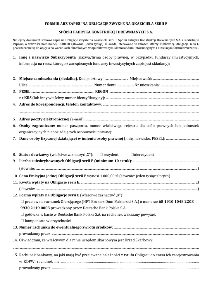 FORMULARZ ZAPISU NA OBLIGACJE ZWYKŁE NA OKAZICIELA SERII E SPÓŁKI FABRYKA KONSTRUKCJI DREWNIANYCH S.A. Niniejszy dokument stanowi zapis na Obligacje zwykłe na okaziciela serii E Spółki Fabryka Konstrukcji Drewnianych S.A. z siedzibą w Paproci, o wartości nominalnej 1.000,00 (słownie: jeden tysiąc) zł każda, oferowane w ramach Oferty Publicznej. Obligacje serii E przeznaczone są do objęcia na warunkach określonych w opublikowanym Memorandum Informacyjnym i niniejszym formularzu zapisu. 1. Imię i nazwisko Subskrybenta (nazwa/firma osoby prawnej, w przypadku funduszy inwestycyjnych, informacja na rzecz którego z zarządzanych funduszy inwestycyjnych zapis jest składany): ............................................................................................................................................................................................................................. 2. Miejsce zamieszkania (siedziba). Kod pocztowy: ............................. Miejscowość: ........................................................ Ulica: ............................................................................... Numer domu:.................... Nr mieszkania:................................................ 3. PESEL ............................................................................. , REGON .............................................................................................................. , nr KRS (lub inny właściwy numer identyfikacyjny): .................................................................................................................. 4. Adres do korespondencji, telefon kontaktowy: ...................................................................................................................... ............................................................................................................................................................................................................................. 5. Adres poczty elektronicznej (e-mail): ........................................................................................................................................... 6. Osoby zagraniczne: numer paszportu, numer właściwego rejestru dla osób prawnych lub jednostek organizacyjnych nieposiadających osobowości prawnej: ......................................................................................................... 7. Dane osoby fizycznej działającej w imieniu osoby prawnej (imię, nazwisko, PESEL): ........................................ ............................................................................................................................................................................................................................. 8. Status dewizowy (właściwe zaznaczyć „X”): rezydent nierezydent 9. Liczba subskrybowanych Obligacji serii E (minimum 10 sztuk): ................................................................................. (słownie: ...................................................................................................................................................................................................... ) 10. Cena Emisyjna jednej Obligacji serii E wynosi 1.000,00 zł (słownie: jeden tysiąc złotych) 11. Kwota wpłaty na Obligacje serii E: ............................................................................................................................................ zł (słownie: ...................................................................................................................................................................................................... ) 12. Forma wpłaty na Obligacje serii E (właściwe zaznaczyć „X”): przelew na rachunek Oferującego (HFT Brokers Dom Maklerski S.A.) o numerze 68 1910 1048 2208 9930 2119 0003 prowadzony przez Deutsche Bank Polska S.A. gotówka w kasie w Deutsche Bank Polska S.A. na rachunek wskazany powyżej. kompensata wierzytelności 13. Numer rachunku do ewentualnego zwrotu środków: ........................................................................................................ prowadzony przez ..................................................................................................................................................................................... 14. Oświadczam, że właściwym dla mnie urzędem skarbowym jest Urząd Skarbowy: ..................................................................................................................................................................................................................................... 15. Rachunek bankowy, na jaki mają być przelewane należności z tytułu Obligacji do czasu ich zarejestrowania w KDPW: rachunek nr: …………………………………………………………………………………………………………………………… prowadzony przez …………………………………………………………………………………………………………………………………… Zapisy na Obligacje zwykłe na okaziciela serii E przyjmowane są w Punktach Obsługi Klienta HFT Brokers Domu Maklerskiego S.A.: w Łodzi (pod adresem: 93-521 Łódź, ul. Strycharska 24/117) i w Warszawie (pod adresem: 00-838 Warszawa, ul. Prosta 51), a w tym korespondencyjnie (na adres: 93-521 Łódź, ul. Strycharska 24/117). Subskrybent składa/przesyła do Punktu Obsługi Klienta HFT Brokers Dom Maklerski S.A, trzy wypełnione i podpisane, jednobrzmiące egzemplarze formularza zapisu oraz dołącza do nich dokumenty wskazane w treści Memorandum Informacyjnego opublikowanego w dniu 3 września 2015 r. dostępnego w sieci Internet na stronach: Emitenta (http://www.drewniane-konstrukcje.pl) oraz Oferującego (http://www.hftbrokers.pl/dbi). Opłacenie Obligacji serii E musi być dokonane najpóźniej w ostatni
