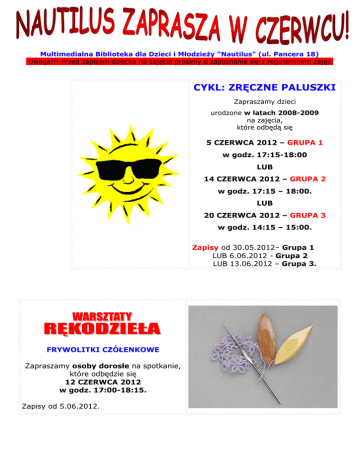 Multimedialna Biblioteka dla Dzieci i Młodzieży "Nautilus" (ul. Pancera 18) Uwaga!!! Przed zapisem dziecka na zajęcia prosimy o zapoznanie się z regulaminem zajęć. CYKL: ZRĘCZNE PALUSZKI Zapraszamy dzieci urodzone w latach 2008-2009 na zajęcia, które odbędą się 5 CZERWCA 2012 – GRUPA 1 w godz. 17:15-18:00 LUB 14 CZERWCA 2012 – GRUPA 2 w godz. 17:15 – 18:00. LUB 20 CZERWCA 2012 – GRUPA 3 w godz. 14:15 – 15:00. Zapisy od 30.05.2012– Grupa 1 LUB 6.06.2012 - Grupa 2 LUB 13.06.2012 – Grupa 3. FRYWOLITKI CZÓŁENKOWE Zapraszamy osoby dorosłe na spotkanie, które odbędzie się 12 CZERWCA 2012 w godz. 17:00-18:15. Zapisy od 5.06.2012. CYKL: Zabawy Teatralne Zapraszamy dzieci urodzone w latach 2002-2005 na zajęcia, które odbędą się 13 CZERWCA 2012 w godz. 16:00 – 17:00. Zapisy od 6.06.2012. Z NAUTILUSEM PRZEZ CAŁY ROK DZIEŃ TATY Zajęcia literacko – plastyczne dla dzieci urodzonych w latach 2003-2007. Zapraszamy 21 CZERWCA 2012 w godz. 17:15-18:15. Zapisy od 14.06.2012. LITERACKIE ŚRODY Zapraszamy miłośników poezji na spotkanie, które odbędzie się 27 CZERWCA 2012 w godz. 17:00 – 18.00. Słówkowo – to i owo o słowie Zapraszamy dzieci urodzone w latach 2001-2004 do wzięcia udziału w zabawach językowych, które odbędą się 28 CZERWCA 2012 w godz. 17:00 – 18:00. Zapisy od 21.06.2012.