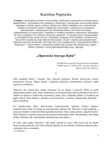Karolina Paprocka O sobie: z wykształcenia jestem nauczycielką, ukończyłam polonistykę na Uniwersytecie Jagiellońskim i od dziesięciu lat mieszkam w Niemczech. Pracuję jako nauczycielka języka polskiego w Szkole Języka i Kultury Polskiej przy PMK w Bielefeld oraz w niemieckich szkołach (wszystkich typów). Organizuję uroczystości i wydarzenia o charakterze patriotycznym i edukacyjnym dla niemieckiej Polonii. Od dwóch lat jestem odpowiedzialna za udział dzieci i młodzieży w Finałach Parafiad w Warszawie. Kilkanaście lat temu związałam się z Klubem Literackim „Nadolzie”. W okresie liceum zamieszczałam w antologiach klubu swoje wiersze. Początkiem listopada 2010 nakładem wydawnictwa Novae Res ukazała się moja debiutancka książka „Trawa”, wydana pod pseudonimem literackim Karolina Gackowska. Od maja 2013 roku współpracuję z miesięcznikiem PMK w Niemczech – „Nasze Słowo”. Dwukrotnie pisałam też artykuły dla miesięcznika „Śląsk”. Jestem mężatką i mamą jedenastoletniego syna, Jędrzeja. „Opowieści Starego Dębu” „Wielbił drzewo grzejąc się człowiek przy kominie. Rzekło drzewo: „Cóż po tym! – grzeje, ale ginie”. Ignacy Krasicki „Drzewo” I Salę wypełniał blask i muzyka. Pary tańczyły poloneza. Śliczne dziewczęce twarze, kunsztowne fryzury, długie suknie i skupione spojrzenia młodzieńców tworzyły widok doprawdy znamienity. Wprawne oko obserwatora mogło zatrzymać się na jednej z tancerek. Miała na sobie bladozieloną suknię, jasne włosy zapleciono w powabną koronę, główkę przekrzywiła nieco i oddała się figurom z niebywałą zręcznością i pasją. Oczy zdradzały jednak, że myślami jest gdzie indziej. Była drobna i młodsza od towarzyszek i pomimo wdzięcznego uśmiechu – jakaś zamyślona. Po zakończonym tańcu dziewczynka niepostrzeżenie opuściła miejsce zabawy. Pomieszczenie obok w niczym nie przypominało balowej sali. Panował tu lekki półmrok, a jedynym źródłem światła był blask sąsiedniej komnaty. Stare, znane sprzęty, zapach kwiatów, które ułożone w wazonie sypały pył na lśniącą powierzchnię stołu i tak pachniały, tak bardzo słodko i boleśnie, jak wspomnienie odchodzącego dzieciństwa… W oknie stała matka. Patrzyła w dal, jakby czekała na gości, albo raczej ich się lękała. Dziewczynka podeszła i bez słów położyła główkę na jej ramieniu. Kobieta podniosła rękę i wskazując okno wyszeptała: - To drzewo… 1 - Stoi tu od wieków, Matuś… - głos dziecka był czuły, ale z nutką niepokoju. W jednej chwili kobieta dotknęła dłonią piersi i blada osunęła się na ziemię. Oniemiała córka, klęcząc przy niej, pełnym mocy głosem, przekrzykując muzykę, zawołała: - Mateńko ukochana!!! II Palce pianistki, długie i szczupłe, zdawały się ledwo dotykać klawiatury. Pomimo tego dźwięk był niezwykle silny, płynął po pokojach i niósł się hen, w dal, przez otwarte okna, do sadu, jeszcze dalej… Kobieta grała Polonez As-dur Fryderyka Chopina. Miała na sobie suknię w kolorze głębokiej czerni, skromny żabot otulał jej szyję, włosy upięto w bujny kok, a jedyną ozdobę stanowiła duża broszka, na niej piastowski Orzeł w koronie i Pogoń na czwórdzielnym czerwonym tle. Podobnie ubrane były dwie inne osoby, żywo krzątające się przy kwiatach w wazonie i prowadzące szeptem rozmowę: - Czy wypada tak grać, kiedy Ojczyzna w żałobie? - Teraz to muzyka będzie naszą Ojczyzną… Nagle z ogrodu dobiegł głos siekiery. - Ścinają drzewo… - Ten dąb miał chyba z tysiąc lat… - Ojcowie, mężowie, synowie, bracia i narzeczeni leżą po lasach. Teraz nam brzóz na krzyże bardziej trzeba, niźli starych dębów… - Z jednego drzewa będzie tyle mebli… Musimy przeżyć, przetrzymać… Głos żadnej nie zadrżał, postawą nie zdradzały przygnębienia, stały w oknie trzy, wyprostowane jak strzała, jakby oddawały upadającemu drzewu ostatnie honory. I tylko oczy, te zwierciadła duszy, zdradzały, co kryło serce. Trzy kobiety głęboko, boleśnie płakały. III „Brunetki, blondynki…”. Nie wiadomo, co rozbrzmiewało głośniej, śmiech dwóch młodych dziewcząt, czy szturmujący niebo głos Kiepury… Jedna z dam, z zawadiackim spojrzeniem, zwierzała się z planów na nadchodzący wieczór, wymawiając z powabem charakterystyczne „l”: - Umówilam się ze Stachem! Druga w niczym jej nie ustępowała urodą i wdziękiem, ten sam miękki, powłóczysty, pełen żaru wzrok. Potrząsała zgrabną główką całą w platynowych „falach”, na sobie miała arcymodną, asymetryczną sukienkę: - Założysz tę złotą, z lamy? - O tak! Koniecznie! Razem podbiegły od starej, dębowej szafy, która skrzypnęła swojsko, gdy dziewczęta wyjmowały z niej istne cudo: toaletę z wąsko skrojonych skosów. Mierzeniu kreacji towarzyszyły takie nieposkromione wybuchy radości. Zdawało się, iż na całym świecie nie było żadnej brunetki, nie było innej blondynki, dla których tenor chciałby zaśpiewać swój najmodniejszy szlagier… 2 Powietrze wibrowało od muzyki i rozmów. Pachniało kwiecie pełnego lata. Dobiegał końca sierpień, najpiękniejszy, niezapomniany, jedyny – bo ostatni. IV I znów nastał ten miesiąc. Żar lał się z nieba. Z pól powiewał ciepły, suchy wiatr. W oddali odgłosy bomb i łuna dymów na niebie. Przy otwartym oknie siedziała dziewczyna. Szyła coś z wielkim zacięciem i nuciła cichutko: „…granaty w dłoniach i bagnet na broń… bo kto wie, czy to jutro, pojutrze czy dziś… przyjdzie rozkaz, że już trzeba nam iść…”. W drzwiach stała matka. W spłowiałej, niegdyś eleganckiej spódnicy za kolana, sznurowanych butach, cienkiej bluzeczce zapiętej pod szyję. Podeszła i pomału wyjęła z rąk córki biało-czerwoną opaskę i pomogła nałożyć ją na ramię. Stanęły naprzeciw siebie. Obie blade jak ściana, ze łzami w oczach, 
