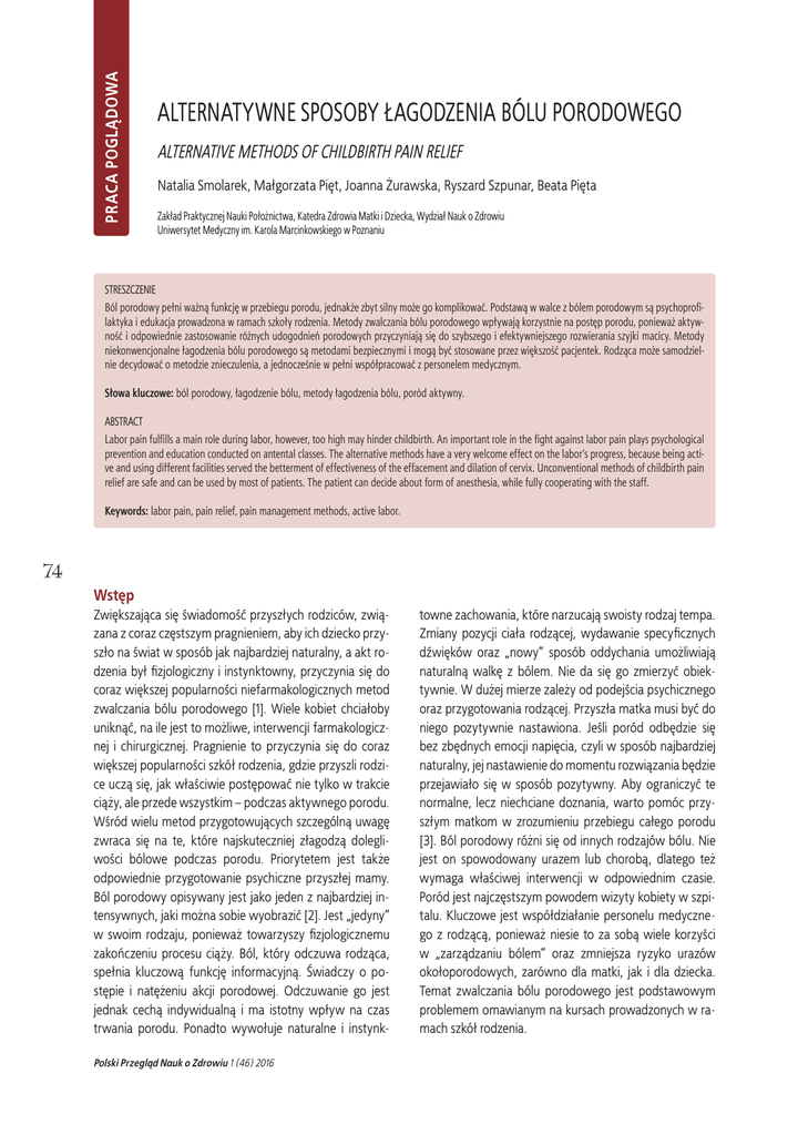 PRACA POGLĄDOWA ALTERNATYWNE SPOSOBY ŁAGODZENIA BÓLU PORODOWEGO ALTERNATIVE METHODS OF CHILDBIRTH PAIN RELIEF Natalia Smolarek, Małgorzata Pięt, Joanna Żurawska, Ryszard Szpunar, Beata Pięta Zakład Praktycznej Nauki Położnictwa, Katedra Zdrowia Matki i Dziecka, Wydział Nauk o Zdrowiu Uniwersytet Medyczny im. Karola Marcinkowskiego w Poznaniu STRESZCZENIE Ból porodowy pełni ważną funkcję w przebiegu porodu, jednakże zbyt silny może go komplikować. Podstawą w walce z bólem porodowym są psychoprofilaktyka i edukacja prowadzona w ramach szkoły rodzenia. Metody zwalczania bólu porodowego wpływają korzystnie na postęp porodu, ponieważ aktywność i odpowiednie zastosowanie różnych udogodnień porodowych przyczyniają się do szybszego i efektywniejszego rozwierania szyjki macicy. Metody niekonwencjonalne łagodzenia bólu porodowego są metodami bezpiecznymi i mogą być stosowane przez większość pacjentek. Rodząca może samodzielnie decydować o metodzie znieczulenia, a jednocześnie w pełni współpracować z personelem medycznym. Słowa kluczowe: ból porodowy, łagodzenie bólu, metody łagodzenia bólu, poród aktywny. ABSTRACT Labor pain fulfills a main role during labor, however, too high may hinder childbirth. An important role in the fight against labor pain plays psychological prevention and education conducted on antental classes. The alternative methods have a very welcome effect on the labor’s progress, because being active and using different facilities served the betterment of effectiveness of the effacement and dilation of cervix. Unconventional methods of childbirth pain relief are safe and can be used by most of patients. The patient can decide about form of anesthesia, while fully cooperating with the staff. Keywords: labor pain, pain relief, pain management methods, active labor. 74 Wstęp Zwiększająca się świadomość przyszłych rodziców, związana z coraz częstszym pragnieniem, aby ich dziecko przyszło na świat w sposób jak najbardziej naturalny, a akt rodzenia był fizjologiczny i instynktowny, przyczynia się do coraz większej popularności niefarmakologicznych metod zwalczania bólu porodowego [1]. Wiele kobiet chciałoby uniknąć, na ile jest to możliwe, interwencji farmakologicznej i chirurgicznej. Pragnienie to przyczynia się do coraz większej popularności szkół rodzenia, gdzie przyszli rodzice uczą się, jak właściwie postępować nie tylko w trakcie ciąży, ale przede wszystkim – podczas aktywnego porodu. Wśród wielu metod przygotowujących szczególną uwagę zwraca się na te, które najskuteczniej złagodzą dolegliwości bólowe podczas porodu. Priorytetem jest także odpowiednie przygotowanie psychiczne przyszłej mamy. Ból porodowy opisywany jest jako jeden z najbardziej intensywnych, jaki można sobie wyobrazić [2]. Jest „jedyny” w swoim rodzaju, ponieważ towarzyszy fizjologicznemu zakończeniu procesu ciąży. Ból, który odczuwa rodząca, spełnia kluczową funkcję informacyjną. Świadczy o postępie i natężeniu akcji porodowej. Odczuwanie go jest jednak cechą indywidualną i ma istotny wpływ na czas trwania porodu. Ponadto wywołuje naturalne i instynkPolski Przegląd Nauk o Zdrowiu 1 (46) 2016 towne zachowania, które narzucają swoisty rodzaj tempa. Zmiany pozycji ciała rodzącej, wydawanie specyficznych dźwięków oraz „nowy” sposób oddychania umożliwiają naturalną walkę z bólem. Nie da się go zmierzyć obiektywnie. W dużej mierze zależy od podejścia psychicznego oraz przygotowania rodzącej. Przyszła matka musi być do niego pozytywnie nastawiona. Jeśli poród odbędzie się bez zbędnych emocji napięcia, czyli w sposób najbardziej naturalny, jej nastawienie do momentu rozwiązania będzie przejawiało się w sposób pozytywny. Aby ograniczyć te normalne, lecz niechciane doznania, warto pomóc przyszłym matkom w zrozumieniu przebiegu całego porodu [3]. Ból porodowy różni się od innych rodzajów bólu. Nie jest on spowodowany urazem lub chorobą, dlatego też wymaga właściwej interwencji w odpowiednim czasie. Poród jest najczęstszym powodem wizyty kobiety w szpitalu. Kluczowe jest współdziałanie personelu medycznego z rodzącą, ponieważ niesie to za sobą wiele korzyści w „zarządzaniu bólem” oraz zmniejsza ryzyko urazów okołoporodowych, zarówno dla matki, jak i dla dziecka. Temat zwalczania bólu porodowego jest podstawowym problemem omawianym na kursach prowadzonych w ramach szkół rodzenia. Trudno jest przedstawić wyniki badań z danego kraju na temat częstości stosowania danej metody, ponieważ dotychczas nie przeprowadzono takich badań. Zazwyczaj przeprowadzane są w konkretnym ośrodku czy też szpitalu położniczym. Efektywność oceniana jest osobno, mimo iż wiele technik stosowanych jest zazwyczaj razem [4]. Niektóre publikacje wskazują na skuteczność stosowania immersji wodnej, inne – na akupunkturę. Ponadto jako cieszące się zainteresowaniem zarówno wśród rodzących, jak i personelu medycznego wymienia się akupresurę w połączeniu z masażem oraz techniki relaksacyjne [5]. Hipnoza jest również zaliczana do jednej z alternatywnych metod łagodzenia bólu porodowego. Wykorzystuje się jej wpływ na równoważenie emocji oraz niwelowanie przyczyn bólu i napięcia emocjonalnego związanego z aktem samego porodu [3]. Jednakże wsparcie profesjonalnie wyszkolonego personelu medycznego ma największe znaczenie w łagodzeniu bólu i niejednokrotnie zmniejsza potrzebę zastosowania farmakologicznych środków przeciwbólowych [6]. Obok psychoprofilaktyki okołoporodowej jako skuteczne wymienia się również masaż, muzykoterapię, kinezyterapię wertykalną oraz zastosowanie TENS, czyli przezskórnej stymulacji elektrycznej nerwów. Światowe piśmiennictwo wskazuje również na kliniczne zalety korzystania z niefarmakologicznych metod łagodzenia bólu porodowego. Do zalet tych zalicza się m.in. króts