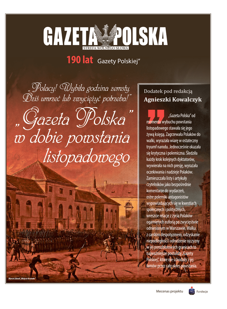 190 lat „Gazety Polskiej” „Polacy! Wybiła godzina zemsty. Dziś umrzeć lub zwyciężyć potrzeba!” „Gazeta Polska” w dobie powstania listopadowego „„ Dodatek pod redakcją Agnieszki Kowalczyk „Gazeta Polska” od momentu wybuchu powstania listopadowego stawała się jego żywą księgą. Zagrzewała Polaków do walki, wyrażała wiarę w ostateczny tryumf narodu. Jednocześnie okazała się krytyczna i polemiczna. Śledziła każdy krok kolejnych dyktatorów, wywierała na nich presję, wyrażała oczekiwania i nadzieje Polaków. Zamieszczała listy i artykuły czytelników jako bezpośrednie komentarze do wydarzeń, ostre polemiki antagonistów wypowiadających się w kwestiach społecznych i politycznych, wreszcie relacje z życia Polaków ogarniętych euforią po zwycięstwie odniesionym w Warszawie. Walka z carskim despotyzmem, odzyskanie niepodległości i odrodzenie ojczyzny w jej porozbiorowych granicach to najważniejsze postulaty „Gazety Polskiej”, które nie schodziły z jej łamów przez cały okres powstania. Marcin Zaleski „Wzięcie Arsenału” Mecenas projektu II DODATEK SPECJALNY \ 190-lecie „Gazety Polskiej” politykę Mikołaja I i sytuację Królestwa Kongresowego, w którym od lat obowiązywała ścisła cenzura… 27 lipca zaczęło się w Paryżu prawdziwe piekło. Oto wybuchła rewolucja. Dokładny jej przebieg przedstawiony został w numerze „Gazety Polskiej” z 11 sierpnia jako „Rys wypadków, które zaburzyły stolicę Francji”. Zarzewiem rozruchów, jak podaje nasz dziennik, była próba pogwałcenia wolności słowa drukowanego: „Już d. 24 to jest w wigilię podpisania przez króla postanowień; kazała policja zająć kilka broszur różnej treści, w magazynie najętym przez margr: de Chabannes w Palais-Royal. Jednakże mimo to rozszerzano z tego punktu różne pisma; w dniu więc 26 po południu komisarz policji w Palais-Royal udał się do biura dziennika »Rogénerateur«, […] kazał sklep zamknąć i postawił dwóch żandarmów […]. Nazajutrz z rana wyszło 12 gazet opozycyjnych bez uzyskanej poprzednio autoryzacji ministra; policja więc i żandarmeria […] opieczętowała lub zabrała prasy i czcionki w drukarniach. Nie działo się to bez oporu; największy stawiali wydawcy dzienników »Temps« i »Figaro«; musiano drzwi wybijać, prasy zostały pogruchotane, czcionki wrzucone w Sekwanę. Ucierpiała 1 Eugène Delacroix „Wolność wiodąca lud na barykady” „„ Egide Charles Gustave Wappers „Epizod z belgijskiej rewolucji 1830” Gazeta Polska” z 17 sierpnia uświadamiała swoim czytelnikom, że rewolucja francuska zwyciężyła, chociaż „przeciwko pospólstwu walczyło w ciągu rozruchu 18 000 wojska”. Naród okazał się siłą potężną, zdolną przeciwstawić się skutecznie nawet regularnej armii. Wojna o gazety, czyli jak wybuchła rewolucja lipcowa we Francji 7 sierpnia 1830 r. W letni upalny dzień Warszawę obiegła niespodziewana wiadomość o wybuchu rewolucji w Paryżu. Już w czerwcu tajna policja odnotowała, że w stolicy krążą wieści z Francji o wzrastającym niezadowoleniu społeczeństwa, które lada dzień może wystąpić przeciwko monarsze. 8 sierpnia wielki książę Konstanty wezwał do siebie generała Krukowieckiego, a tematem ich rozmowy była oczywiście rewolucja lipcowa. Krukowiecki udawał, że nie ma pojęcia o sytuacji politycznej we Francji. Wiedział, że Konstanty może wpaść w furię, ostrożność była konieczna: „Nie czytał pan o tym w gazetach? – spytał cesarzewicz. – Proszę o wybaczenie Waszą Cesarską Wysokość, ale gazety nic o tym nie mówią, przeglądałem dokładnie ostatnie wydania. […] – Mówię o gazetach francuskich […]. Miała miejsce ohydna rewolucja w Paryżu w ostatnich dniach zeszłego miesiąca; król postąpił głupio, wszyscy stracili głowę, ministrowie i generałowie nie potrafili docenić sił, które mieli w rękach, i motłoch, ach, przepraszam, naród zatriumfował…”. „Wypadki, które zaburzyły stolicę Francji” „Gazeta Polska” od początku śledziła z uwagą wydarzenia rozgrywające się nad Sekwaną. W numerze 212 z 9 sierpnia 1830 r. zamieszczone zostały rozporządzenia wydane przez despotycznego władcę francuskiego Karola X. Nakazał on rozwiązać Izbę Deputowanych, ograniczył prawa wyborcze obywateli i wolność druku. Postanowił raz na zawsze rozprawić się z prasą, zamknąć usta dziennikarzom, którzy swoimi artykułami podburzali Francuzów przeciwko władzy. Można się tylko domyślać, jak bardzo posunięcia Karola X przypominały Polakom „Gazeta Polska” o Ludwiku Filipie Orleańskim: „Przez dzień król się rzadko pokazuje, pracuje z ministrami; około godziny 6 wieczorem dwa oddziały muzyki wojskowej i miejskiej grają kolejno w dziedzińcu Palais Royal marsze, pieśni, osobliwie hymn Marsylczyków, wyjątki z Rossiniego Wilhelma Tella itp. Lud wtóruje im śpiewem i klaskiem w ręce, a chłopcy uliczni wdzierają się aż do okien N. Pana. […] O godzinie 7 król występuje na balkon […]. Lud wydaje okrzyki, i wśród wiwatów rzuca do góry czapki i kapelusze. Monarcha kłania się z twarzą wesołą i bije takt do hymnu Marsylczyków”. przy tym znacznie i drukarnia Dodota. […] Tymczasem ajenci roznosili i dzienniki i różne pisma buntownicze, po ulicach, placach i kawiarniach; inni odczytywali głośno odezwy rewolucyjne lub przylepiali je na giełdzie, na rogach ulic, na miejscach publicznych. […] Policja zaczęła po kawiarniach zabierać dzienniki i pisma rewolucyjne nadzwyczaj licznie rozsiane; tak np. rozmaitych protestacji rozszerzono 200,000 egzemplarzy”. Ideał władcy Naród francuski zrzucił z tronu tyrana z linii Burbonów, a osadził na nim księcia Ludwika Filipa Orleańskiego. W pamięci Polaków utkwić musiały z pewnością słowa cytowane w naszej prasie z paryskiego „Le Globe”: „Czyli książę Orleanu jest królem? 