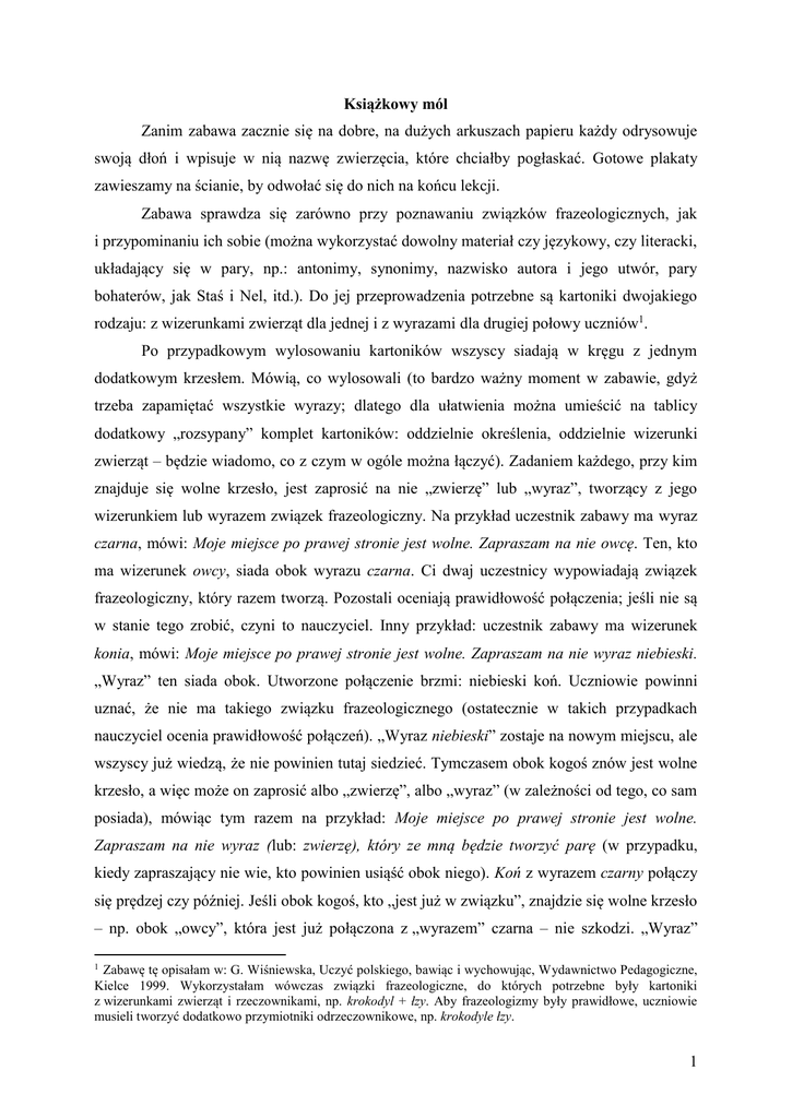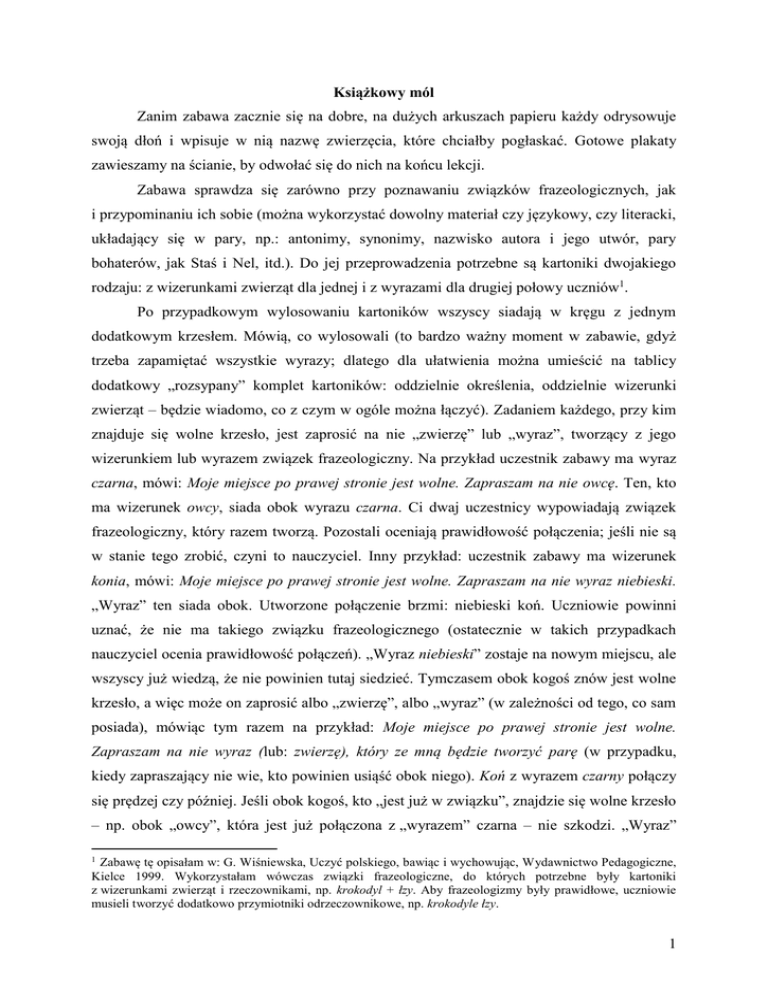 Książkowy mól Zanim zabawa zacznie się na dobre, na dużych arkuszach papieru każdy odrysowuje swoją dłoń i wpisuje w nią nazwę zwierzęcia, które chciałby pogłaskać. Gotowe plakaty zawieszamy na ścianie, by odwołać się do nich na końcu lekcji. Zabawa sprawdza się zarówno przy poznawaniu związków frazeologicznych, jak i przypominaniu ich sobie (można wykorzystać dowolny materiał czy językowy, czy literacki, układający się w pary, np.: antonimy, synonimy, nazwisko autora i jego utwór, pary bohaterów, jak Staś i Nel, itd.). Do jej przeprowadzenia potrzebne są kartoniki dwojakiego rodzaju: z wizerunkami zwierząt dla jednej i z wyrazami dla drugiej połowy uczniów1. Po przypadkowym wylosowaniu kartoników wszyscy siadają w kręgu z jednym dodatkowym krzesłem. Mówią, co wylosowali (to bardzo ważny moment w zabawie, gdyż trzeba zapamiętać wszystkie wyrazy; dlatego dla ułatwienia można umieścić na tablicy dodatkowy „rozsypany” komplet kartoników: oddzielnie określenia, oddzielnie wizerunki zwierząt – będzie wiadomo, co z czym w ogóle można łączyć). Zadaniem każdego, przy kim znajduje się wolne krzesło, jest zaprosić na nie „zwierzę” lub „wyraz”, tworzący z jego wizerunkiem lub wyrazem związek frazeologiczny. Na przykład uczestnik zabawy ma wyraz czarna, mówi: Moje miejsce po prawej stronie jest wolne. Zapraszam na nie owcę. Ten, kto ma wizerunek owcy, siada obok wyrazu czarna. Ci dwaj uczestnicy wypowiadają związek frazeologiczny, który razem tworzą. Pozostali oceniają prawidłowość połączenia; jeśli nie są w stanie tego zrobić, czyni to nauczyciel. Inny przykład: uczestnik zabawy ma wizerunek konia, mówi: Moje miejsce po prawej stronie jest wolne. Zapraszam na nie wyraz niebieski. „Wyraz” ten siada obok. Utworzone połączenie brzmi: niebieski koń. Uczniowie powinni uznać, że nie ma takiego związku frazeologicznego (ostatecznie w takich przypadkach nauczyciel ocenia prawidłowość połączeń). „Wyraz niebieski” zostaje na nowym miejscu, ale wszyscy już wiedzą, że nie powinien tutaj siedzieć. Tymczasem obok kogoś znów jest wolne krzesło, a więc może on zaprosić albo „zwierzę”, albo „wyraz” (w zależności od tego, co sam posiada), mówiąc tym razem na przykład: Moje miejsce po prawej stronie jest wolne. Zapraszam na nie wyraz (lub: zwierzę), który ze mną będzie tworzyć parę (w przypadku, kiedy zapraszający nie wie, kto powinien usiąść obok niego). Koń z wyrazem czarny połączy się prędzej czy później. Jeśli obok kogoś, kto „jest już w związku”, znajdzie się wolne krzesło – np. obok „owcy”, która jest już połączona z „wyrazem” czarna – nie szkodzi. „Wyraz” Zabawę tę opisałam w: G. Wiśniewska, Uczyć polskiego, bawiąc i wychowując, Wydawnictwo Pedagogiczne, Kielce 1999. Wykorzystałam wówczas związki frazeologiczne, do których potrzebne były kartoniki z wizerunkami zwierząt i rzeczownikami, np. krokodyl + łzy. Aby frazeologizmy były prawidłowe, uczniowie musieli tworzyć dodatkowo przymiotniki odrzeczownikowe, np. krokodyle łzy. 1 1 czarna przesiada się, by znów po czyjejś prawej stronie było wolne krzesło. Zabawa przebiega dalej bez zakłóceń. Ważną zaletą zabawy jest to, że daje szansę wszystkim uczniom: i tym, którzy znają skądinąd zaproponowane związki frazeologiczne, i tym, którzy dopiero je poznają. Uczniowie mają prawo do tylu prób i sukcesów, do „głośnego myślenia”2, ile potrzebują, by samodzielnie połączyć się w pary. Podejmowanie kolejnych prób to wielokrotne powtarzanie tego samego materiału, ponieważ uczniowie, którzy już tworzą prawidłowy związek, cały czas biorą udział w zabawie i podlegają tym samym regułom, a więc też wymawiają głośno „swój” frazeologizm, co wpływa na utrwalenie go. Niebagatelną rzeczą jest też i to, że zabawa zaspokaja potrzeby kinestetyków. Sceptycy pewnie powiedzą, że szkoda czasu na taką „zgadywankę”. Prościej jest podyktować uczniom gotowe związki frazeologiczne i polecić zapamiętanie ich. „Będzie to jednak wyuczenie się nazw, które szybko opuszczą pamięć”3. Ten sam materiał może funkcjonować jako rozsypanka obrazkowo-wyrazowa. Jeśli na odwrocie kartoników umieścimy jakieś symbole, jak to widać niżej (zauważmy, że na odwrocie kartoników z wizerunkami koni, widnieją dwa różne symbole; wszak połączenie może być inne, ale przecież także prawidłowe), uczniowie sami będą mogli kontrolować przebieg zadania: czarny * *+ + +* trojański 4–5-osobowe grupy otrzymują dowolną liczbę kartoników (oczywiście, muszą one tworzyć pary). W tej sytuacji – jak widać – mamy dużo większe możliwości wyboru liczby frazeologizmów. Zadaniem uczniów jest utworzenie prawidłowych związków (np. każda grupa innych, wszystkie grupy takich samych). D. Barnes, Nauczyciel i uczniowie. Od porozumiewania się do kształcenia, tłum. J. Radzicki, WSiP, Warszawa 1988. 3 Sztuka nauczania. Czynności nauczyciela, pod red. K. Kruszewskiego, PWN, Warszawa 1994, s. 116. 2 2 Bez względu na to, którą wersję wybierzemy, ten etap pracy proponuję zakończyć słowniczkiem poznanych (i przypomnianych) związków frazeologicznych w formie planu podwórka wiejskiego4, na którym uczniowie, słuchając tekstu, umieszczają bohaterów tychże: Na podwórko wchodzimy od południa. Po prawej stronie jest nieduży ogrodzony plac, na którym mieszka owca. Rośnie tu też rozłożyste drzewo. Jego mieszkańców co prawda nie widać, ale bardzo dobrze słychać. Po przeciwnej stronie gospodarz umieścił budę, a na środku podwórka oczko wodne w kształcie koła. W tej chwili wydaje się niezamieszkane, bo ryba skryła się na dnie. Na jego brzegu wygrzewa się natomiast kaczka. We wschodniej części podwórka za półokrągłym ogrodzeniem w prawym górnym rogu odpoczywa osioł, w części 