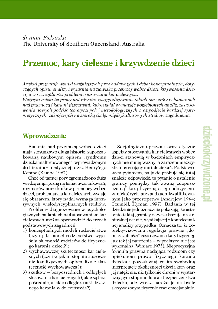 dr Anna Piekarska The University of Southern Queensland, Australia Przemoc, kary cielesne i krzywdzenie dzieci Artykuł prezentuje wyniki ważniejszych prac badawczych i debat konceptualnych, dotyczących opisu, analizy i wyjaśniania zjawiska przemocy wobec dzieci, krzywdzenia dzieci, a w szczególności problemu stosowania kar cielesnych. Ważnym celem tej pracy jest również zasygnalizowanie takich obszarów w badaniach nad przemocą i karami fizycznymi, które nadal wymagają pogłębionych analiz, zastosowania nowych podejść teoretycznych i metodologicznych oraz podjęcia bardziej systematycznych, zakrojonych na szeroką skalę, międzykulturowych studiów zagadnienia. Wprowadzenie Badania nad przemocą wobec dzieci mają stosunkowo długą historię, zapoczątkowaną naukowym opisem „syndromu dziecka maltretowanego”, wprowadzonym do literatury medycznej przez Henry’ego Kempe (Kempe 1962). Choć od tamtej pory zgromadzono dużą wiedzę empiryczną na temat uwarunkowań, rozmiarów oraz skutków przemocy wobec dzieci, problematyka kar cielesnych wydaje się obszarem, który nadal wymaga intensywnych, wielodyscyplinarnych studiów. Problemy diagnozowane w psychologicznych badaniach nad stosowaniem kar cielesnych można sprowadzić do trzech podstawowych zagadnień: 1) konceptualnych modeli rodzicielstwa (czy i jaki model rodzicielstwa wyjaśnia skłonność rodziców do fizycznego karania dzieci?); 2) wychowawczej skuteczności kar cielesnych (czy i w jakim stopniu stosowanie kar fizycznych optymalizuje skuteczność wychowawczą?); 3) skutków – bezpośrednich i odległych stosowania kar cielesnych (jakie są bezpośrednie, a jakie odległe skutki fizycznego karania w dzieciństwie?). Socjologiczno-prawne oraz etyczne aspekty stosowania kar cielesnych wobec dzieci stanowią w badaniach empirycznych nie mniej ważny, a zarazem niezwykle interesujący nurt dociekań. Podstawowym pytaniem, na jakie próbuje się tutaj znaleźć odpowiedź, to pytanie o ustalenie granicy pomiędzy tak zwaną „dopuszczalną” karą fizyczną a jej nadużyciem, w niektórych przypadkach kwalifikowanym jako przestępstwo (Andrejew 1964; Czumbil, Hyman 1997). Badania w tej dziedzinie jednoznacznie pokazują, że ustalenie takiej granicy zawsze bazuje na arbitralnej ocenie, wynikającej z kontekstualnej analizy przypadku. Oznacza to, że zobiektywizowana regulacja prawna „dopuszczalności” zastosowania kary fizycznej, jak też jej natężenia – w praktyce nie jest wykonalna (Winiarz 1973). Nieprecyzyjna formuła prawna nadająca rodzicom czy opiekunom prawo fizycznego karania dziecka i pozostawiająca im swobodną interpretację okoliczności użycia kary oraz jej natężenia, nie tylko nie chroni w wystarczającym stopniu dobra i bezpieczeństwa dziecka, ale wręcz naraża je na bycie skrzywdzonym fizycznie oraz emocjonalnie. 1 Piekarska / Przemoc, kary cielesne i krzywdzenie dzieci Tymczasem wyniki niemal wszystkich badań nad przemocą wobec dziecka czy karami fizycznymi jednoznacznie wskazują na ich znaczne, negatywne konsekwencje. Dotyczą one nie tylko bezpośredniego ryzyka „nadużycia” kary, prowadzącego do fizycznego oraz emocjonalnego skrzywdzenia dziecka, ale też do zaakceptowania przemocy fizycznej i w konsekwencji praktykowania kar fizycznych w stosunku do własnych dzieci. Dyskusje wokół definicji Analiza problematyki kar cielesnych wymaga wyboru kontekstu teoretycznego oraz przyjęcia ustaleń terminologicznych. Wydaje się, że najbardziej właściwym będzie ulokowanie kar fizycznych w obszarze badań nad przemocą w rodzinie, w szczególności w obszarze badań dotyczących krzywdzenia dziecka. Agresja, przemoc i kary fizyczne „Przemoc” jest definiowana jako akt przeprowadzony z intencją (lub percepowany jako intencjonalny) zadania cierpienia fizycznego innej osobie (Gelles, Straus 1979). Cierpienie fizyczne może przebiegać na kontinuum od słabego bólu (np. klaps) do bólu ekstremalnego (np. ciężkie lanie). Intencja zadania bólu może wynikać z różnych przyczyn czy pobudek. W przypadku stosowania klapsów rodzic może chcieć dyscyplinować dziecko lub uchronić je przed niebezpieczeństwem. Rodzic może ciężko pobić dziecko np. dlatego, że próbuje ono bronić się przed jego przemocą. Kryterium intencjonalności przemocy, podobnie jak agresji, jest powodem najpoważniejszych sporów dotyczących definiowania tych zachowań (Frączek 1986). Wynikają one z faktu, że intencja oraz motyw są przypisane do aktu przez osobę realizującą ten akt lub przez osoby obserwujące akt w trakcie jego przebiegu albo już po jego ustaniu. Aby rozwiązać problem intencjonalności zadania cierpienia, w definicji przemocy często dodaje się, że jest to „zachowanie postrzegane jako mające taką intencję”. Poważne spory budzi też problem cierpienia – skutku aktu przemocy, jako definiującego kryterium. Wiele aktów przemocy z intencją spowodowania bólu w istocie go nie powoduje, podczas gdy szereg czynów nie mających takiej intencji może doprowadzić do doświadczania przez ofiarę cierpienia. Z tego powodu kryterium skutku (cierpienia) jest często odrzucane w definicjach przemocy i zastępowane intencją (lub postrzeganą intencją) zadania cierpienia. W badaniach nad przemocą w rodzinie unika się zastępowania terminu „przemoc” terminem „agresja” (Steinmetz, Straus 1973). Uważa się bowiem, że przemoc to także kary cielesne praktykowane intencjonalnie w wychowaniu dzieci i nie zawierające intencji szkodzenia (co jest elementem definicji „agresji”), za to w oczywisty sposób motywowane intencją zadania cierpienia czy bólu fizycznego. Niektórzy autorzy (Gelles, Straus 1979) proponują wręcz zastępowanie terminu „agresja fizyczna” terminem „przemoc”, ponieważ określane tym mianem zachowania posiadają unikalną charakterystykę, taką jak intencja zadania bólu czy cierpienia fizycznego, ale niekoniecznie mo