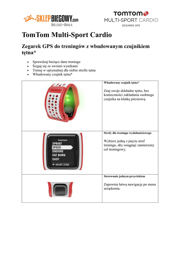 TomTom Multi-Sport Cardio Zegarek GPS do treningów z wbudowanym czujnikiem tętna* Sprawdzaj bieżące dane treningu Ścigaj się ze swoimi wynikami Trenuj w optymalnej dla siebie strefie tętna Wbudowany czujnik tętna* Wbudowany czujnik tętna* Znaj swoje dokładne tętno, bez konieczności zakładania osobnego czujnika na klatkę piersiową. Strefy dla treningu wydolnościowego Wybierz jedną z pięciu stref treningu, aby osiągnąć zamierzony cel treningowy. Sterowanie jednym przyciskiem Zapewnia łatwą nawigację po menu urządzenia. Wyjątkowo duży wyświetlacz Jednym rzutem oka sprawdzaj informacje dotyczące biegu, jazdy rowerem lub pływania. Wysoce ergonomiczna konstrukcja Trenuj z zegarkiem zaprojektowanym z myślą o wielu dyscyplinach sportu. Trening interwałowy Ustal własny program treningu interwałowego, który pomoże Ci poprawić prędkość i kondycję. Technologia QuickGPSFix Usługa QuickGPSFix skraca czas ustalania lokalizacji, dzięki czemu możesz szybciej rozpocząć trening. Aplikacja mobilna TomTom MySports Automatycznie zsynchronizuj zegarek z aplikacją TomTom MySports. Dane techniczne Czas pracy baterii - Do 8 godzin (GPS + tętno), do 10 godzin (GPS) Rozmiar wyświetlacza - 22 x 25 mm Waga i wymiary Rozdzielczość wyświetlacza - 144 x 168 Grubość - 13,8 mm Waga - 63 gramów Długość paska - 233 mm Pozycja - GPS + GLONASS Lokalizacja Location Boost - QuickGPSFix Czujniki (wewnętrzne) - Czujnik ruchu, kompas, optyczny czujnik tętna Czujniki Czujnik (bezprzewodowy) - Bluetooth® Smart Wodoszczelność Ostrzeżenia - Sygnał dźwiękowy i wibracja Zabezpieczenie przed działaniem wody 50m/165 feet (5 ATM) Tempo/szybkość - Tak Odległość/calorie - Tak Pomiary Tętno - Tak (wbudowany czujnik tętna*) Rytm - Tak (czujnik rytmu – akcesorium opcjonalne) Biegi w pomieszczaniach - Tak Aktywności Biegi na wolnym powietrzu - Tak Kolarstwo - Tak Specjalny uchwyt rowerowy - Tak Pływanie - Tak Wyścig - Historia aktywności + ulubione Cele - Czas, odległość lub kalorie Strefa - Tempo lub tętno Trening Okrążenia - Tempo lub tętno Obsługiwane języki Interwały - Tak Angielski, hiszpański, niemiecki, francuski, włoski, fiński, portugalski, holenderski, czeski, polski * Ten czujnik tętna nie jest urządzeniem medycznym. Przed rozpoczęciem programu ćwiczeń należy zawsze skonsultować się z lekarzem. Osoby z wszczepionym rozrusznikiem serca lub innymi urządzeniem elektronicznym powinny przed rozpoczęciem korzystania z tego produktu skonsultować się ze swoim lekarzem. Stosowanie tego produktu podczas ćwiczeń może odwracać uwagę od otoczenia lub wykonywanych czynności. Zakłócenia spowodowane sygnałem z zewnętrznych źródeł, słaby kontakt z nadgarstkiem i inne czynniki mogą zakłócać dokładne odczyty tętna i przesyłanie danych. Firma TomTom zrzeka się wszelkiej odpowiedzialności za tego rodzaju niedokładności. Pełna oferta zegarków TOMTOM dostępna jest w Sklepie Biegowym w Bielsku-Białej (pasaż Tesco Extra) ulica Warszawska 180. Zapraszamy! Odwiedź nas w sieci Internet: www.sklepbiegowy.com