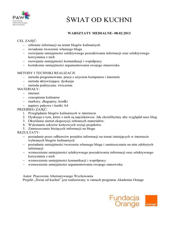 ŚWIAT OD KUCHNI WARSZTATY MEDIALNE- 08.02.2013 CEL ZAJĘĆ: − zebranie informacji na temat blogów kulinarnych − świadome tworzenie własnego bloga − rozwijanie umiejętności selektywnego poszukiwania informacji oraz selektywnego korzystania z nich − rozwijanie umiejętności komunikacji i współpracy − kształcenie umiejętności argumentowania swojego stanowiska METODY I TECHNIKI REALIZACJI: − metoda programowana: praca z użyciem komputera i internetu − metoda aktywizująca: dyskusja − metoda praktyczna: ćwiczenia MATERIAŁY: − internet − czasopisma kulinarne − markery, długopisy, kredki − papiery pakowe i kartki A4 PRZEBIEG ZAJĘĆ: 1. Przeglądanie blogów kulinarnych w internecie 2. Dyskusja o tym, które z nich są najciekawsze. Jak chcielibyśmy aby wyglądał nasz blog. 3. Określenie metod ekspozycji zebranych materiałów. 4. Wykonanie szkiców końcowych wersji projektów. 5. Zamieszczanie bieżących informacji na blogu REZULTATY: − posiadanie przez odbiorców projektu informacji na temat istniejących w internecie wybranych blogów kulinarnych − posiadanie umiejętności tworzenia własnego bloga i zamieszczania na nim zdobytych informacji − wzmocnienie umiejętności selektywnego poszukiwania informacji oraz selektywnego korzystania z nich − wzmocnienie umiejętności komunikacji i współpracy − wzmocnienie umiejętności argumentowania swojego stanowiska Autor: Pracownia Alternatywnego Wychowania Projekt „Świat od kuchni” jest realizowany w ramach programu Akademia Orange LISTA UCZESTNIKÓW: 1.Aleksandra Cymer 2.Maciej Kozłowski 3.Paulina Ziółkowska 4.Marta Ziółkowska 5.Bartek Sobuń 6.Marcin Chojnacki 7.Grzegorz Pasikowski 8.Justyna Różalska 9.Paulina Rynkiewicz 10. Aleksandra Zawadowska 11. Paulina Milczarek 12. Ewelina Wieczorek 13. Patrycja Siekiera 14. Karina Lubczyńska 15. Patrycja Kozanecka 16. Hanna Janczak 17. Oliwia Szambelan 18. Julia Szambelan 19. Martyna Milczarek 20. Dawid Nowak 21. Jakub Pilarz 22. Andrzej Kozłowski 23. GandaGanda Reszka 24.Oliwia Jukiel 25. Dawid Jukiel 26. Gabrysia Budzyńska 27. Miłosz Szambelan 28. Hubert Pilarz 29. Franciszek Janczak 30.Mikołaj Sobuń