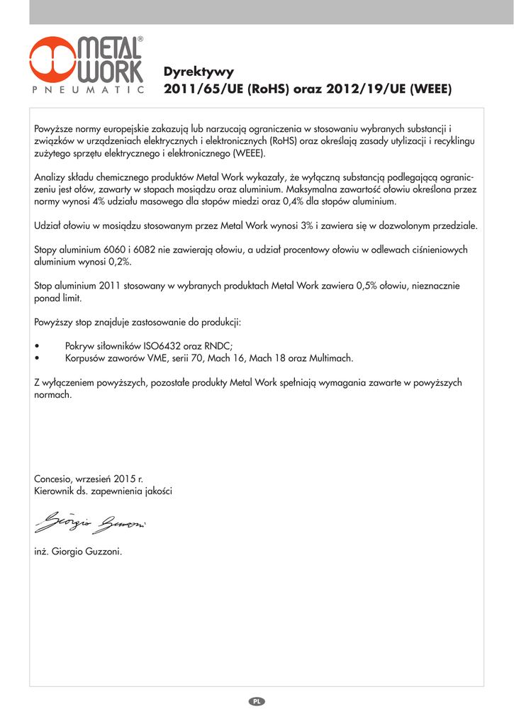 Dyrektywy 2011/65/UE (RoHS) oraz 2012/19/UE (WEEE) Powyższe normy europejskie zakazują lub narzucają ograniczenia w stosowaniu wybranych substancji i związków w urządzeniach elektrycznych i elektronicznych (RoHS) oraz określają zasady utylizacji i recyklingu zużytego sprzętu elektrycznego i elektronicznego (WEEE). Analizy składu chemicznego produktów Metal Work wykazały, że wyłączną substancją podlegającą ograniczeniu jest ołów, zawarty w stopach mosiądzu oraz aluminium. Maksymalna zawartość ołowiu określona przez normy wynosi 4% udziału masowego dla stopów miedzi oraz 0,4% dla stopów aluminium. Udział ołowiu w mosiądzu stosowanym przez Metal Work wynosi 3% i zawiera się w dozwolonym przedziale. Stopy aluminium 6060 i 6082 nie zawierają ołowiu, a udział procentowy ołowiu w odlewach ciśnieniowych aluminium wynosi 0,2%. Stop aluminium 2011 stosowany w wybranych produktach Metal Work zawiera 0,5% ołowiu, nieznacznie ponad limit. Powyższy stop znajduje zastosowanie do produkcji: • • Pokryw siłowników ISO6432 oraz RNDC; Korpusów zaworów VME, serii 70, Mach 16, Mach 18 oraz Multimach. Z wyłączeniem powyższych, pozostałe produkty Metal Work spełniają wymagania zawarte w powyższych normach. Concesio, wrzesień 2015 r. Kierownik ds. zapewnienia jakości inż. Giorgio Guzzoni. PL