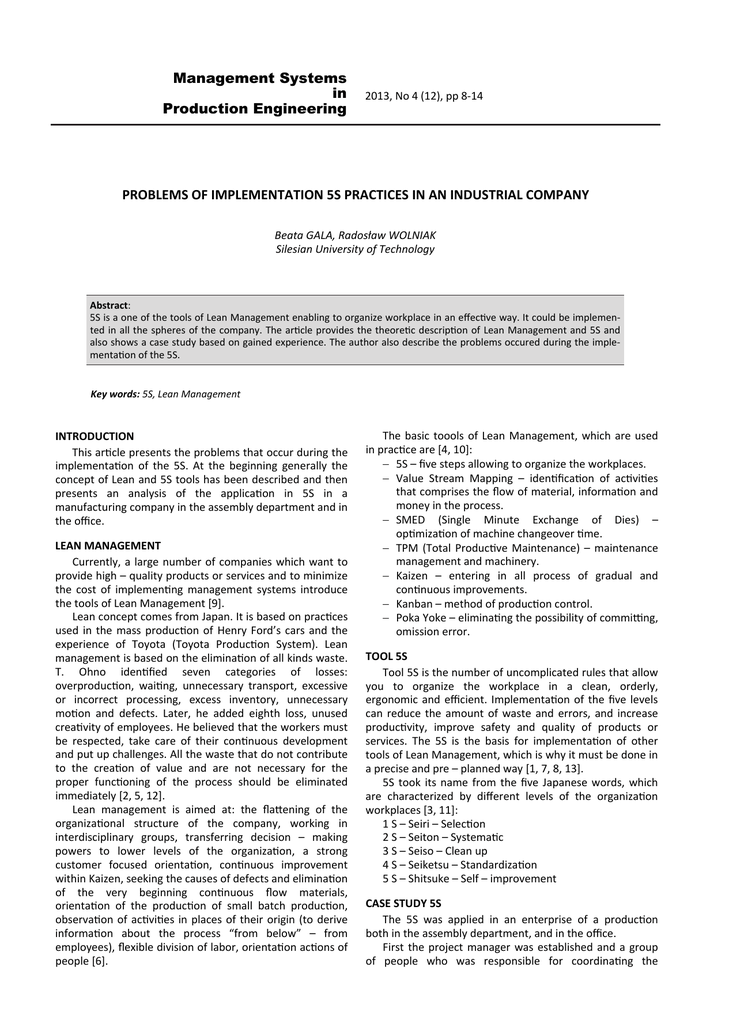 Management Systems in Production Engineering 2013, No 4 (12), pp 8‐14 PROBLEMS OF IMPLEMENTATION 5S PRACTICES IN AN INDUSTRIAL COMPANY Beata GALA, Radosław WOLNIAK Silesian University of Technology Abstract: 5S is a one of the tools of Lean Management enabling to organize workplace in an effec ve way. It could be implemen‐ ted in all the spheres of the company. The ar cle provides the theore c descrip on of Lean Management and 5S and also shows a case study based on gained experience. The author also describe the problems occured during the imple‐ menta on of the 5S. Key words: 5S, Lean Management INTRODUCTION This ar cle presents the problems that occur during the implementa on of the 5S. At the beginning generally the concept of Lean and 5S tools has been described and then presents an analysis of the applica on in 5S in a manufacturing company in the assembly department and in the office. LEAN MANAGEMENT Currently, a large number of companies which want to provide high – quality products or services and to minimize the cost of implemen ng management systems introduce the tools of Lean Management [9]. Lean concept comes from Japan. It is based on prac ces used in the mass produc on of Henry Ford’s cars and the experience of Toyota (Toyota Produc on System). Lean management is based on the elimina on of all kinds waste. T. Ohno iden fied seven categories of losses: overproduc on, wai ng, unnecessary transport, excessive or incorrect processing, excess inventory, unnecessary mo on and defects. Later, he added eighth loss, unused crea vity of employees. He believed that the workers must be respected, take care of their con nuous development and put up challenges. All the waste that do not contribute to the crea on of value and are not necessary for the proper func oning of the process should be eliminated immediately [2, 5, 12]. Lean management is aimed at: the fla ening of the organiza onal structure of the company, working in interdisciplinary groups, transferring decision – making powers to lower levels of the organiza on, a strong customer focused orienta on, con nuous improvement within Kaizen, seeking the causes of defects and elimina on of the very beginning con nuous flow materials, orienta on of the produc on of small batch produc on, observa on of ac vi es in places of their origin (to derive informa on about the process “from below” – from employees), flexible division of labor, orienta on ac ons of people [6]. The basic toools of Lean Management, which are used in prac ce are [4, 10]: 5S – five steps allowing to organize the workplaces. Value Stream Mapping – iden fica on of ac vi es that comprises the flow of material, informa on and money in the process. SMED (Single Minute Exchange of Dies) – op miza on of machine changeover me. TPM (Total Produc ve Maintenance) – maintenance management and machinery. Kaizen – entering in all process of gradual and con nuous improvements. Kanban – method of produc on control. Poka Yoke – elimina ng the possibility of commi ng, omission error. TOOL 5S Tool 5S is the number of uncomplicated rules that allow you to organize the workplace in a clean, orderly, ergonomic and efficient. Implementa on of the five levels can reduce the amount of waste and errors, and increase produc vity, improve safety and quality of products or services. The 5S is the basis for implementa on of other tools of Lean Management, which is why it must be done in a precise and pre – planned way [1, 7, 8, 13]. 5S took its name from the five Japanese words, which are characterized by different levels of the organiza on workplaces [3, 11]: 1 S – Seiri – Selec on 2 S – Seiton – Systema c 3 S – Seiso – Clean up 4 S – Seiketsu – Standardiza on 5 S – Shitsuke – Self – improvement CASE STUDY 5S The 5S was applied in an enterprise of a produc on both in the assembly department, and in the office. First the project manager was established and a group of people who was responsible for coordina ng the Management Systems in Produc on Engineering 4(12)/2013 9 B. GALA, R. WOLNIAK ‐ Problems of implementa on 5S prac ces in an industrial company implementa on of all five steps and was responsible for the maintenance of the 5S. The team consisted of people involved in the work and were responsible for improving the current status quo. One person was from the outside of the company and expressed its “fresh” opinions and asking ques ons about things seemingly irrelevant to the employees of the assembly, and incomprehensible to outsiders. The team also joined a person in a management posi on who had formal authority. So the group had to complete the first task – to plan the project. The ambi on of the project was to determined the work breakdown structure, Gan chart was prepared (a graphical representa on of the sequence and dura on of the ac vi es in a given me), material resources, financial and human resources were assigned to the ac ons and an analysis of the poten al risks that may arise in the project was carried. Then the staff made aware of what is 5S system, how, when and why it is carried out, and what are the benefits. The training was conducted during the inventory, especially not to stop the installa on process. At firs mul media presenta on was presented with theore cal along with various examples of the applica on of 5S and conducted prac cal exercises showing the concept of the system. It was based on an early drawing a set number of pieces on the board with marker by two volunteers. Wherein the container contained 10 pens, including 9 broken markers. The task was divided into three stages. In the first, the container with all markers were placed at the end of the hall, in the second stage the broken markers leaving the pack with proper pen in the same place and in a third container was moved close to the table. In every stage of execu on me stopwatch measured drawings. This exercise was to show how much me is 