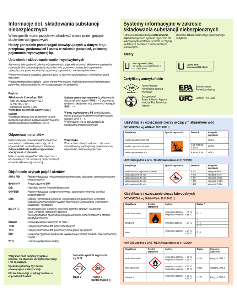 Informacje dot. składowania substancji niebezpiecznych Systemy informacyjne w zakresie składowania substancji niebezpiecznych W ten sposób można przepisowo składować ciecze palne i grożące skażeniem wód gruntowych. Należy generalnie przestrzegać obowiązujących w danym kraju przepisów, postanowień i ustaw w zakresie pozwoleń, zalecanej pojemności wychwytowej itp. Odnośnie dopuszczalnego zastosowania i odporności podano symbole zagrożenia dla składowanych substancji (symbole te znajdują się także na beczkach z niebezpiecznymi substancjami). Odnośnie atestu podano logo odpowiedniego certyfikatu. Atesty Ustawianie i składowanie wanien wychwytowych Aby można było zapewnić ochronę wód gruntowych, pojemniki, w których składowane są niepalne substancje lub substancje grożące skażeniem wód gruntowych, muszą być odpowiednio zabezpieczane przed wyciekami przy pomocy odpowiednich wanien wychwytowych. Wanny wychwytowe mogą być ustawiane tylko na równych powierzchniach, chronionych przed deszczem. Według niemieckich przepisów i ustaw wanna wychwytowa musi mieć pojemność największego pojemnika, jednak co najmniej 10% składowanej w niej substancji. Factory Mutual (niezależna agencja testująca) Environmental Protection-Agency Occupational Safety & Health Agency National Fire Protection Agency Uniform Fire Code Klasyfikacja / oznaczanie cieczy grożącym skażeniem wód DOTYCHCZAS wg WHG (do 30.11.2010 r.) Klasyfikacja Odporność materiałów Należy zapewnić i móc udowodnić odporność stosowanych materiałów na korozję oraz ich odpowiedniość do składowanych substancji. Odpowiedzialność za takie zapewnienie spoczywa na użytkowniku. Należy zawsze uwzględniać listy odporności i arkusze danych dot. substancji niebezpiecznych odnośnie składowanej substancji. Certyfikaty amerykańskie Stalowe wanny wychwytowe do składowania cieczy palnych kategorii GHS 1 – 3 oraz cieczy grożących skażeniem wód gruntowych kategorii GHS 1 – 4. Wanny wychwytowe z PE do składowania cieczy grożących skażeniem wód gruntowych kategorii GHS 1 – 4. W Niemczech nie są dopuszczone do składowania substancji palnych. Wskazówka W razie braku danych na listach odporności materiał wanny wychwytowej może zazwyczaj odpowiadać materiałowi pojemnika. Symbol zagrożenia Zestaw R Kategoria zagrożenia wysokie zagrożenie dla wód – WGK 3 średnie zagrożenie dla wód R 50, R 50/53, R 51/53 WGK 2 niskie zagrożenie dla wód R 52/53, R 53 WGK 1 NOWOŚĆ zgodnie z GHS / REACH (wdrożenie od 01.12.2010) Klasyfikacja Objaśnienie użytych pojęć i skrótów ADR / RID BetrSichV DIBt GGVSEB GHS IBC / KTC StawaR TRbF TRG ÜHP WHG Przepisy dotyczące międzynarodowego transportu kołowego i szynowego towarów niebezpiecznych Rozporządzenie BHP Niemiecki Instytut Techniki Budowlanej Przepisy dotyczące transportu kołowego, szynowego i wodnego towarów niebezpiecznych Globally Harmonized System of Classification and Labelling of Chemicals Globalnie Zharmonizowany System Klasyfikacji i Oznakowania Chemikaliów (substancji i mieszanek) Intermediate Bulk-Container (pośredni pojemnik zbiorczy) / Kubischer Tank-Container (sześcienny zbiornik) Wielkogabarytowe opakowania ciekłych substancji niebezpiecznych z atestem międzynarodowym Norma dla wanien stalowych do 1000 l Przepisy techniczne dot. cieczy łatwopalnych Przepisy techniczne dot. przechowywania gazów sprężonych Deklaracja zgodności producenta, wydawana po kontroli produktu przez uprawniony instytut Ustawa o gospodarce wodnej 118682 Pozostałe symbole zagrożenia wg GHS Żrące C Trujące T Bardzo trujące T+ Symbol zagrożenia bardzo wysokie zagrożenie dla wody stałe zagrożenie dla wód stałe zagrożenie dla wód stałe zagrożenie dla wód stałe zagrożenie dla wód Zestaw H Kategoria zagrożenia H 400 H 410 H 411 H 412 H 413 kategoria GHS 1 kategoria GHS 1 kategoria GHS 2 kategoria GHS 3 kategoria GHS 4 Klasyfikacja / oznaczanie cieczy łatwopalnych DOTYCHCZAS wg GefstoffV (do 30.11.2010 r.) Klasyfikacja Kryteria Zestaw R bardzo łatwopalne temperatura zapłonu < 0 °C temperatura wrzenia ≤ 35 °C R 12 łatwopalne temeratura zapłonu < 21 °C R 11 R 15 R 17 palne temperatura zapłonu ≥ 21 °C ≤ 55 °C R 10 Symbol zagrożenia NOWOŚĆ zgodnie z GHS / REACH (wdrożenie od 01.12.2010) Klasyfikacja Wszystkie dane dotyczą wyłącznie Niemiec, nie stanowią kompletu informacji i nie są wiążące. Spełniane powinny być normy obowiązujące w danym kraju. Bliższe informacje uzyskają Państwo u odpowiednich władz. Ogólny atest budowlany DIBt, Berlin Symbol zagrożenia Kryteria Zestaw H Kategoria zagrożenia bardzo łatwopalne temperatura zapłonu < 23 °C temperatura wrzenia ≤ 35 °C H 224 kategoria GHS 1 lekko łatwopalne temperatura zapłonu < 23 °C temperatura wrzenia > 35 °C H 225 kategoria GHS 2 łatwopalne temperatura zapłonu ≥ 23 °C ≤ 60 °C H 226 kategoria GHS 3 118682 Przykład Składowanie 2 beczek po 200 l – całk. poj. magazynowa = 400 l, w tym 10% = 40 l – największa beczka = 200 l Wymagana pojemność wanny = 200 l Uwaga! W strefach ochrony wód gruntowych (o ile to możliwe) musi istnieć możliwość zatrzymywania całości składowanej substancji (100%). Atest zgodności (ÜHP) wg wykazu reguł budowlanych A cz. 1 DIBt, Berlin