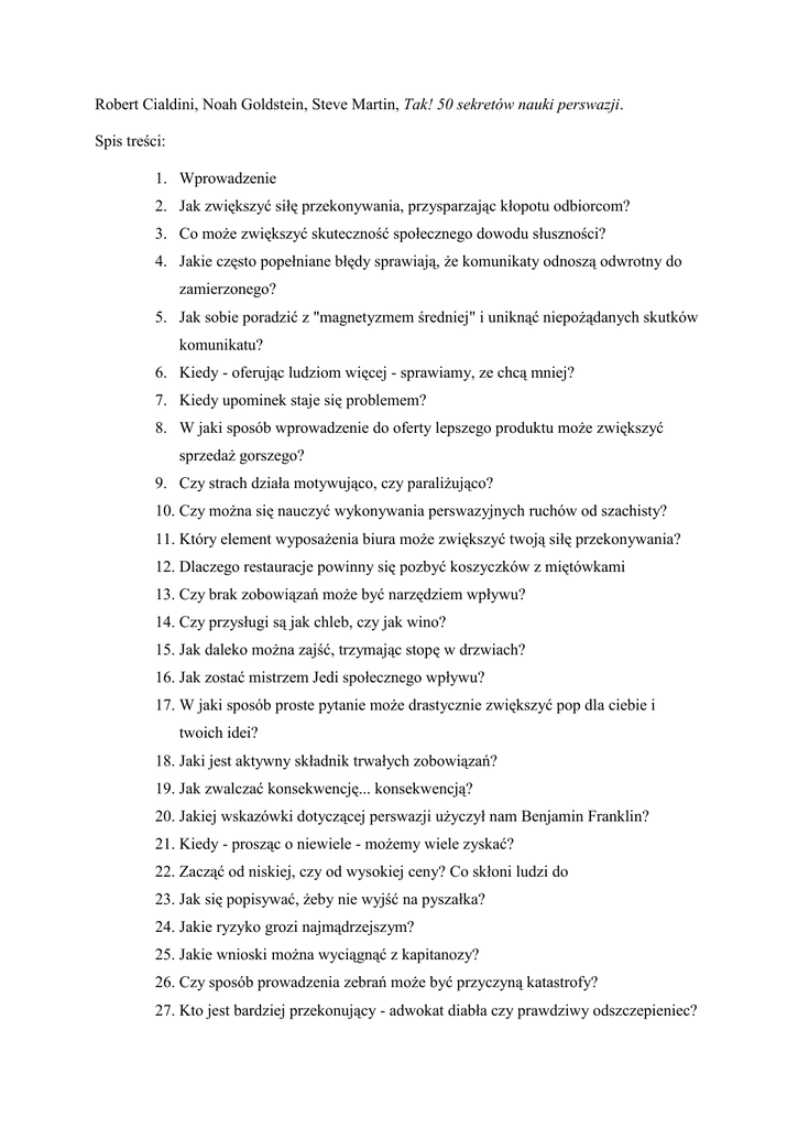 Robert Cialdini, Noah Goldstein, Steve Martin, Tak! 50 sekretów nauki perswazji. Spis treści: 1. Wprowadzenie 2. Jak zwiększyć siłę przekonywania, przysparzając kłopotu odbiorcom? 3. Co może zwiększyć skuteczność społecznego dowodu słuszności? 4. Jakie często popełniane błędy sprawiają, że komunikaty odnoszą odwrotny do zamierzonego? 5. Jak sobie poradzić z "magnetyzmem średniej" i uniknąć niepożądanych skutków komunikatu? 6. Kiedy - oferując ludziom więcej - sprawiamy, ze chcą mniej? 7. Kiedy upominek staje się problemem? 8. W jaki sposób wprowadzenie do oferty lepszego produktu może zwiększyć sprzedaż gorszego? 9. Czy strach działa motywująco, czy paraliżująco? 10. Czy można się nauczyć wykonywania perswazyjnych ruchów od szachisty? 11. Który element wyposażenia biura może zwiększyć twoją siłę przekonywania? 12. Dlaczego restauracje powinny się pozbyć koszyczków z miętówkami 13. Czy brak zobowiązań może być narzędziem wpływu? 14. Czy przysługi są jak chleb, czy jak wino? 15. Jak daleko można zajść, trzymając stopę w drzwiach? 16. Jak zostać mistrzem Jedi społecznego wpływu? 17. W jaki sposób proste pytanie może drastycznie zwiększyć pop dla ciebie i twoich idei? 18. Jaki jest aktywny składnik trwałych zobowiązań? 19. Jak zwalczać konsekwencję... konsekwencją? 20. Jakiej wskazówki dotyczącej perswazji użyczył nam Benjamin Franklin? 21. Kiedy - prosząc o niewiele - możemy wiele zyskać? 22. Zacząć od niskiej, czy od wysokiej ceny? Co skłoni ludzi do 23. Jak się popisywać, żeby nie wyjść na pyszałka? 24. Jakie ryzyko grozi najmądrzejszym? 25. Jakie wnioski można wyciągnąć z kapitanozy? 26. Czy sposób prowadzenia zebrań może być przyczyną katastrofy? 27. Kto jest bardziej przekonujący - adwokat diabła czy prawdziwy odszczepieniec? 28. Kiedy dobry przykład może być złym przykładem? 29. Jak przekształcić wadę w zaletę? 30. Które wady mogą zjednać nam sympatię ludzi? 31. Kiedy warto się przyznać do błędu? 32. Kiedy należy się cieszyć z awarii serwera? 33. Czy podobieństwa mogą być źródłem różnic (w traktowaniu)? 34. Jak imię wpływa na twoje życie? 35. Czego możemy się nauczyć od kelnerów? 36. Jaki uśmiech może sprawić, że świat uśmiechnie się do ciebie? 37. Jakie wnioski dotyczące perswazji wynikają z gromadzenia pamiątek? 38. Jakie korzyści można wyciągnąć ze straty? 39. Jakie słowo może zwiększyć twoją siłę przekonywania? 40. Kiedy podawanie zbyt wielu powodów może być błędem? 41. W jaki sposób prostota nazwy może zwiększać jej atrakcyjność? 42. Czy rym może zwiększyć twoją siłę przekonywania? 43. Czy można się nauczyć perswazji podczas treningu baseballowego? 44. Jak uzyskać przewagę w walce o lojalność klientów? 45. Czego możemy się dowiedzieć o perswazji, oglądając pudełko kredek? 46. Jak przekazywać komunikaty, by na długo zapadały w pamięć? 47. Jaki przedmiot może odzwierciedlać wartości wyznawane przez ludzi? 48. Czy smutek może wpływać na wynik negocjacji? 49. Czy emocje mają wpływ na siłę przekonywania? 50. Co może sprawić, że ludzie uwierzą we wszystko, co przeczytają? 51. Czy trimetyloksantyna zwiększa siłę przekonywania? 52. Wywieranie wpływu w XXI wieku 53. Etyczne wywieranie wpływu 54. Wywieranie wpływu w działaniu Łączny czas nagrania: 06:12:10