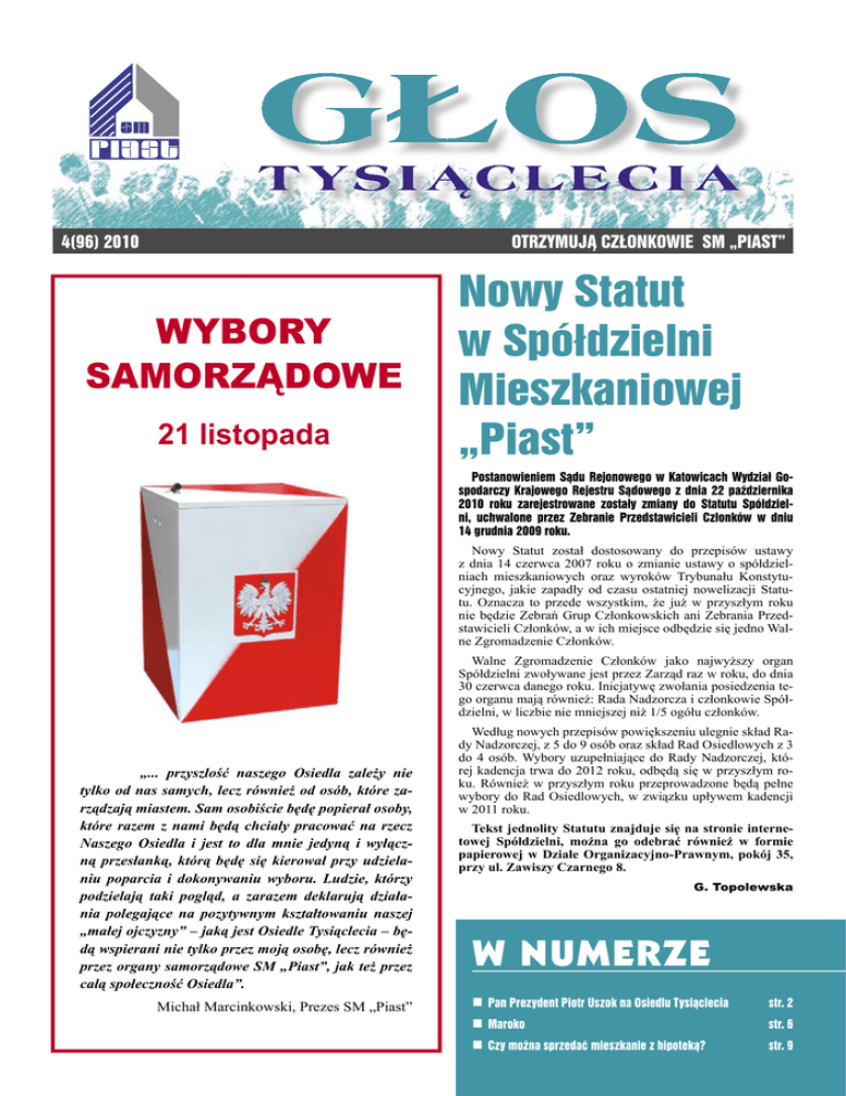 GŁOS T Y S I ĄC L E C I A 4 (85) 2008 4(96) 2010 OTRZYMUJĄ CZŁONKOWIE SM „PIAST” WYBORY SAMORZĄDOWE 21 listopada Nowy Statut w Spółdzielni Mieszkaniowej „Piast” Postanowieniem Sądu Rejonowego w Katowicach Wydział Gospodarczy Krajowego Rejestru Sądowego z dnia 22 października 2010 roku zarejestrowane zostały zmiany do Statutu Spółdzielni, uchwalone przez Zebranie Przedstawicieli Członków w dniu 14 grudnia 2009 roku. Nowy Statut został dostosowany do przepisów ustawy z dnia 14 czerwca 2007 roku o zmianie ustawy o spółdzielniach mieszkaniowych oraz wyroków Trybunału Konstytucyjnego, jakie zapadły od czasu ostatniej nowelizacji Statutu. Oznacza to przede wszystkim, że już w przyszłym roku nie będzie Zebrań Grup Członkowskich ani Zebrania Przedstawicieli Członków, a w ich miejsce odbędzie się jedno Walne Zgromadzenie Członków. Walne Zgromadzenie Członków jako najwyższy organ Spółdzielni zwoływane jest przez Zarząd raz w roku, do dnia 30 czerwca danego roku. Inicjatywę zwołania posiedzenia tego organu mają również: Rada Nadzorcza i członkowie Spółdzielni, w liczbie nie mniejszej niż 1/5 ogółu członków. „... przyszłość naszego Osiedla zależy nie tylko od nas samych, lecz również od osób, które zarządzają miastem. Sam osobiście będę popierał osoby, które razem z nami będą chciały pracować na rzecz Naszego Osiedla i jest to dla mnie jedyną i wyłączną przesłanką, którą będę się kierował przy udzielaniu poparcia i dokonywaniu wyboru. Ludzie, którzy podzielają taki pogląd, a zarazem deklarują działania polegające na pozytywnym kształtowaniu naszej „małej ojczyzny” – jaką jest Osiedle Tysiąclecia – będą wspierani nie tylko przez moją osobę, lecz również przez organy samorządowe SM „Piast”, jak też przez całą społeczność Osiedla”. Michał Marcinkowski, Prezes SM „Piast” Według nowych przepisów powiększeniu ulegnie skład Rady Nadzorczej, z 5 do 9 osób oraz skład Rad Osiedlowych z 3 do 4 osób. Wybory uzupełniające do Rady Nadzorczej, której kadencja trwa do 2012 roku, odbędą się w przyszłym roku. Również w przyszłym roku przeprowadzone będą pełne wybory do Rad Osiedlowych, w związku upływem kadencji w 2011 roku. Tekst jednolity Statutu znajduje się na stronie internetowej Spółdzielni, można go odebrać również w formie papierowej w Dziale Organizacyjno-Prawnym, pokój 35, przy ul. Zawiszy Czarnego 8. G. Topolewska W NUMERZE Pan Prezydent Piotr Uszok na Osiedlu Tysiąclecia str. 2 Maroko str. 6 Czy można sprzedać mieszkanie z hipoteką? str. 9 Nr 4 (96) 2010 listopad 2010 Pan Prezydent Piotr Uszok na Osiedlu Tysiąclecia W dniu 28 października br. odbyło się spotkanie Prezydenta miasta Katowice pana Piotra Uszoka z przedstawicielami organów samorządowych i zarządu Spółdzielni Mieszkaniowej „Piast”. W spotkaniu udział wzięli również przedstawiciele Policji i Straży Miejskiej. Zebranych przywitał Prezes SM „Piast” pan Michał Marcinkowski prosząc o zabranie głosu pana Prezydenta Piotra Uszoka. W swoim wystąpieniu pan Prezydent przedstawił szereg projektów miejskich zrealizowanych i realizowanych w ramach tzw. Programu zrównoważonego rozwoju obejmującego wszystkie dzielnice miasta. Dzięki realizowanym inwestycjom zdaniem pana Prezydenta mieszkańcy mogą się realizować w nowych lub zmodernizowanych domach kultury, zyskali dostęp do szerszej oferty bibliotecznej, natomiast amatorzy sportu nie powinni mieć problemu ze znalezieniem obiektu spełniającego ich potrzeby. Zrealizowano m.in. budowę nowych budynków mieszkalnych – osiedle komunalne przy ul. Techników, a przy ul. Sławika kompleks budynków zarządzanych przez spółkę KTBS. Podejmowano działania na rzecz bezpieczeństwa mieszkańców w poszczególnych dzielnicach – powstały nowe komisariaty policji na os. Tysiąclecia i w Szopienicach. Realizowane będą projekty przebudowy centrum miasta. Katowice znalazły się w grupie miast, które przeszły do ścisłego finału konkursu o tytuł Europejskiej Stolicy Kultury w 2016 roku. Zmodernizowano i wybudowano szereg dróg na terenie miasta, inne są i będą modernizowane i przebudowywane. Olbrzymim przedsięwzięciem inwestycyjnym jest realizacja przebudowy kanalizacji w mieście. (Wszystkim przedstawianym tematom towarzyszyła odpowiednia wizualizacja). Zebrani mieszkańcy w swoich wystąpieniach zwracali uwagę, że najbardziej są zainteresowani jakością życia w miejscu zamieszkania (tj. na Osiedlu Tysiąclecia). Prezydent podziękował Prezesowi za bardzo dobrą współpracę miasta i spółdzielni, jednocześnie podkreślił bardzo dużą rolę spółdzielni w pracy na rzecz poprawy jakości życia mieszkańców osiedla i aktywną obronę ich interesów. Zgłoszono problem małej ilości miejsc parkingowych na osiedlu, nie zrealizowano wcześniejszych obietnic, m.in.: zabudowę ekranów akustycznych, które miały łagodzić skutki hałasu, szczególnie mieszkańców najbliżej usytuowanych budynków wzdłuż ul. Chorzowskiej; utwardzenie i przebudowę istniejącego parkingu przy budynku Tysiąclecia 90; remont i modernizację odcinka ulicy Tysiąclecia, dojazd do budynków 88 i 90. zaniedbane tereny nie będące własnością SM „Piast” rzutujące negatywnie na estetykę całego osiedla. Kończąc spotkanie Prezes Spółdzielni pan Michał Marcinkowski podkreślił bardzo dobrą dotychczasową współpracę z Panem Prezydentem i Urzędem Miasta, m.in. w zakresie przejmowania terenów, budowy bezpiecznych placów zabaw, obiektów sportowych i za to wszystko podziękował Panu Prezydentowi oraz pracownikom Urzędu Miasta. Ryszard Dąbrowiecki Reklama: * g587 GŁOS TYSIĄCLECIA listopad 2010 Nr 4 (96) 2010 Wywiad z Panem Prezydentem Piotrem Uszokiem Z Piotrem Uszokiem, Prezydentem Miasta Katowice, rozmawia Maciej Stachura, „Głos Tysiąclecia” M.S.: Panie Prezydencie, na początku p