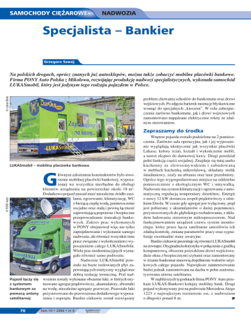 SAMOCHODY CIʯAROWE NADWOZIA Specjalista – Bankier Grzegorz Szwej © Lukas Bank Na polskich drogach, oprócz znanych już autosklepów, można także zobaczyć mobilne placówki bankowe. Firma PONY Auto Polska z Mikołowa, rozwijając produkcję nadwozi specjalistycznych, wykonała samochód LUKASmobil, który jest jedynym tego rodzaju pojazdem w Polsce. problem chowania schodów do bankomatu oraz drzwi wejściowych. Po zdjęciu barierek można je błyskawiczne wsunąć do specjalnych „kieszeni”. W celu zabezpie− czenia zarówno bankomatu, jak i drzwi wejściowych zamontowano napędzane elektrycznie rolety ze zdal− nym sterowaniem. Zapraszamy do œrodka LUKASmobil – mobilna placówka bankowa © PONY Auto G łównym założeniem konstruktorów było stwo− rzenie mobilnej placówki bankowej, wyposa− żonej we wszystkie niezbędne do obsługi klientów urządzenia na powierzchni około 18 m2. Dodatkowo pojazd musiał mieć niezależne źródło zasi− lania, ogrzewanie, klimatyzację, WC z bieżącą ciepłą wodą, pomieszczenie socjalne oraz stałą i pewną łączność zapewniającą poprawne i bezpieczne przeprowadzanie transakcji banko− wych. Zakres prac wykonanych w PONY obejmował więc nie tylko zaprojektowanie i wykonanie samego nadwozia, ale również wszystkie inne prace związane z wykończeniem i wy− posażeniem całego LUKASmobila. Wielu prac modernizacyjnych wyma− gało również samo podwozie. Nadwozie LUKASmobil pow− stało na bazie izolowanych płyt za− pewniających estetyczny wygląd oraz dobrą izolację termiczną. Pod nad− Pojazd ³¹czy siê woziem zostały wykonane obszerne luki, w których usy− z systemem tuowano agregat prądotwórczy, akumulatory, zbiorniki bankowym za na wodę, niezależne agregaty grzewcze. Pozostałe luki pomoc¹ anteny przystosowano do przewożenia dodatkowego wyposa− satelitarnej żenia i osprzętu. Bardzo ciekawie został rozwiązany 70 tom 10 • 2006 • nr 6 Wnętrze pojazdu zostało podzielone na 2 pomiesz− czenia. Zarówno sala operacyjna, jak i jej wyposaże− nie wyglądają identycznie jak wszystkie placówki Lukasa: kolory ścian, kształt i wykończenie mebli, a nawet ekspres do darmowej kawy. Drugi przedział pełni funkcję części socjalnej. Znajduje się tutaj aneks kuchenny ze zlewozmywakiem i zabudowaną w meblach kuchenką mikrofalową, składany stolik śniadaniowy, szafy na ubrania oraz inne przedmioty. Oprócz tego wygospodarowano miejsce na oddzielne pomieszczenie z ekologicznym WC i umywalką. Nadwozie ma system klimatyzacji i ogrzewania z auto− matyczną regulacją temperatury dzień/noc. Energii o mocy 12 kW dostarcza zespół prądotwórczy z silni− kiem Diesla. W czasie gdy agregat jest wyłączony, prąd jest pobierany z akumulatorów o dużej pojemności, przystosowanych do głębokiego rozładowania, z ukła− dem ładowania sterownym mikroprocesorem. Nad funkcjonowaniem urządzeń czuwa system monito− ringu, który przez łącza satelitarne umożliwia ich zdalną kontrolę, zmianę parametrów pracy oraz sygna− lizuje ewentualne stany awaryjne. Bardzo ciekawie prezentuje się również LUKASmobil na zewnątrz. Oryginalna kolorystyka wpołączeniu z grafiką komputerową, obszerne przeszklone drzwi wejściowe, duże okna z bezpiecznymi szybami oraz zamontowany w ścianie bankomat stanowią dopełnienie walorów użyt− kowych całego pojazdu. Największe zainteresowanie budzi jednak zamontowana na dachu w pełni zautoma− tyzowana antena satelitarna. W najbliższych tygodniach firma PONY Auto prze− każe LUKAS−Bankowi kolejny mobilny bank. Drugi pojazd wykonywany jest na podwoziu Mercedesa Atego 1223 z największym rozstawem osi, z nadwoziem o długości ponad 8 m.