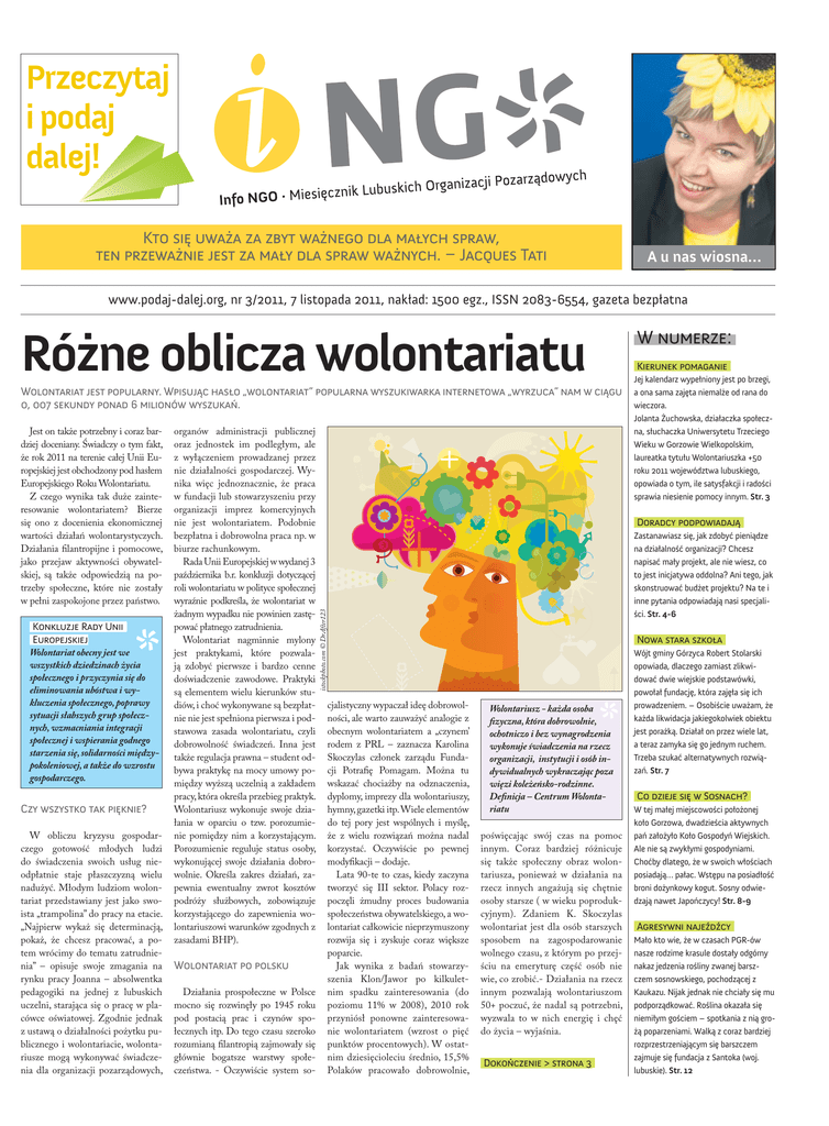 Przeczytaj i podaj dalej! Kto się uważa za zbyt ważnego dla małych spraw, ten przeważnie jest za mały dla spraw ważnych. – Jacques Tati A u nas wiosna… www.podaj-dalej.org, nr 3/2011, 7 listopada 2011, nakład: 1500 egz., ISSN 2083-6554, gazeta bezpłatna Różne oblicza wolontariatu Wolontariat jest popularny. Wpisując hasło „wolontariat” popularna wyszukiwarka internetowa „wyrzuca” nam w ciągu 0, 007 sekundy ponad 6 milionów wyszukań. Konkluzje Rady Unii Europejskiej Wolontariat obecny jest we wszystkich dziedzinach życia społecznego i przyczynia się do eliminowania ubóstwa i wykluczenia społecznego, poprawy sytuacji słabszych grup społecznych, wzmacniania integracji społecznej i wspierania godnego starzenia się, solidarności międzypokoleniowej, a także do wzrostu gospodarczego. Czy wszystko tak pięknie? W obliczu kryzysu gospodarczego gotowość młodych ludzi do świadczenia swoich usług nieodpłatnie staje płaszczyzną wielu nadużyć. Młodym ludziom wolontariat przedstawiany jest jako swoista „trampolina” do pracy na etacie. „Najpierw wykaż się determinacją, pokaż, że chcesz pracować, a potem wrócimy do tematu zatrudnienia” – opisuje swoje zmagania na rynku pracy Joanna – absolwentka pedagogiki na jednej z lubuskich uczelni, starająca się o pracę w placówce oświatowej. Zgodnie jednak z ustawą o działalności pożytku publicznego i wolontariacie, wolontariusze mogą wykonywać świadczenia dla organizacji pozarządowych, organów administracji publicznej oraz jednostek im podległym, ale z wyłączeniem prowadzanej przez nie działalności gospodarczej. Wynika więc jednoznacznie, że praca w fundacji lub stowarzyszeniu przy organizacji imprez komercyjnych nie jest wolontariatem. Podobnie bezpłatna i dobrowolna praca np. w biurze rachunkowym. Rada Unii Europejskiej w wydanej 3 października b.r. konkluzji dotyczącej roli wolontariatu w polityce społecznej wyraźnie podkreśla, że wolontariat w żadnym wypadku nie powinien zastępować płatnego zatrudnienia. Wolontariat nagminnie mylony jest praktykami, które pozwalają zdobyć pierwsze i bardzo cenne doświadczenie zawodowe. Praktyki są elementem wielu kierunków studiów, i choć wykonywane są bezpłatnie nie jest spełniona pierwsza i podstawowa zasada wolontariatu, czyli dobrowolność świadczeń. Inna jest także regulacja prawna – student odbywa praktykę na mocy umowy pomiędzy wyższą uczelnią a zakładem pracy, która określa przebieg praktyk. Wolontariusz wykonuje swoje działania w oparciu o tzw. porozumienie pomiędzy nim a korzystającym. Porozumienie reguluje status osoby, wykonującej swoje działania dobrowolnie. Określa zakres działań, zapewnia ewentualny zwrot kosztów podróży służbowych, zobowiązuje korzystającego do zapewnienia wolontariuszowi warunków zgodnych z zasadami BHP). Wolontariat po polsku Działania prospołeczne w Polsce mocno się rozwinęły po 1945 roku pod postacią prac i czynów społecznych itp. Do tego czasu szeroko rozumianą filantropią zajmowały się głównie bogatsze warstwy społeczeństwa. - Oczywiście system so- Kierunek pomaganie Jej kalendarz wypełniony jest po brzegi, a ona sama zajęta niemalże od rana do wieczora. Jolanta Żuchowska, działaczka społeczna, słuchaczka Uniwersytetu Trzeciego Wieku w Gorzowie Wielkopolskim, laureatka tytułu Wolontariuszka +50 roku 2011 województwa lubuskiego, opowiada o tym, ile satysfakcji i radości sprawia niesienie pomocy innym. Str. 3 Doradcy podpowiadają Zastanawiasz się, jak zdobyć pieniądze na działalność organizacji? Chcesz napisać mały projekt, ale nie wiesz, co to jest inicjatywa oddolna? Ani tego, jak skonstruować budżet projektu? Na te i inne pytania odpowiadają nasi specjaliści. Str. 4-6 istockphoto.com © DrAfter123 Jest on także potrzebny i coraz bardziej doceniany. Świadczy o tym fakt, że rok 2011 na terenie całej Unii Europejskiej jest obchodzony pod hasłem Europejskiego Roku Wolontariatu. Z czego wynika tak duże zainteresowanie wolontariatem? Bierze się ono z docenienia ekonomicznej wartości działań wolontarystyczych. Działania filantropijne i pomocowe, jako przejaw aktywności obywatelskiej, są także odpowiedzią na potrzeby społeczne, które nie zostały w pełni zaspokojone przez państwo. W numerze: cjalistyczny wypaczał ideę dobrowolności, ale warto zauważyć analogie z obecnym wolontariatem a „czynem’ rodem z PRL – zaznacza Karolina Skoczylas członek zarządu Fundacji Potrafię Pomagam. Można tu wskazać chociażby na odznaczenia, dyplomy, imprezy dla wolontariuszy, hymny, gazetki itp. Wiele elementów do tej pory jest wspólnych i myślę, że z wielu rozwiązań można nadal korzystać. Oczywiście po pewnej modyfikacji – dodaje. Lata 90-te to czas, kiedy zaczyna tworzyć się III sektor. Polacy rozpoczęli żmudny proces budowania społeczeństwa obywatelskiego, a wolontariat całkowicie nieprzymuszony rozwija się i zyskuje coraz większe poparcie. Jak wynika z badań stowarzyszenia Klon/Jawor po kilkuletnim spadku zainteresowania (do poziomu 11% w 2008), 2010 rok przyniósł ponowne zainteresowanie wolontariatem (wzrost o pięć punktów procentowych). W ostatnim dziesięcioleciu średnio, 15,5% Polaków pracowało dobrowolnie, Nowa stara szkoła Wolontariusz - każda osoba fizyczna, która dobrowolnie, ochotniczo i bez wynagrodzenia wykonuje świadczenia na rzecz organizacji, instytucji i osób indywidualnych wykraczając poza więzi koleżeńsko-rodzinne. Definicja – Centrum Wolontariatu poświęcając swój czas na pomoc innym. Coraz bardziej różnicuje się także społeczny obraz wolontariusza, ponieważ w działania na rzecz innych angażują się chętnie osoby starsze ( w wieku poprodukcyjnym). Zdaniem K. Skoczylas wolontariat jest dla osób starszych sposobem na zagospodarowanie wolnego czasu, z którym po przejściu na emeryturę część osób nie wie, co zrobić.- Dzia