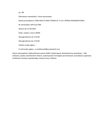 Lp.: 89. Oferowane stanowisko: Trener personalny Nazwa pracodawcy: PURE HEALTH AND FITNESS SP. Z O.O. SPÓŁKA KOMANDYTOWA Nr stanowiska: StPr/12/1780 Ważna od: 21.06.2012 Godz. rozpocz. pracy: 08:00 Wynagrodzenie od: 375,00 Wynagrodzenie do: 375,00 Telefon osoby zgłasz.: E-mail osoby zgłasz.: [email protected] Zakres obowiązków: Wykształcenie wyższe (AWF, fizjoterapia); doświadczenie zawodowe - mile widziane; opieka nad klientem siłowni, wykonywanie treningów personalnych; pracodawca zapewnia możliwość rozwoju zawodowego; miejsce pracy: Gliwice;