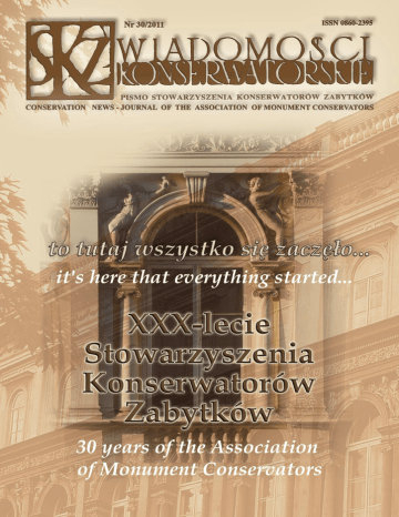 Nr 30/2011 ISSN 0860-2395 PISMO STOWARZYSZENIA KONSERWATORÓW ZABYTKÓW Pismo Stowarzyszenia Konserwatorów Zabytków Journal of the Association of Monument Conservators WIADOMOŚCI KONSERWATORSKIE • CONSERVATION NEWS nr 30/2011 Rada Programowa Programme Board Prof. dr hab. inż. Jerzy Jasieńko – przewodniczący Dr inż. Lech J. Engel Dr inż. arch. Marcin Gawlicki Dr inż. Mariusz Jackiewicz Prof. zw. dr hab. inż. arch. Andrzej Kadłuczka Prof. Andrzej Koss Prof. zw. dr hab. inż. arch. Kazimierz Kuśnierz Dr hab. inż. Jadwiga Łukaszewicz, Prof. nzw. UMK Dr inż. Zygmunt Matkowski Prof. dr hab. inż. Czesław Miedziałowski Mgr inż. Piotr Napierała Dr hab. inż. Piotr Rapp Mgr Jacek Rulewicz Redaktor Naczelny Editor in Chief Prof. zw. dr hab. inż. arch. Kazimierz Kuśnierz Z-ca Redaktora Naczelnego Assistant Editor Mgr inż. arch. Maria Sarnik-Konieczny Sekretarze Redakcji Editorial Secretary Dr inż. arch. Marek Barański Dr inż. arch. Dominika Kuśnierz-Krupa Biuro Redakcji Editorial Office Dr Maria Stępińska 00-464 Warszawa, ul. Szwoleżerów 9 tel. 22-629-21-31, e-mail: [email protected] Projekt okładki Cover design Dr inż. arch. Dominika Kuśnierz-Krupa Mgr inż. arch. Michał Krupa Na okładce zamieszczono fragment elewacji Muzeum Etnograficznego w Warszawie Opracowanie graficzne i DTP: Graphic design and DTP Sławomir Pęczek, EDITUS www.editus.pl tel. 71-793-1500, 502 23-43-43 Redaktor techniczny Technical Editor Zdzisław Majewski Realizacja wydawnicza Publishing Dolnośląskie Wydawnictwo Edukacyjne 53-204 Wrocław, ul. Ojca Beyzyma 20/b tel./fax 71-363-26-85, 71-345-19-44 www.dwe.wroc.pl Wydawca Publisher Zarząd Główny Stowarzyszenia Konserwatorów Zabytków 00-464 Warszawa, ul. Szwoleżerów 9 tel. 22-621-54-77, fax 22-622-65-95 Nakład: 1000 egz. Edition 1000 copies Druk ukończono w 2011 r. Printed in 2011. Tłumaczenie Translation Mgr Violetta Marzec WIADOMOŚCI KONSERWATORSKIE 2011 dofinansowano ze środków Ministra Kultury i Dziedzictwa Narodowego – Narodowego Instytutu Dziedzictwa – jako współwydawcy CONSERVATION NEWS 2011 was subsidised by the Minister of Culture and National Heritage – the National Heritage Board – as co-publisher Prace o objętości do 20 stron A4 (tekst + streszczenie – 1/2 strony) należy składać w biurze redakcji (adres do korespondencji: ul. Norwida 1, 31-521 Kraków) w formie elektronicznej + 1 egz. drukowany. Zdjęcia w formie elektronicznej w formacie TIFF 300 dpi. Articles up to 20 pages A4 format (the text + a 1/2 page abstract) should be sent to the Editor office (Maling address: ul. Norwida 1, 31-521 Kraków) in the electronic form plus one printed copy. Pictures in the electronic form in the TIFF 300 dpi format. Wiadomości Konserwatorskie • Conservation News • 30/2011 3 Od redakcji From the Editor Oddajemy do rąk naszych Czytelników trzydziesty, jubileuszowy numer „Wiadomości Konserwatorskich”. Wydanie to zbiega się z 30. rocznicą powstania Stowarzyszenia Konserwatorów Zabytków. Temu jubileuszowi poświęcamy dużo miejsca, zapraszając kilku kolegów do napisania artykułów wspomnieniowych, które przypominają nam trudne początki Stowarzyszenia nakładające się na stan wojenny w Polsce. Zamieszczamy też zestawienia z życia i działalności Stowarzyszenia za ostatnie 10 lat, nawiązując do materiałów wydanych na dwudziestolecie SKZ. Niniejszy 30. numer WK oprócz treści jubileuszowych ma tradycyjne stałe kolumny. W kolumnie „Nauka” zamieszczamy kolejne artykuły recenzowane, które tematycznie obejmują szeroki obszar ochrony zabytków. Tegoroczna jesień obfituje w szereg ważnych wydarzeń związanych z ochroną zabytków. Niewątpliwie należy do nich „Karta Krakowska 2000 – dziesięć lat później”, Międzynarodowa Konferencja Konserwatorska, którą organizuje Instytut Historii Architektury i Konserwacji Zabytków Wydziału Architektury PK przy współpracy z Narodowym Instytutem Dziedzictwa oraz naszym Stowarzyszeniem (WK 29/2011, s. 139). Odnotować też należy Walny XI Zjazd Stowarzyszenia Konserwatorów Zabytków; Zgromadzenie Generalne ICOMOS w Paryżu oraz Walny Zjazd Polskiego Komitetu Narodowego ICOMOS. Wydarzenia te wytyczą programy działalności konserwatorskiej na następne lata w Polsce i na świecie. Nasze Stowarzyszenie późną jesienią będzie przygotowywać się do uczestnictwa w Międzynarodowych Targach Budownictwa BUDMA 2012 na poznańskich terenach targowych. SKZ przygotowuje dwie tematyczne sesje konferencyjne (wspólnie z Oddziałem Wielkopolskim SKZ), konkurs oraz stoisko informacyjne naszego Stowarzyszenia (więcej: www.skz.pl). Przygotowujemy też VIII Międzynarodową Konferencję SAHC 2012 (Structural Analysis of Historical Constructions), która odbędzie się w październiku 2012 w Hali Stulecia we Wrocławiu (zob. kolumna „Informacje”). Redakcja zaprasza czytelników do lektury WK. Życzymy też Państwu udanej jesieni 2011 w pracy zawodowej oraz składamy najlepsze życzenia świąteczne i noworoczne na 2012 rok. We would like to present to you the 30th jubilee issue of “Conservation News”. The publication coincides with the 30th anniversary of establishing the Association of Monument Conservators. We have devoted much space to the jubilee and invited our colleagues to write articles reminiscing the difficult beginnings of the Association, coinciding with the period of martial law in Poland. We have also enclosed lists from the life and activity of the Association for the last 10 years, alluding to the materials published for the 20th anniversary of the AMC. The current 30th issue of the CN besides the jubilee contents has its traditional columns. In the “Science” section we have published more reviewed articles which, thematically, refer to a wide range of monument protection issues. The autumn this year abounds in important events associated with the issue of monument protection, among them undoubtedly the “Kr